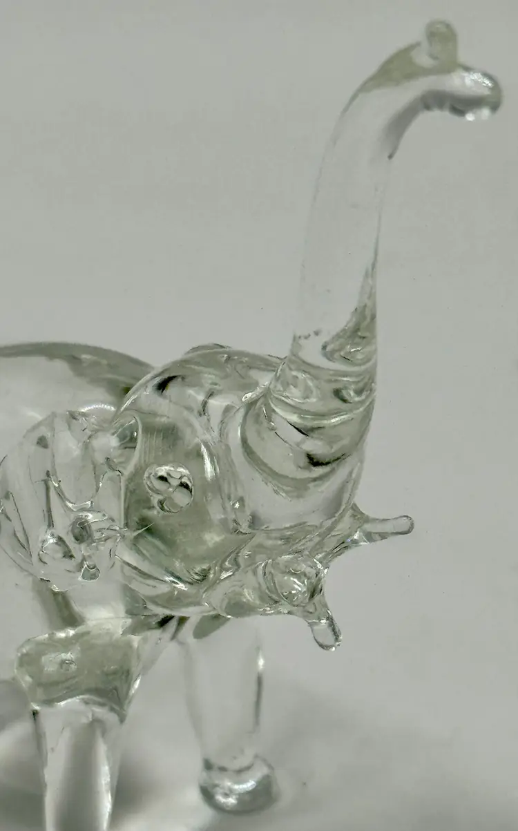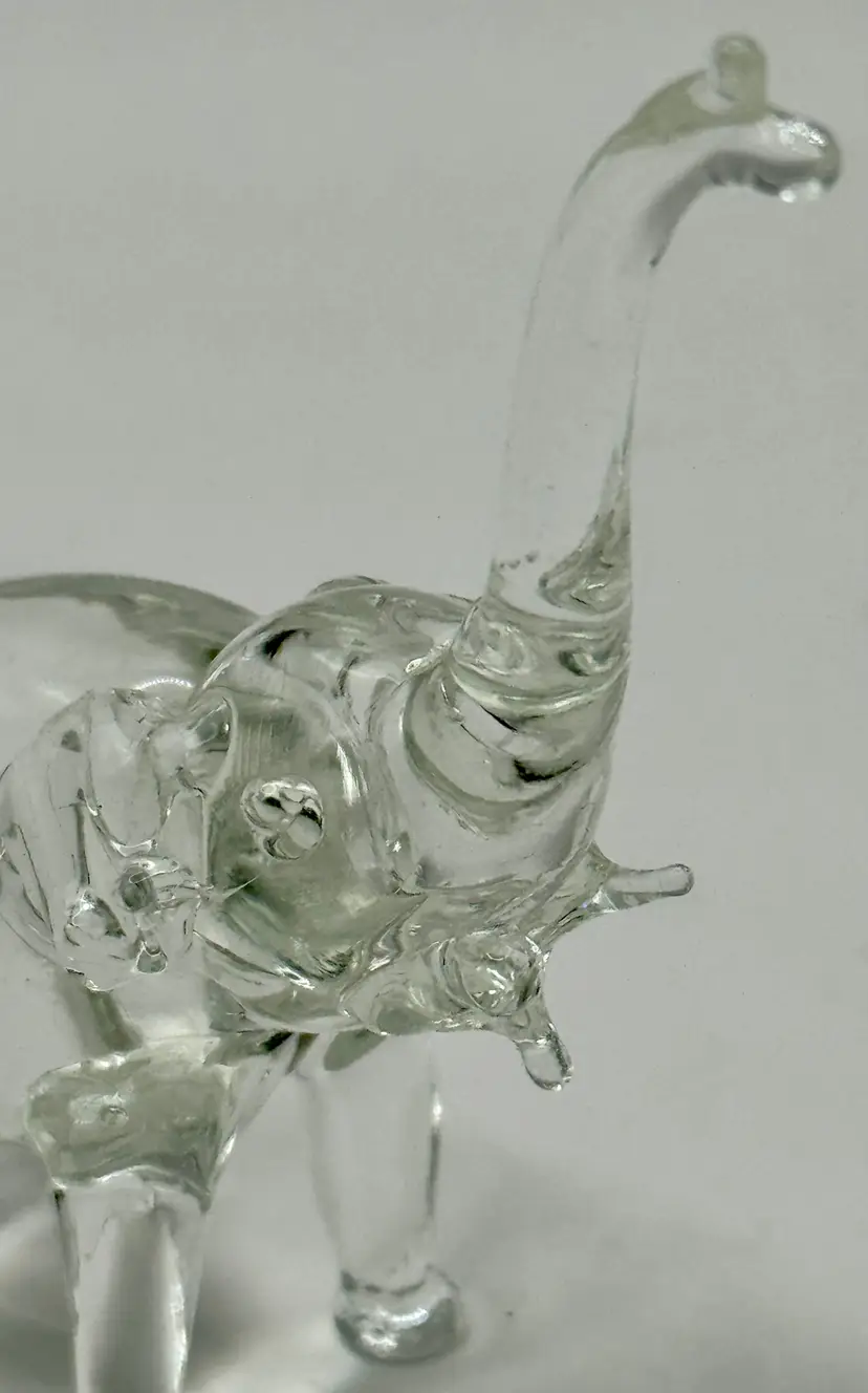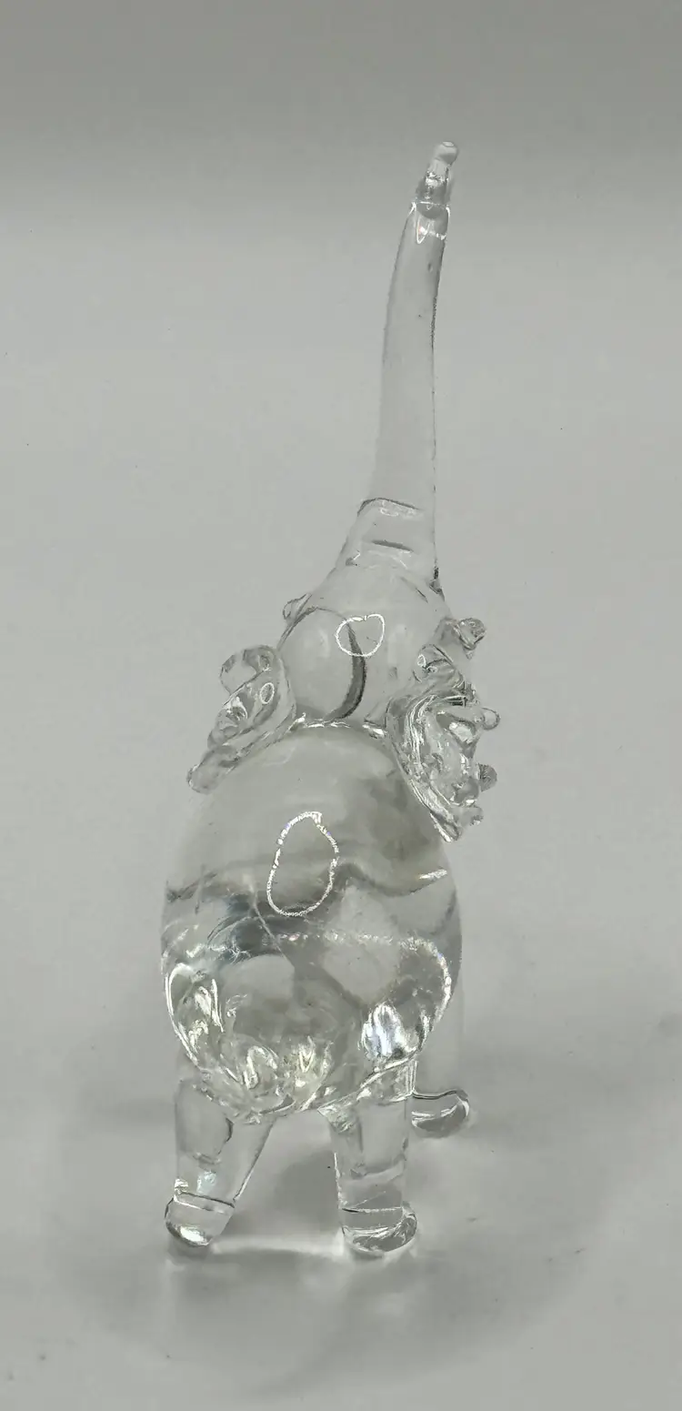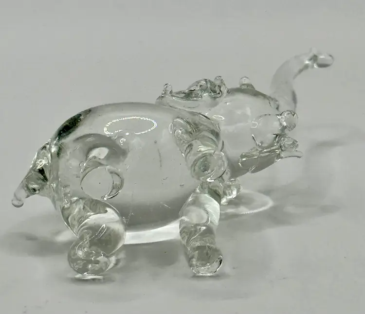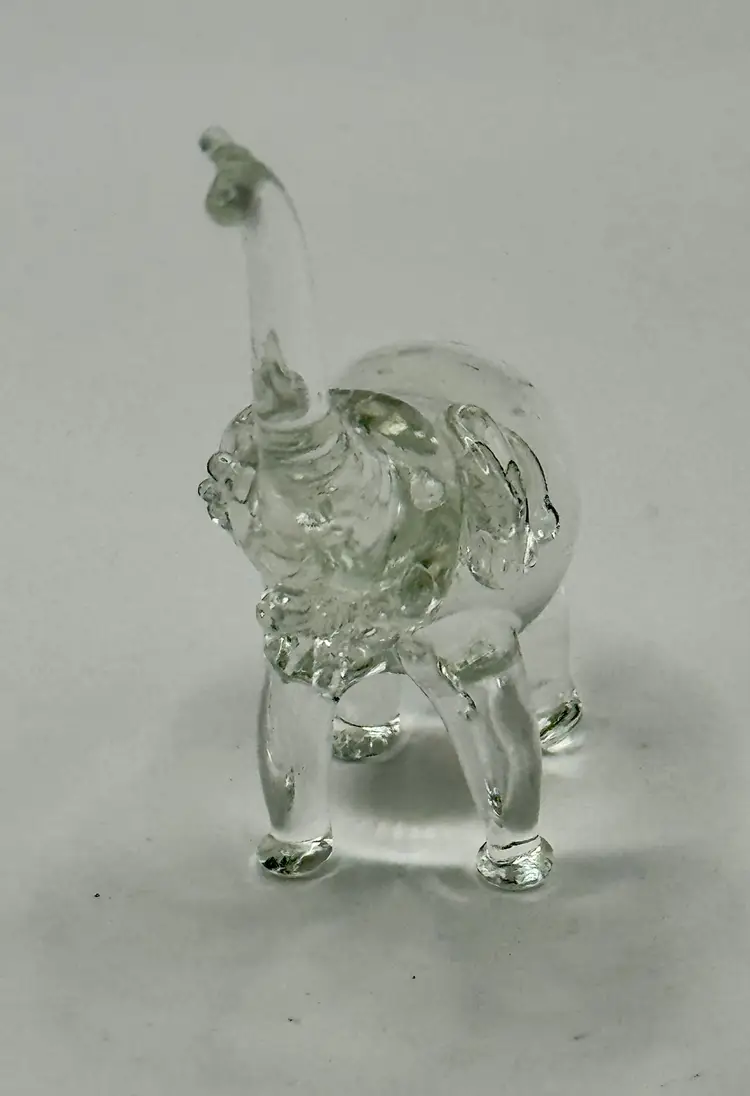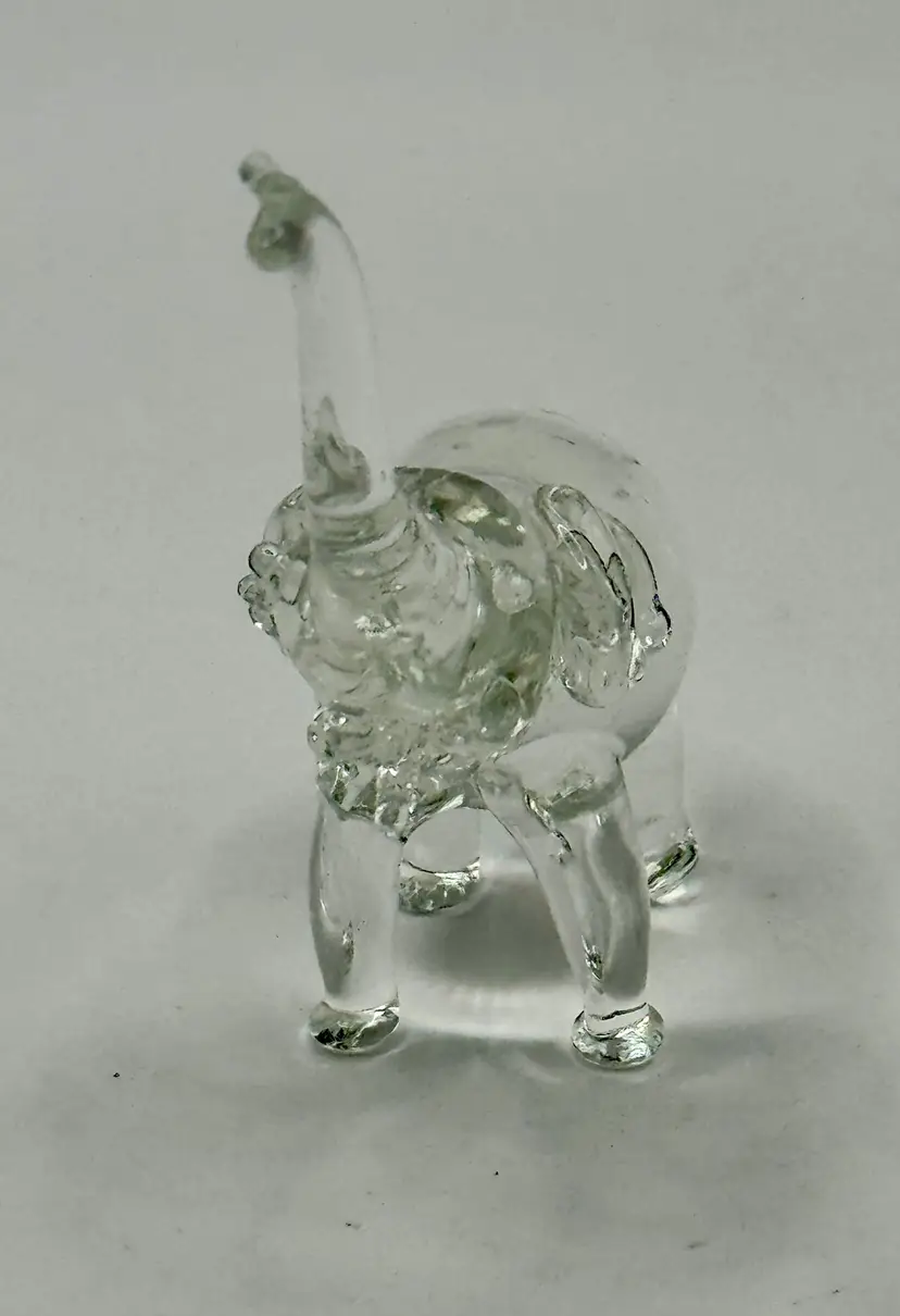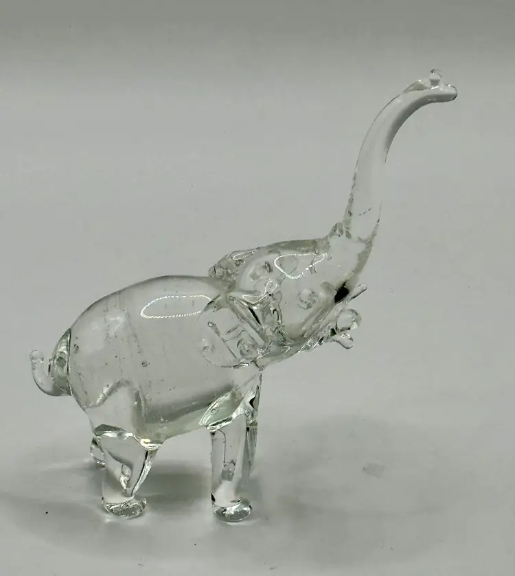 Charming vintage clear glass elephant figurine with its trunk raised for good luck. This delicate piece is a sweet addition to any collection or as a thoughtful gift for an elephant lover. No visible chips or cracks. A lovely find that brings a touch of whimsy to any space. Measures 3x3x1. Weighs 4oz.