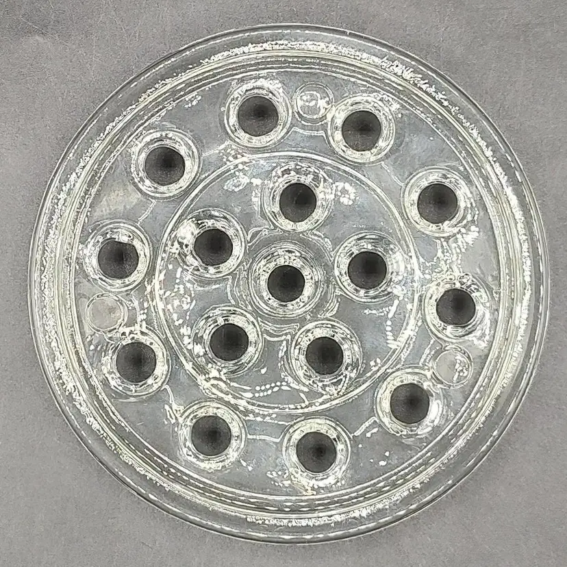 Vintage Clear Glass Flower Frog With 15 holes in good condition with no chips or cracks. Height 1. X diameter 5.5"