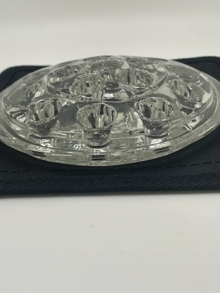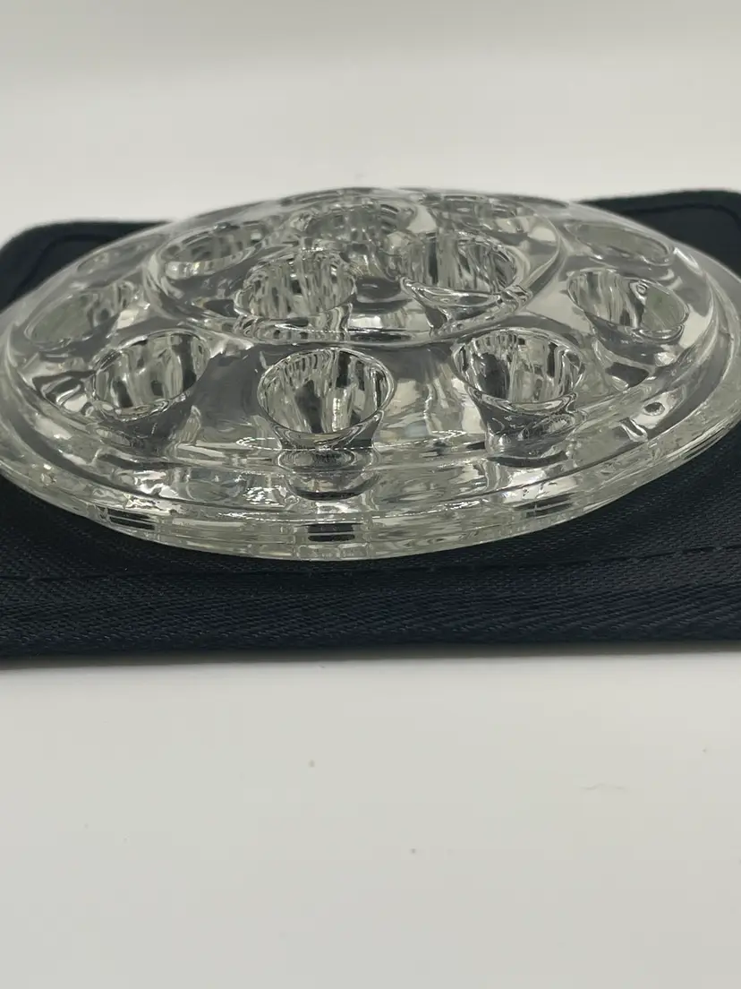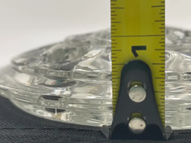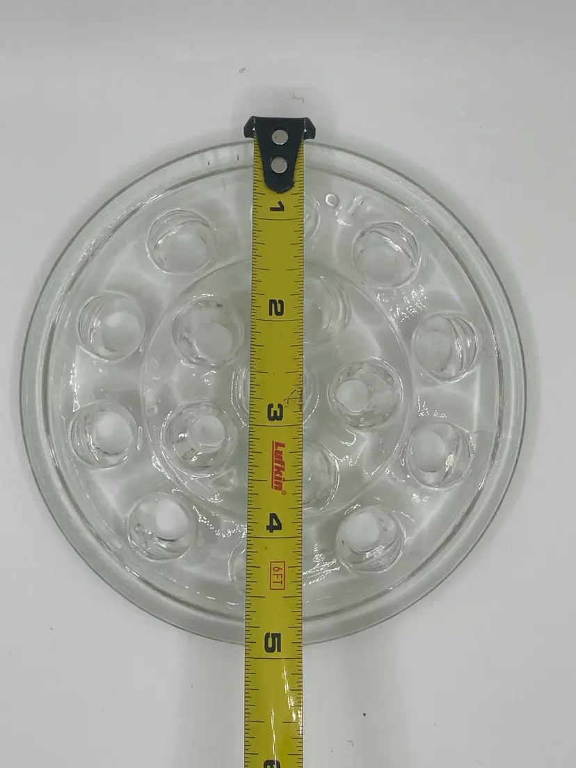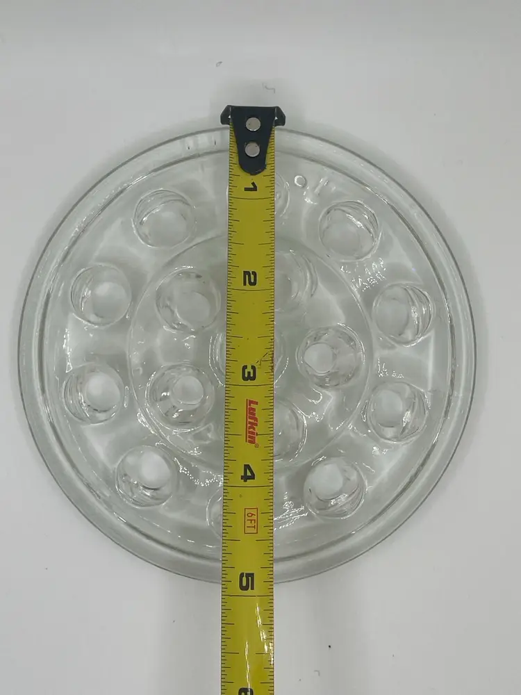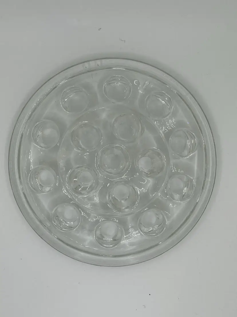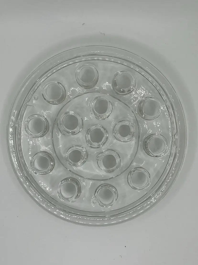 This vintage glass flower frog is perfect to use in a flower arrangement or as a decorative piece. It measures 5” in diameter, is about 1” tall in the middle and weighs 15oz. It is in good condition with no chips or cracks.