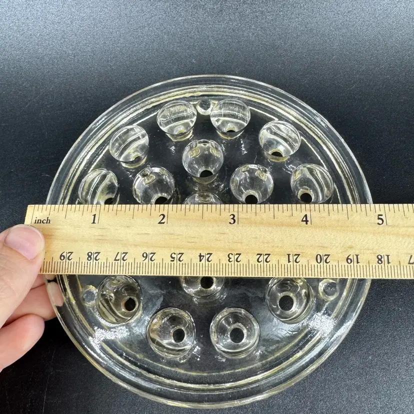 Width is approximately 5” Does have some chipping on the top and bottom Is not signed or marked