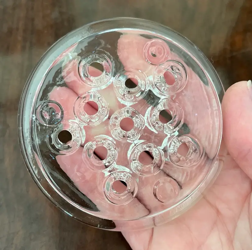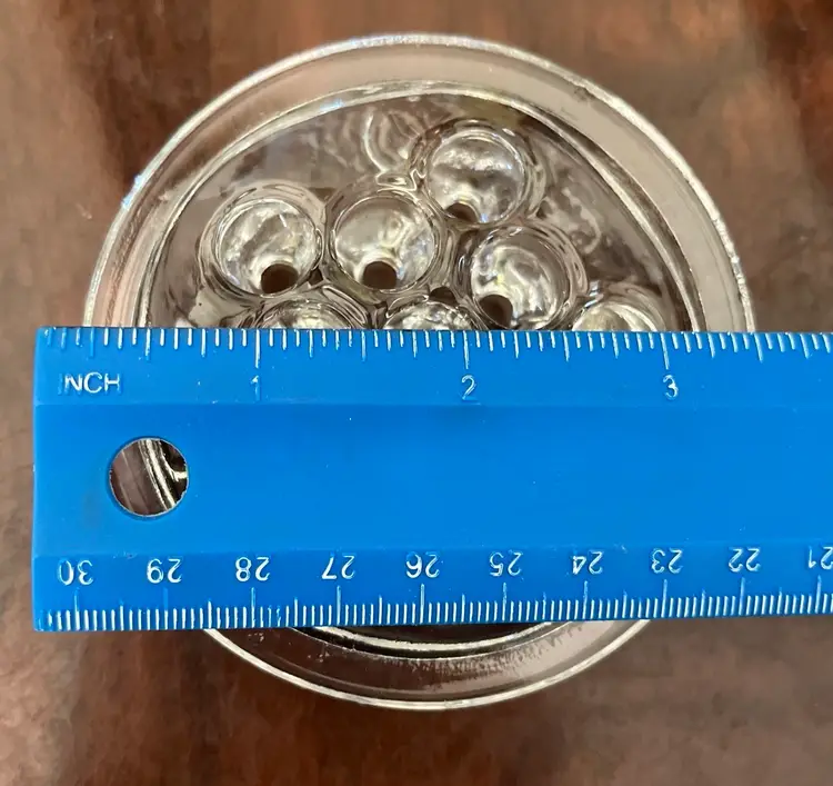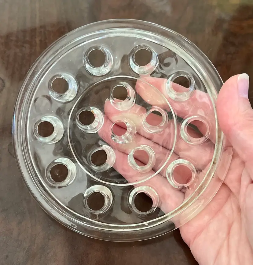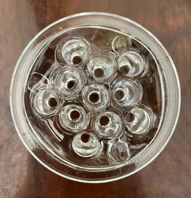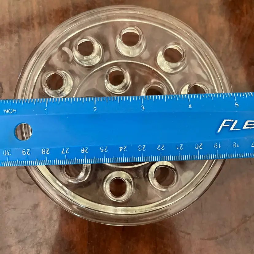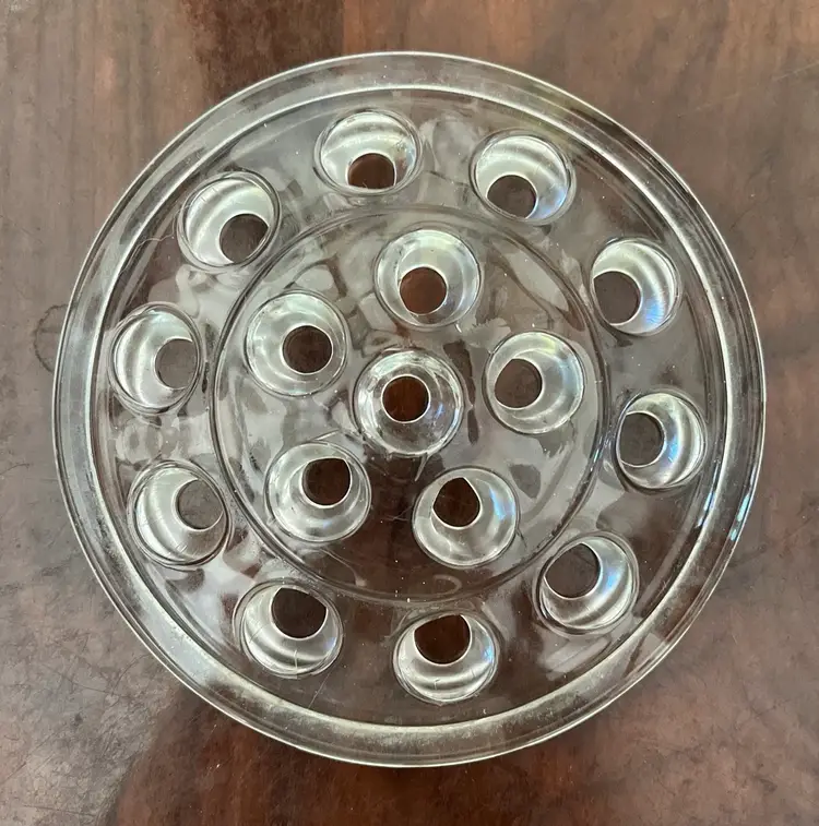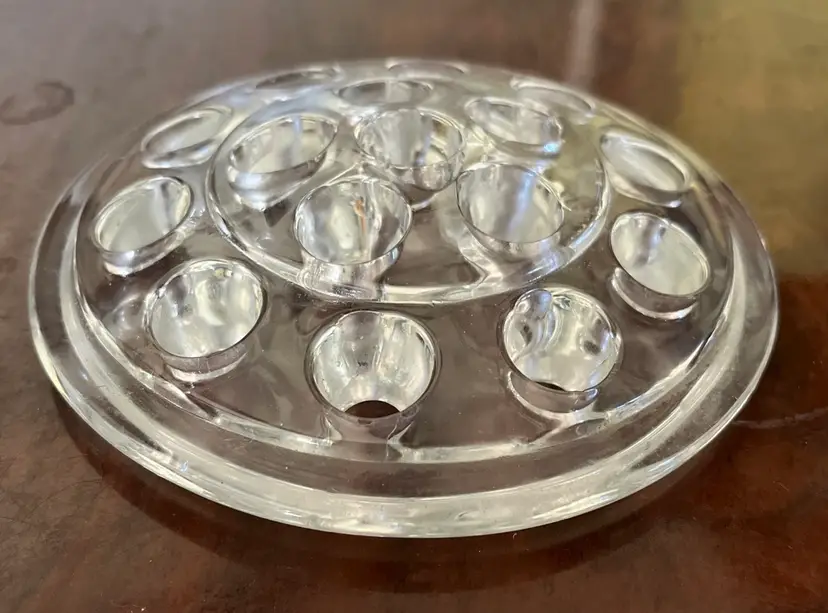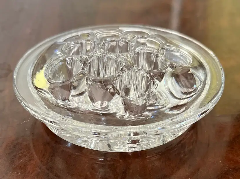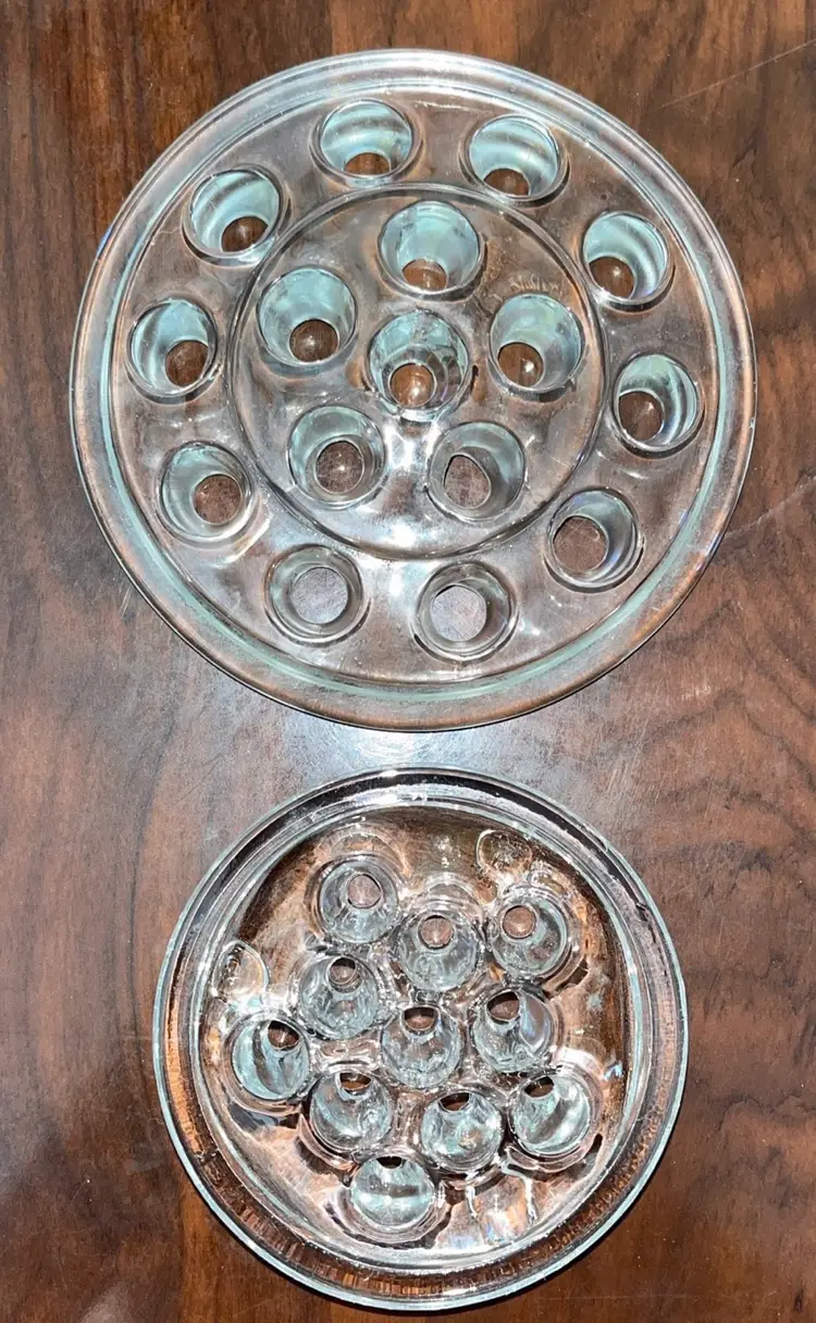 Lot of 2 vintage clear glass flower frogs - the larger one is approximately 5" in diameter with 16 holes and the smaller approximately 3.5" in diameter with 11 holes. The larger one is mostly flat on the bottom while the smaller one is raised. Pre-owned and in used condition. Expect normal wear. No chips or cracks found. See photos and ask any questions prior to purchase.
