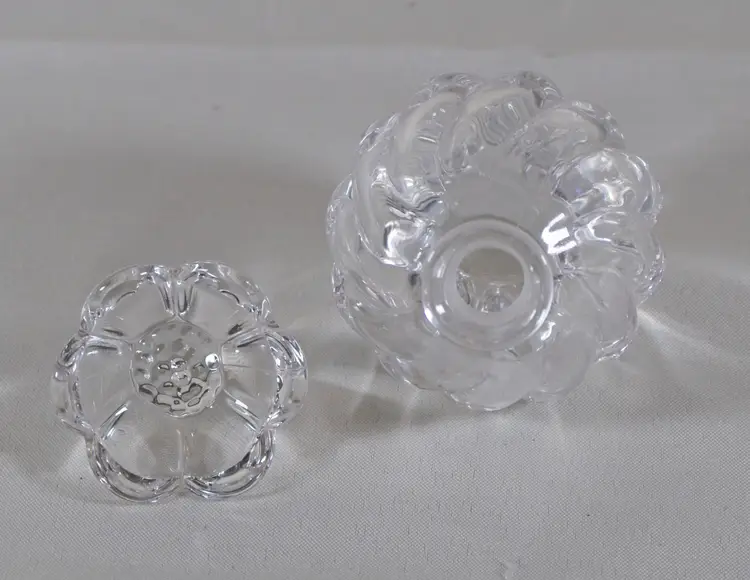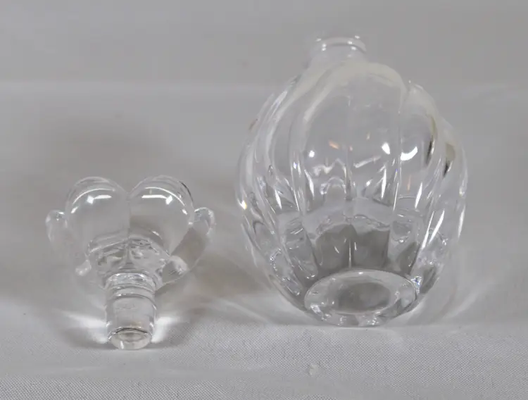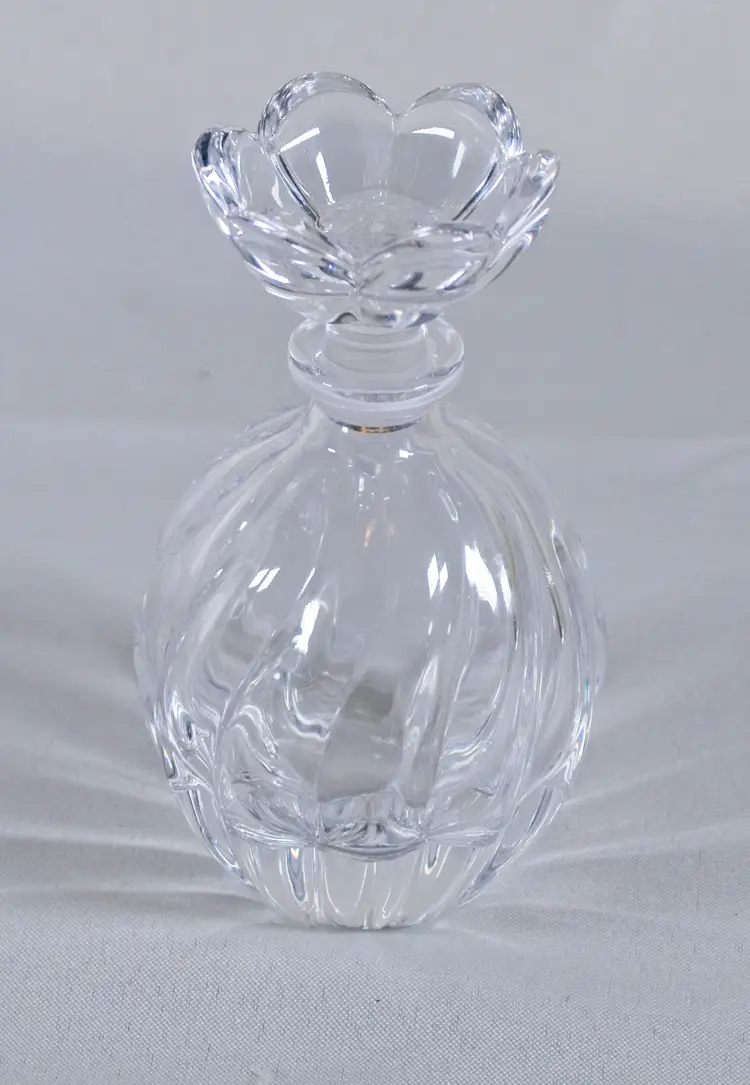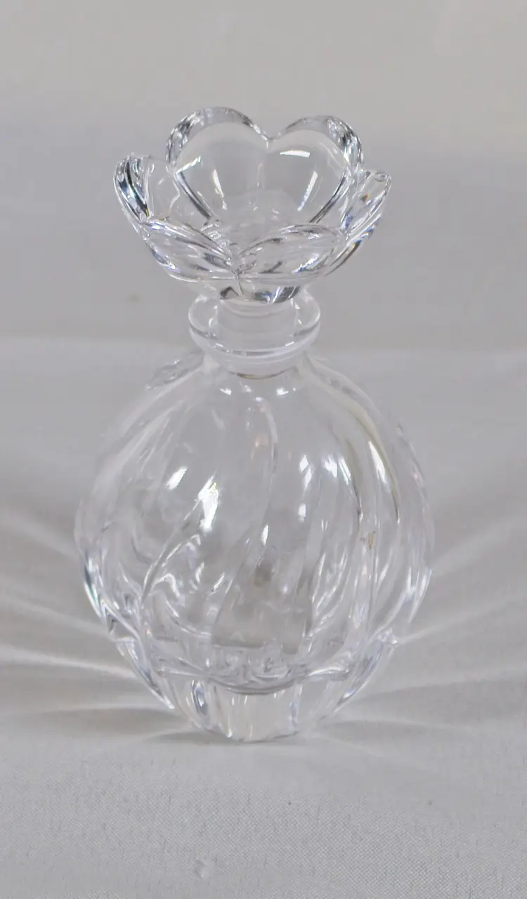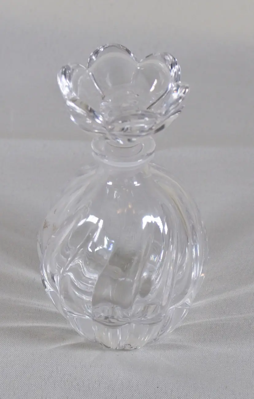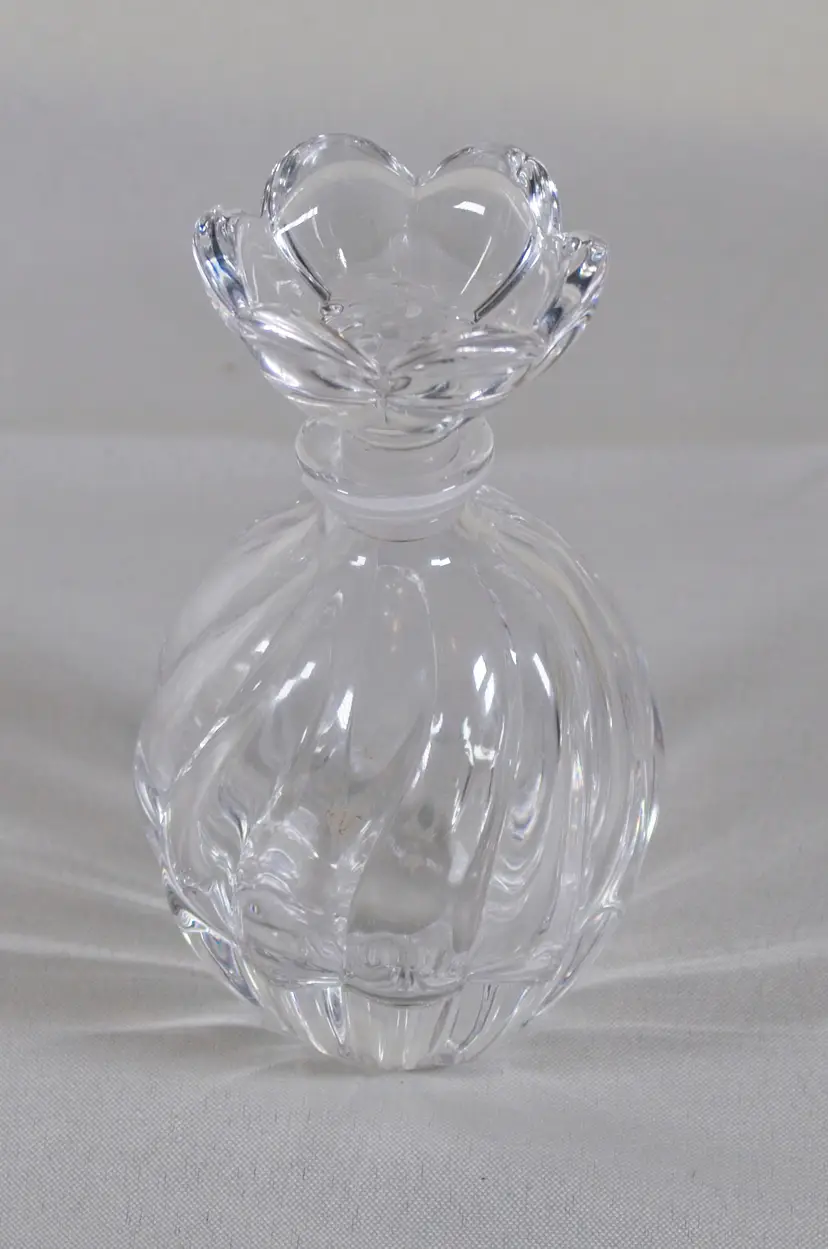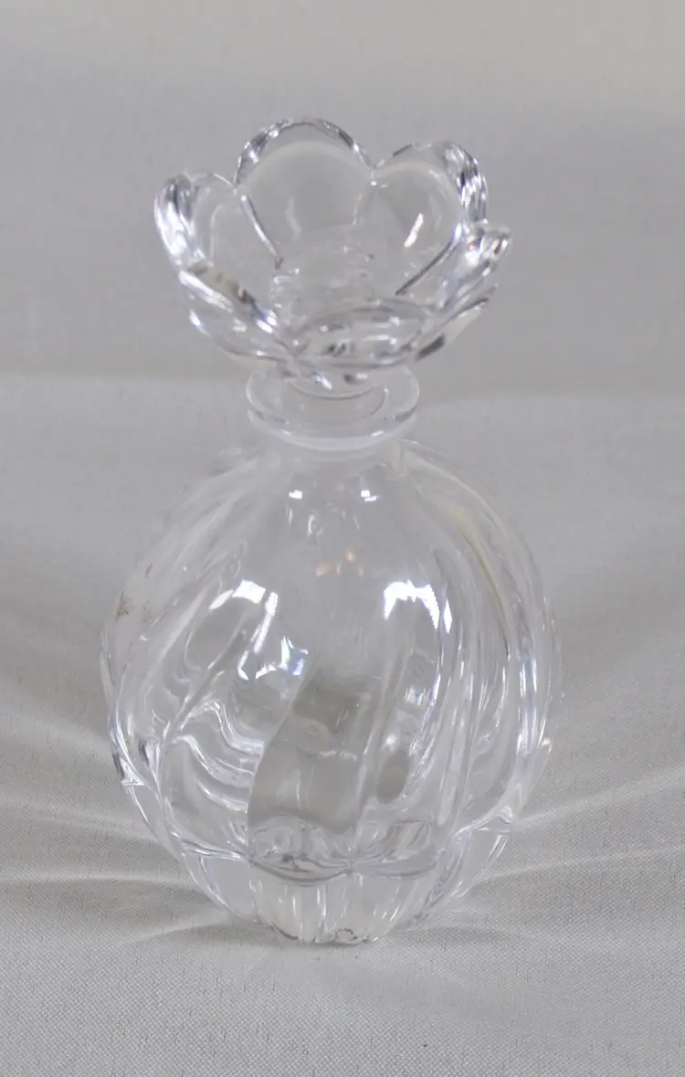 Vintage Clear Glass Perfume Bottle Flower Stopper 5" Tall. In good condition. 3" diameter x 5" tall. Stopper is 2" wide x 1.75" tall. Bottle is 4" tall