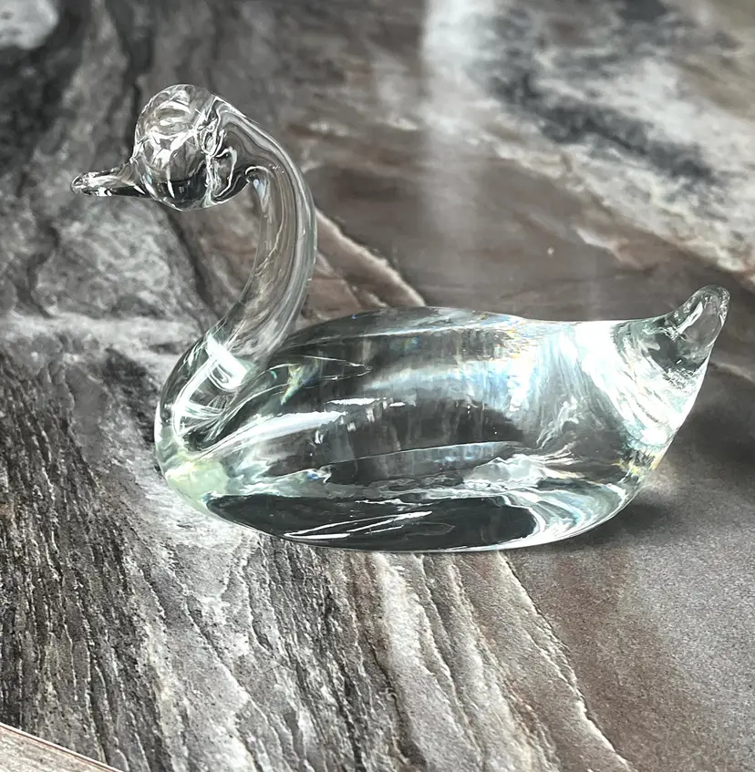 A clear glass swan. Vintage. Approximately 3 1/8 inches tall, 4 1/2 inches long and 1 3/4 inches wide. Preowned. There is a slight rough spot on her tail. It's not a nic, it's from the manufacturer. Excellent condition.