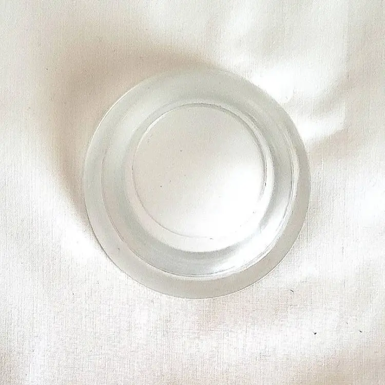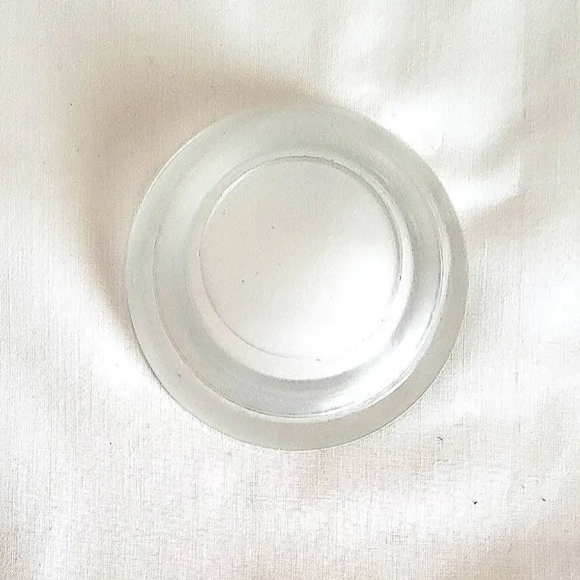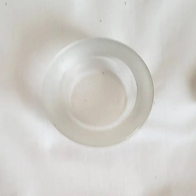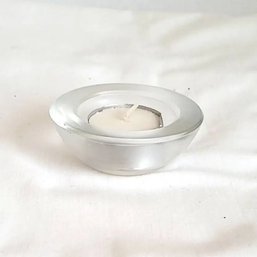 Clear glass votive candle holder measures 3 inches wide and 1 inch tall. Its smooth, rounded design features a shallow well to securely cradle a tealight or votive candle. The glossy finish and excellent condition make it a timeless accent for any décor—perfect for ambient lighting, meditation spaces, or table settings. A versatile piece that blends seamlessly with modern or classic styles.