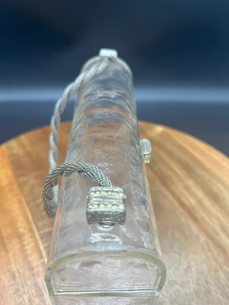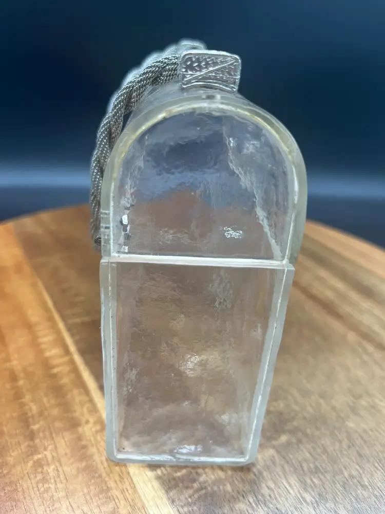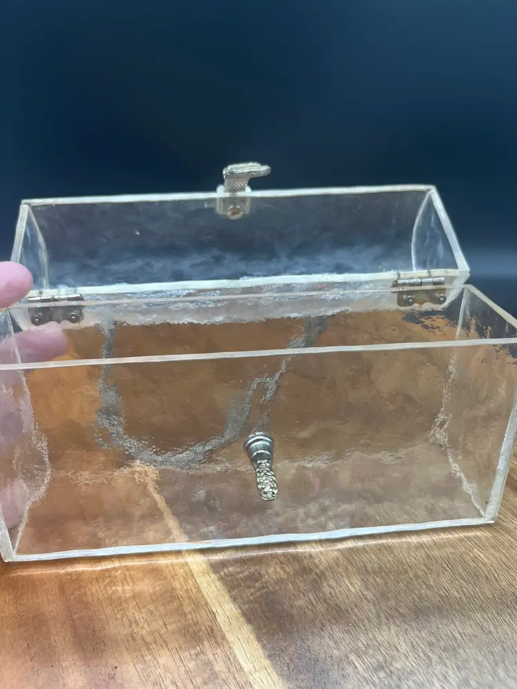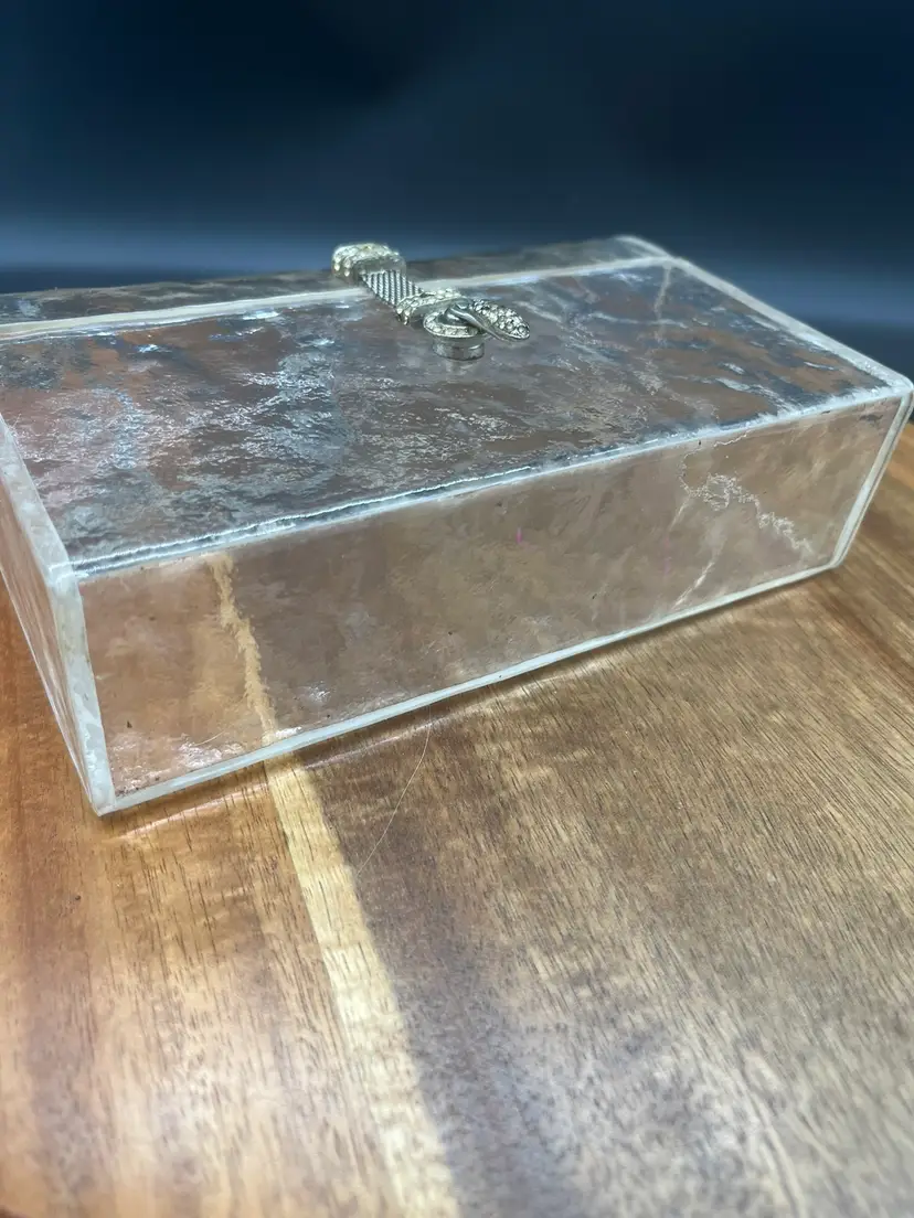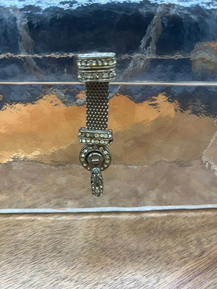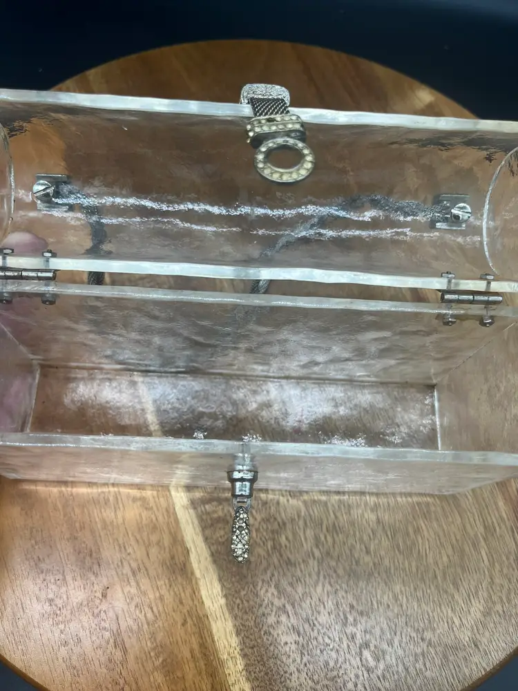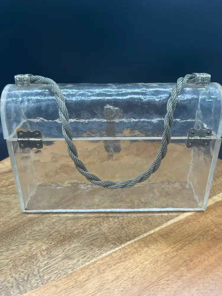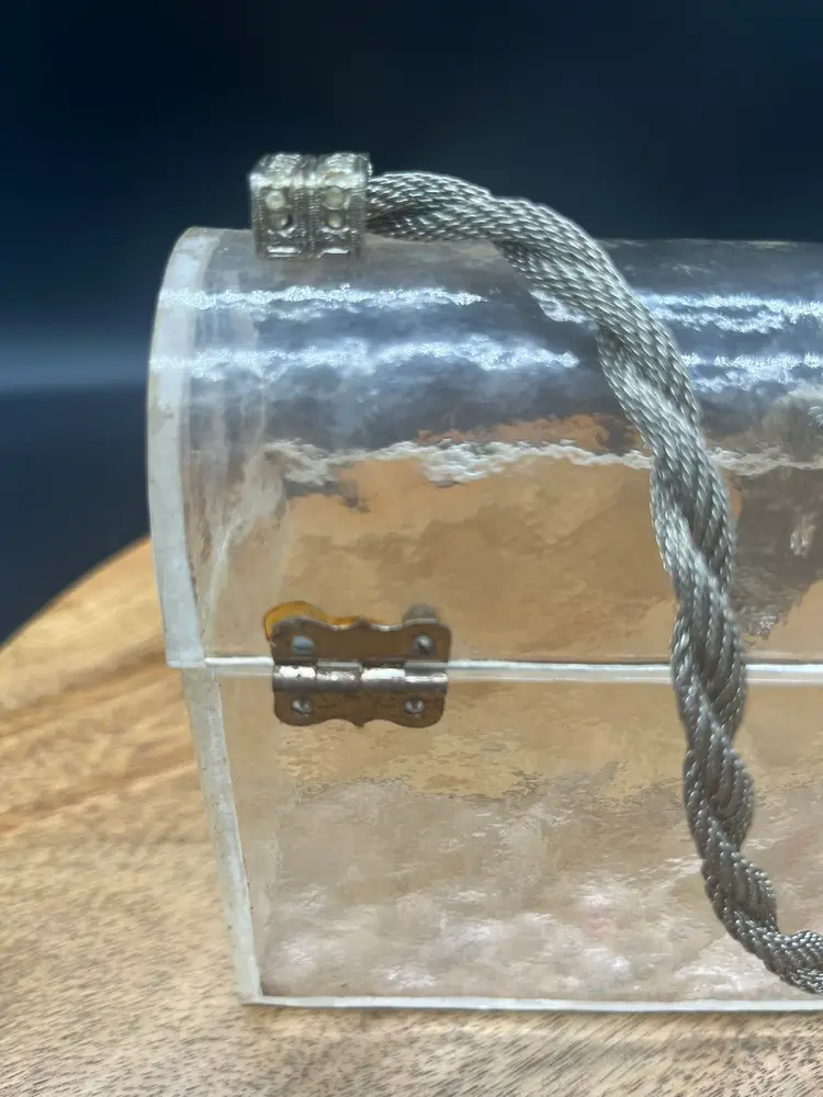 Vintage Clear Lucite Handbag, Braided Gold-Tone Chain and Crystals Some of the stones may be dead or missing, easily replaced if you desire Stunning and unique piece Crushed ice style Lucite, some aging around hardware ~5" tall, 7" wide, 2" deep 4" handle height