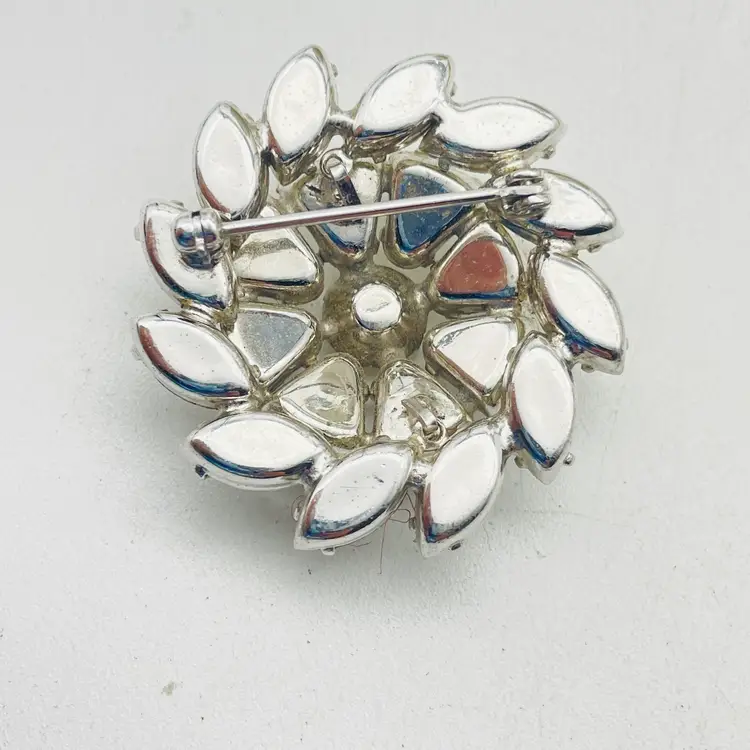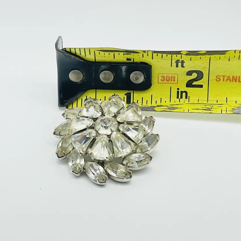 Brilliant vintage rhinestone brooch in a floral design featuring layered marquise and round clear crystals. A timeless sparkle for evening wear or collectors. Features: Clear marquise and round rhinestones Silver tone metal setting Dimensional layered floral design, 1.25 inch Secure pin clasp closure Estimated era: 1950s–1960s vintage rhinestone brooch, floral rhinestone pin, clear crystal brooch, vintage flower brooch, 1950s rhinestone jewelry, silver tone brooch, collectible costume jewelry, mid century jewelry, vintage sparkle brooch, elegant floral pin, marquise crystal brooch, retro vintage accessory, bridal brooch