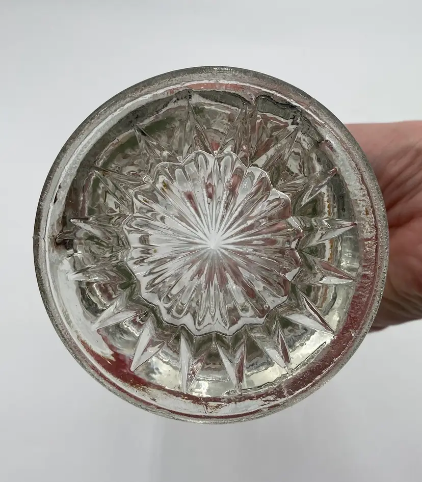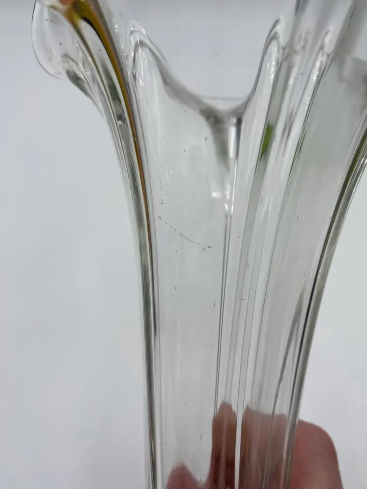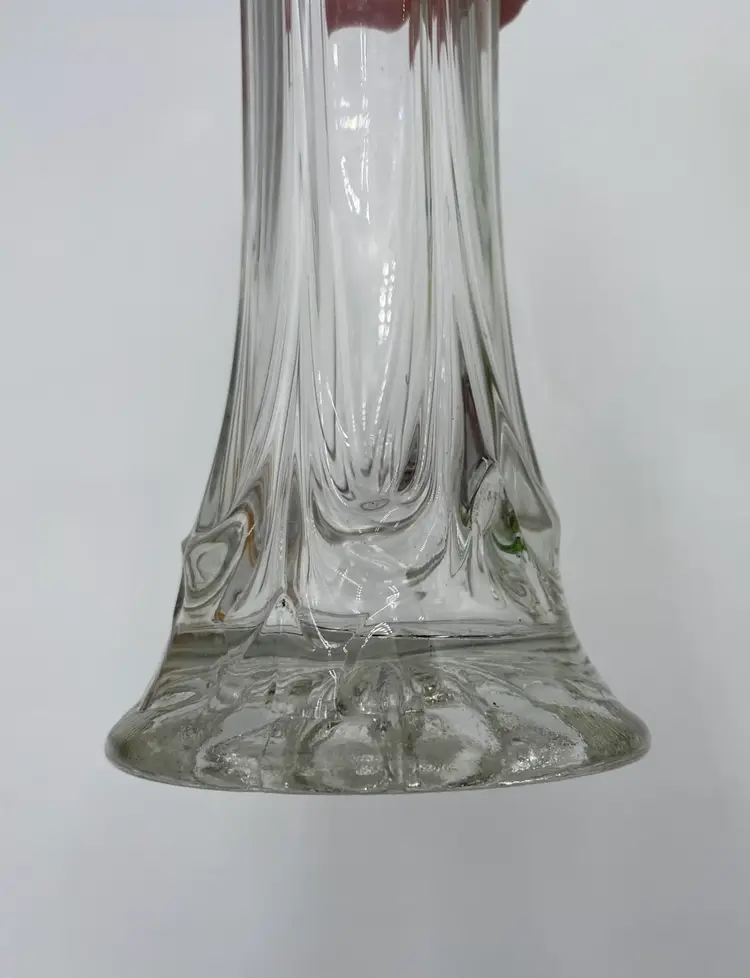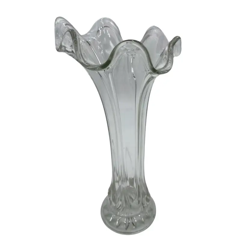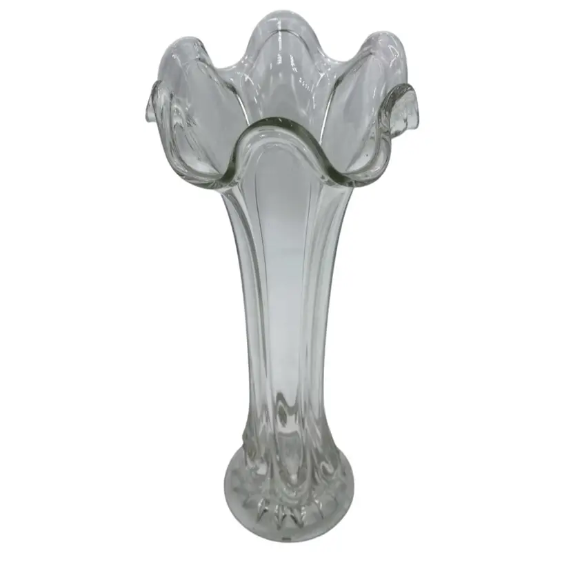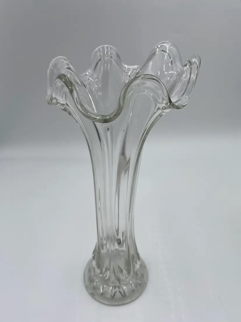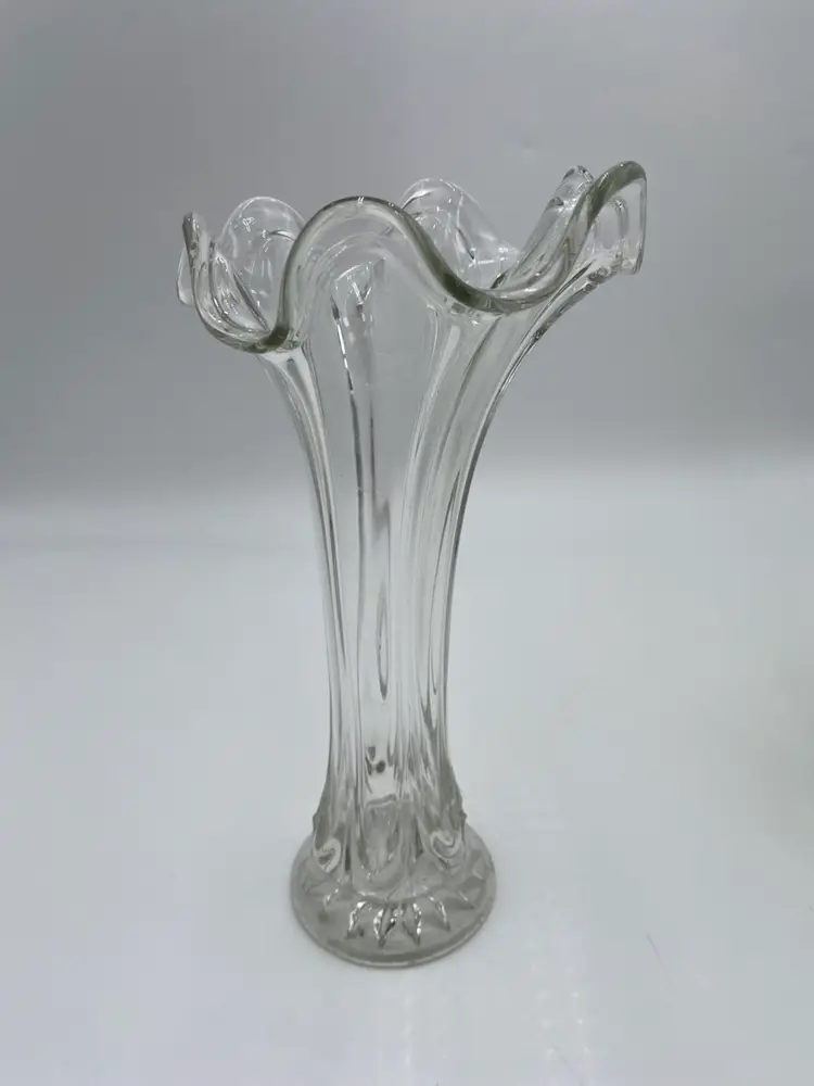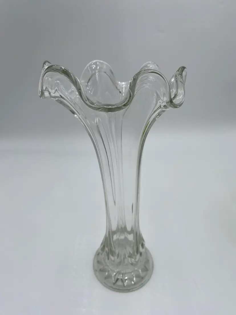 This vintage clear swung glass vase is 11.2 inches tall with a starburst base and ruffle detailing. It features 6 petals and panels, giving it an elegant design. Given the clarity of the base, I believe this was made in the United States via pressed or molded glass. It is is substantial, weighing over a pound, and at over 5 inches wide, would hold a nice bouquet.