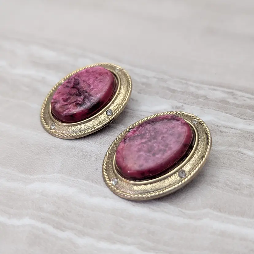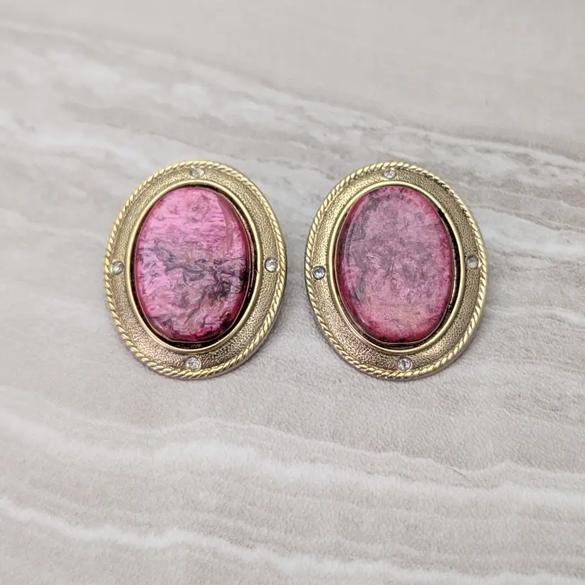 These earrings measure about 1". Stylish statement earrings that feel very glam and elegant. I am unsure of the center material but I do not think it is actual stone due to the weight. Small marks to front gold tone. Some marks and imperfections to rear as well as some darkening to crevices in the rear. I am unsure of the material of the gems; however, there are none missing.