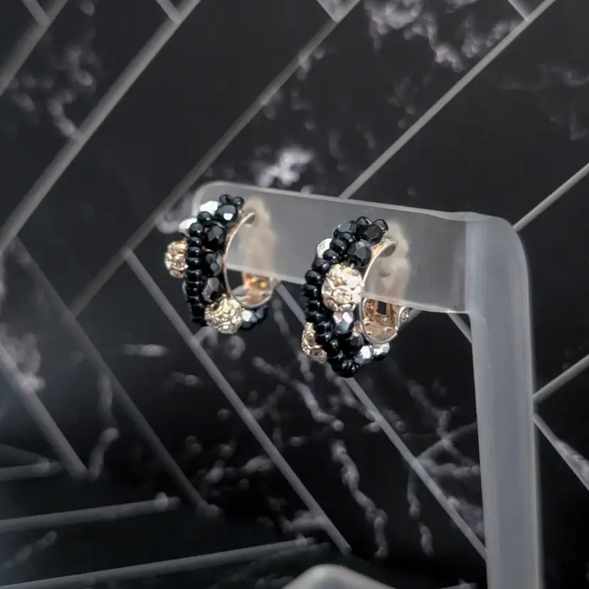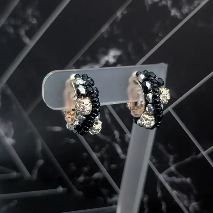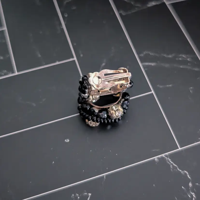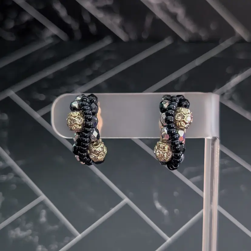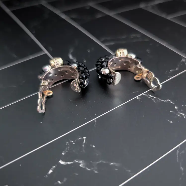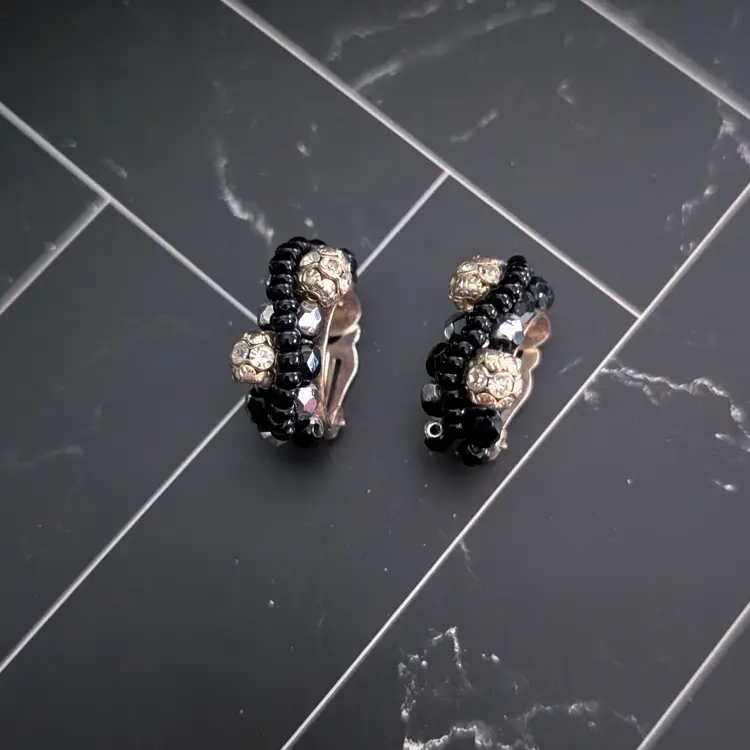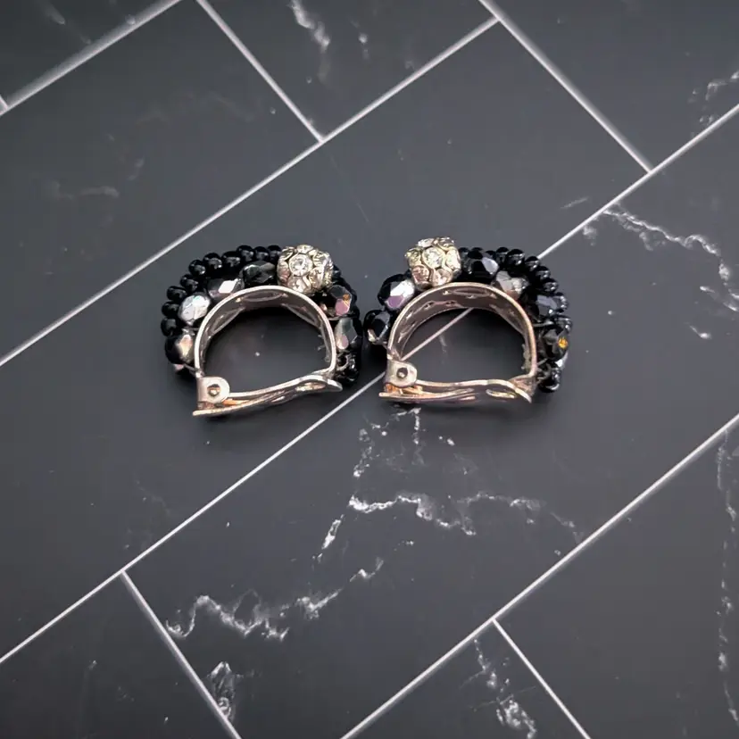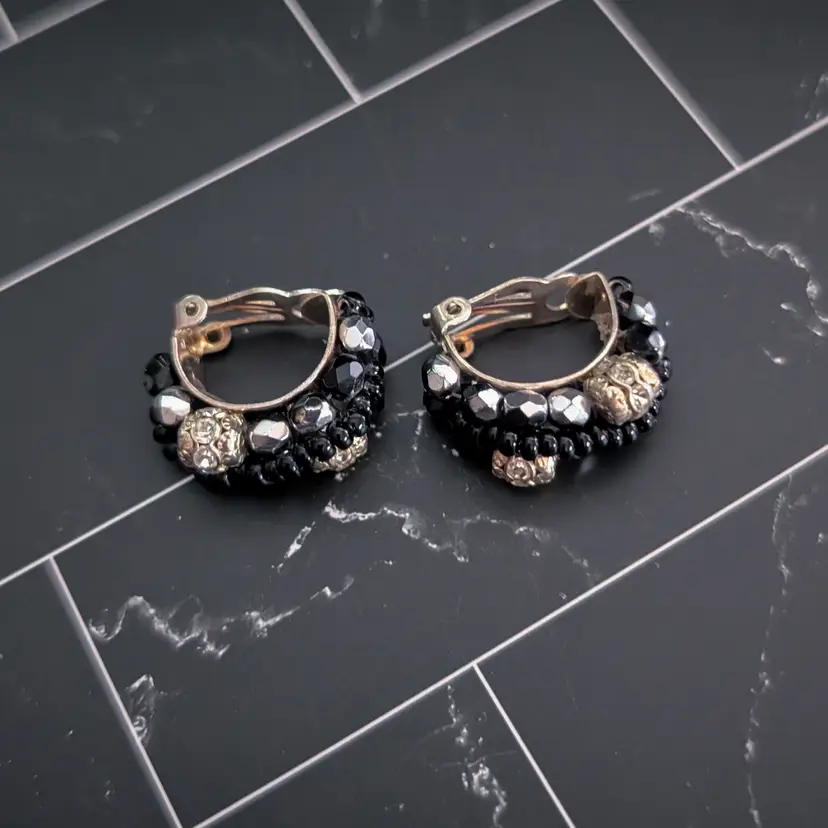 Vintage Clip On Earrings Beaded Hoops Black, Metallic, Gold Tone