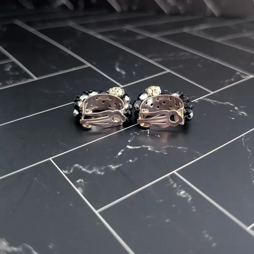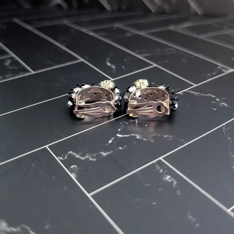 These earrings measure about 1". Small amount of discoloration to clips. Light marks and wear to the beads. Possibly some clear accent rhinestones missing.