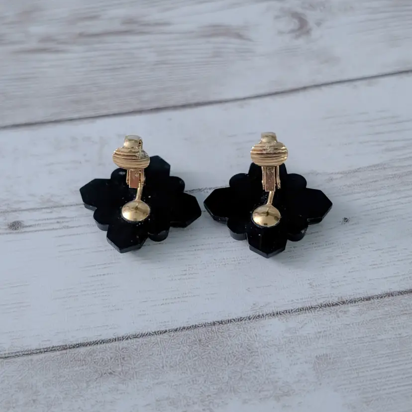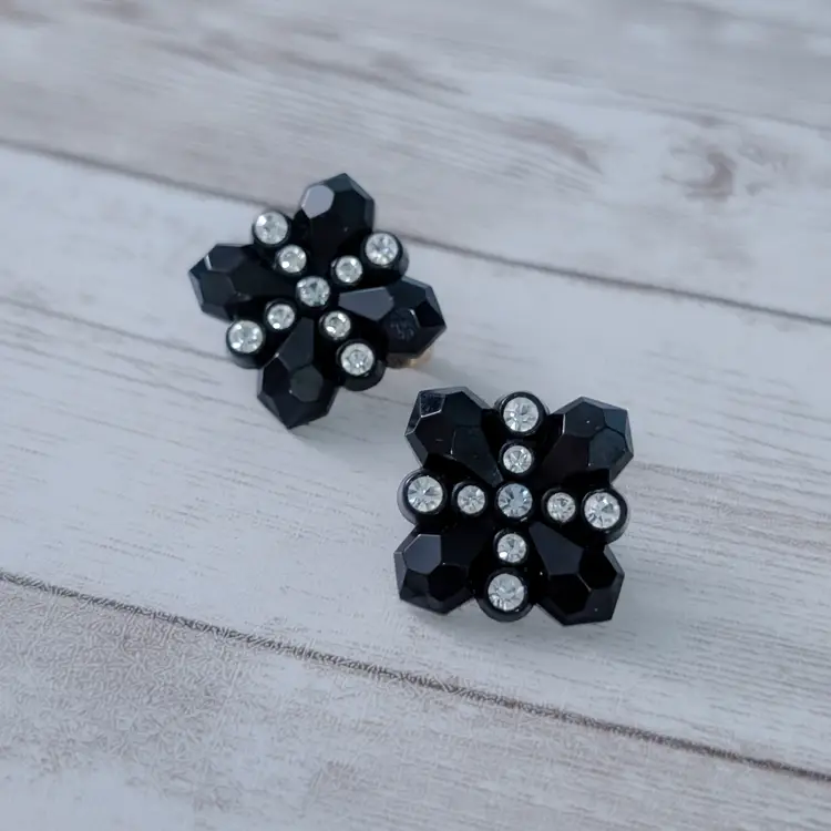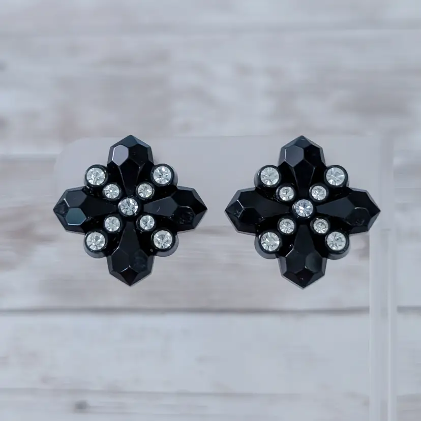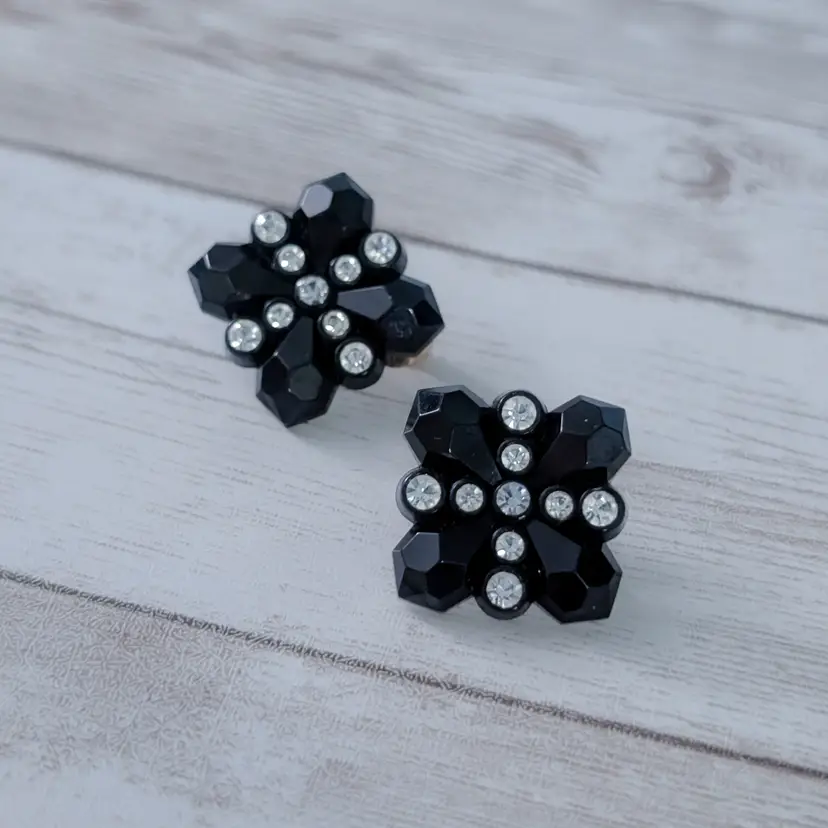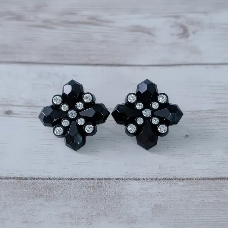 Vintage Clip On Earrings Black with Clear Gems 1" - Statement