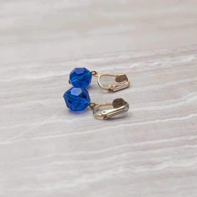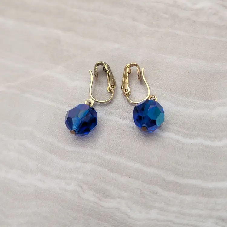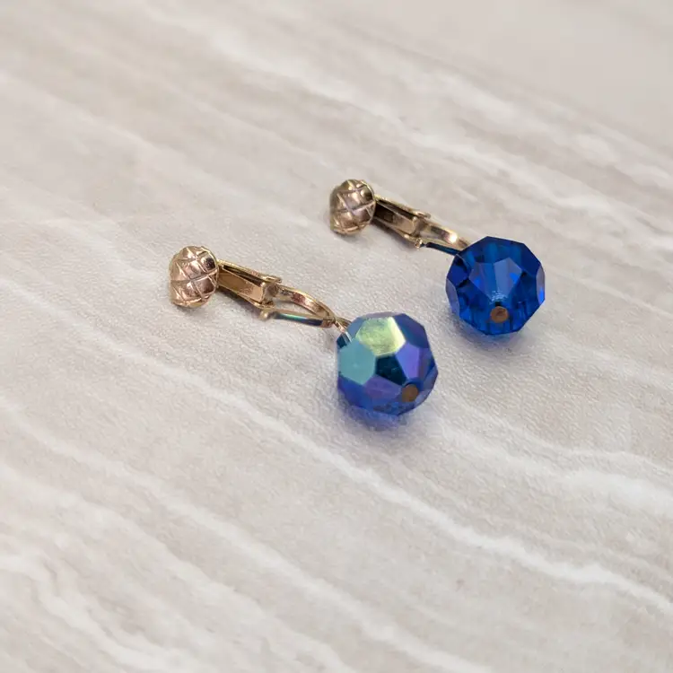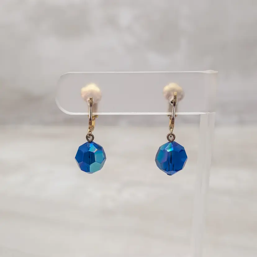 Vintage Clip On Earrings Blue Ball with Iridescent Finish Dangle Earrings