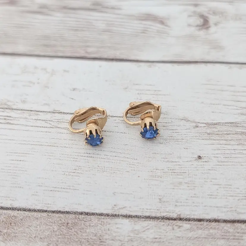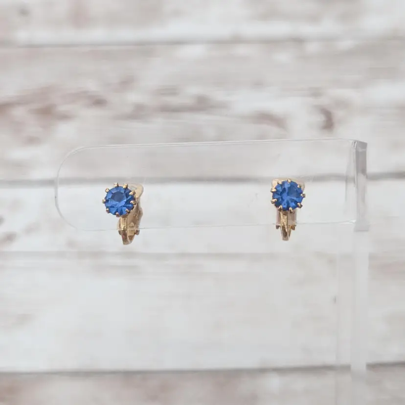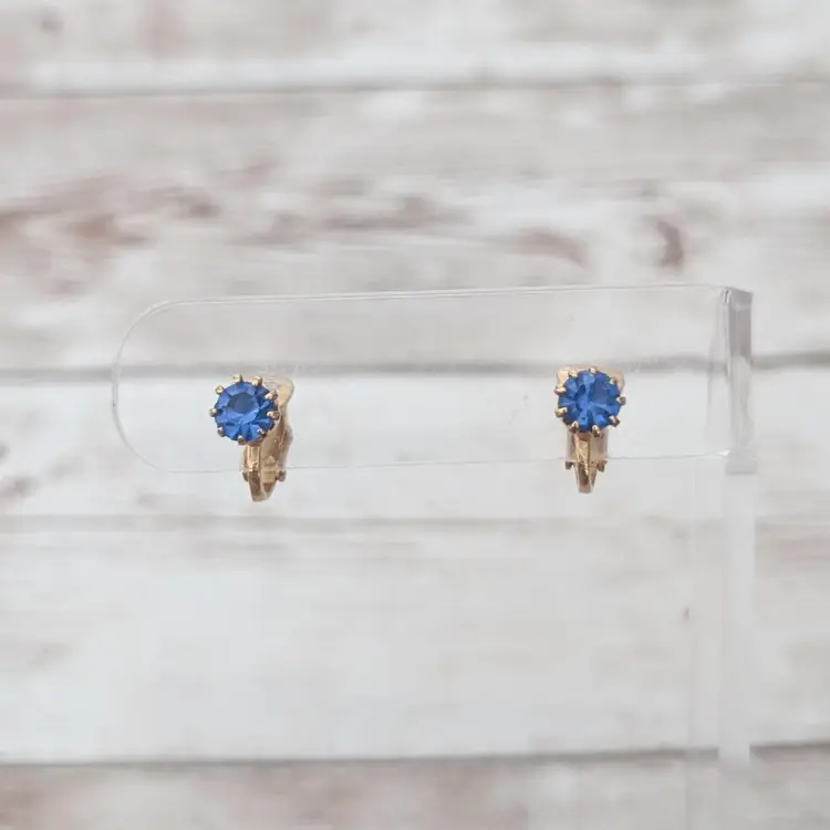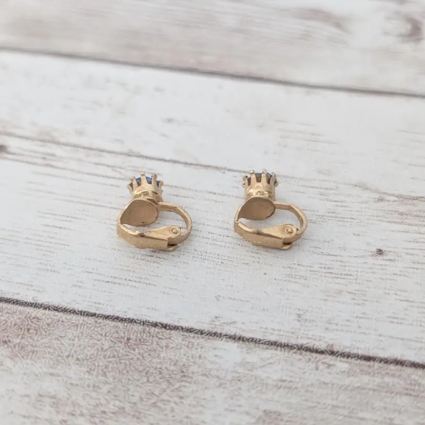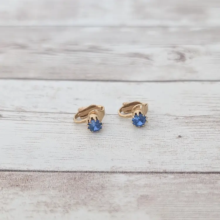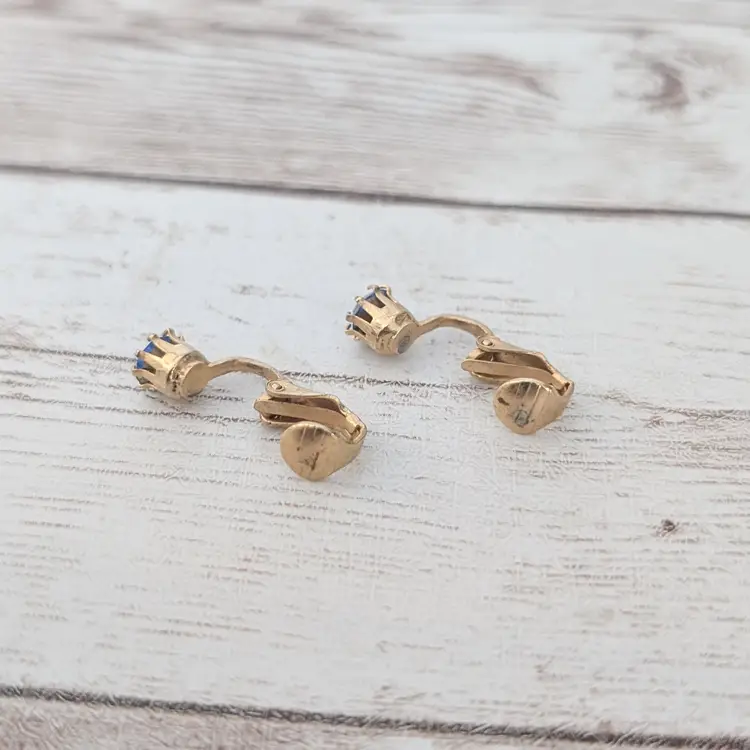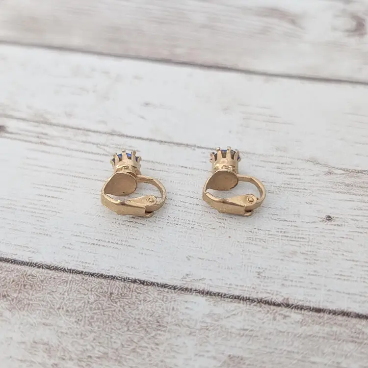 These earrings measure about 3/16". I am not sure of the material of the gems. Some gold tone wear and dulling to the outside facing areas. Heavier gold tone wear to inside of clips. Very small and dainty earrings.
