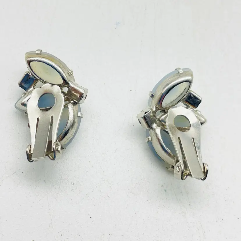 Beautiful vintage clip-on earrings featuring soft blue moonglow navette beads accented with sparkling aurora borealis rhinestones. Set in silver tone, these earrings add classic mid-century elegance to any look.