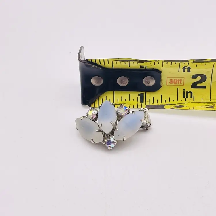 Features: Style: Clip-On Earrings, 1 inch Stones: Blue Moonglow Beads, Aurora Borealis Rhinestones Metal: Silver Tone Era: Mid-Century Vintage Condition: Pre-owned, good vintage condition