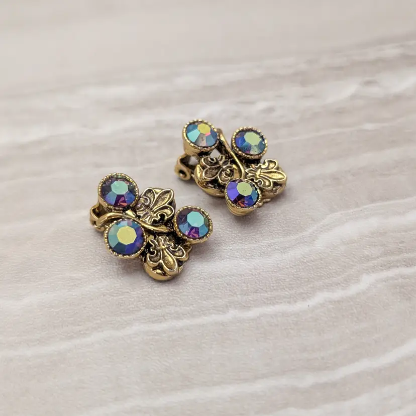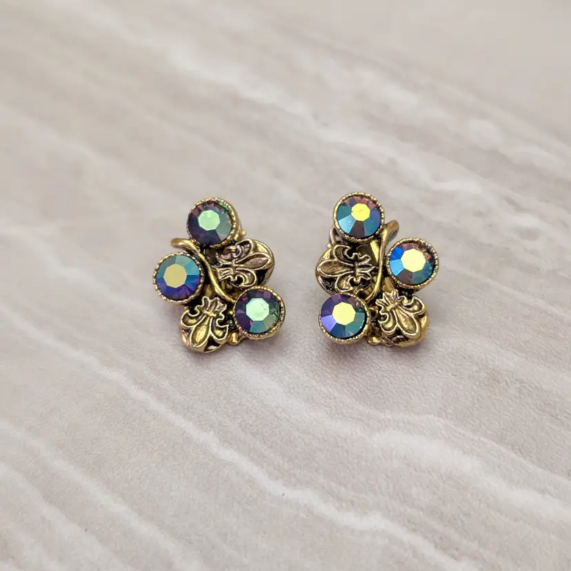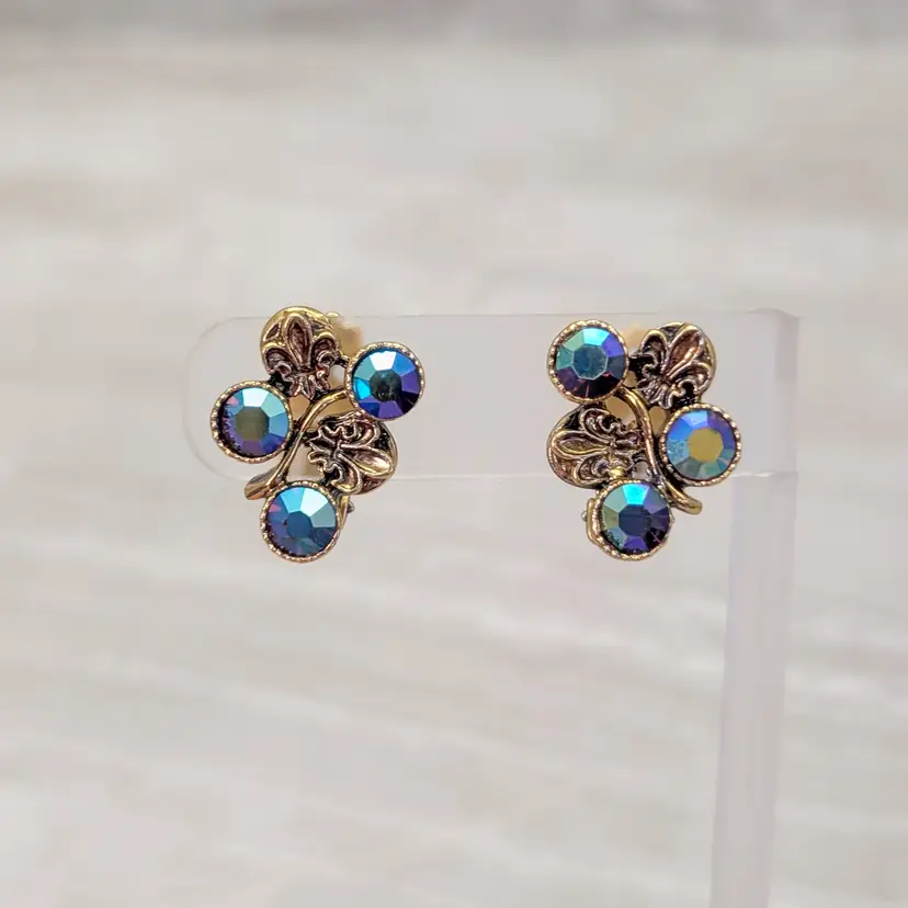 Vintage Clip On Earrings Gold Tone & Blue Aurora Borealis Gems Statement