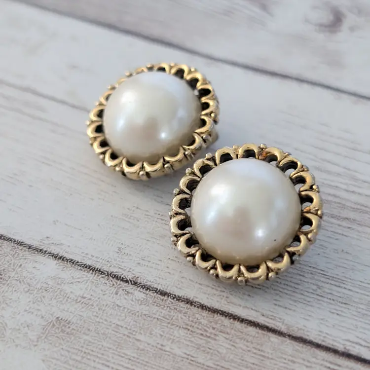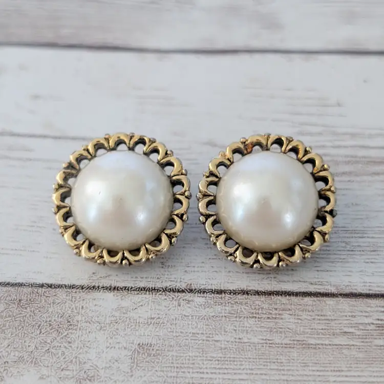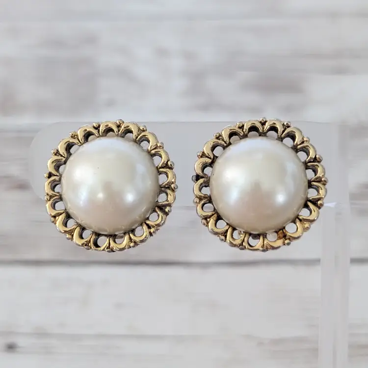 Vintage Clip On Earrings Large Statement Gold Tone Ornate Halo & Faux Pearl