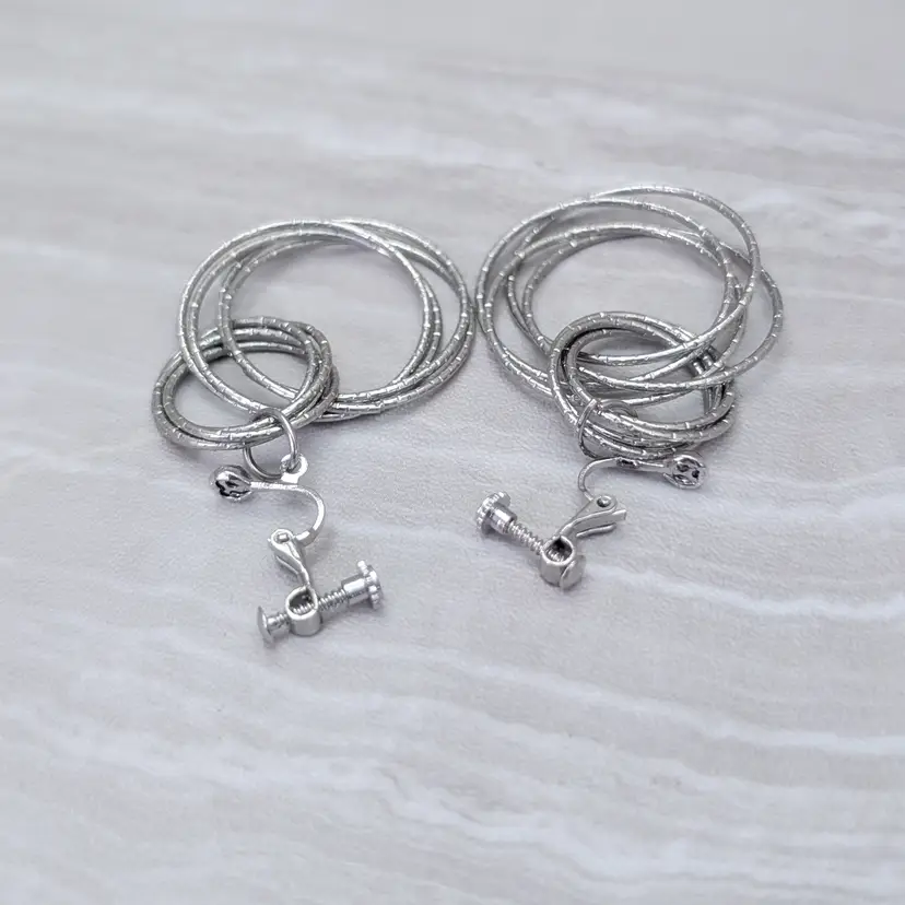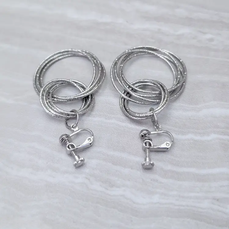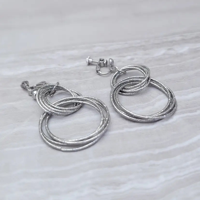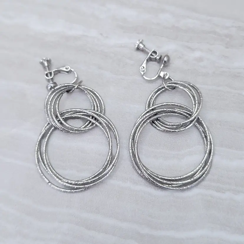 Vintage Clip On Earrings Long Dangle Textured Silver Tone Interlocking Circles