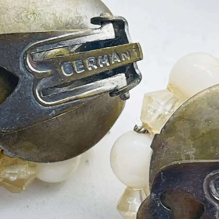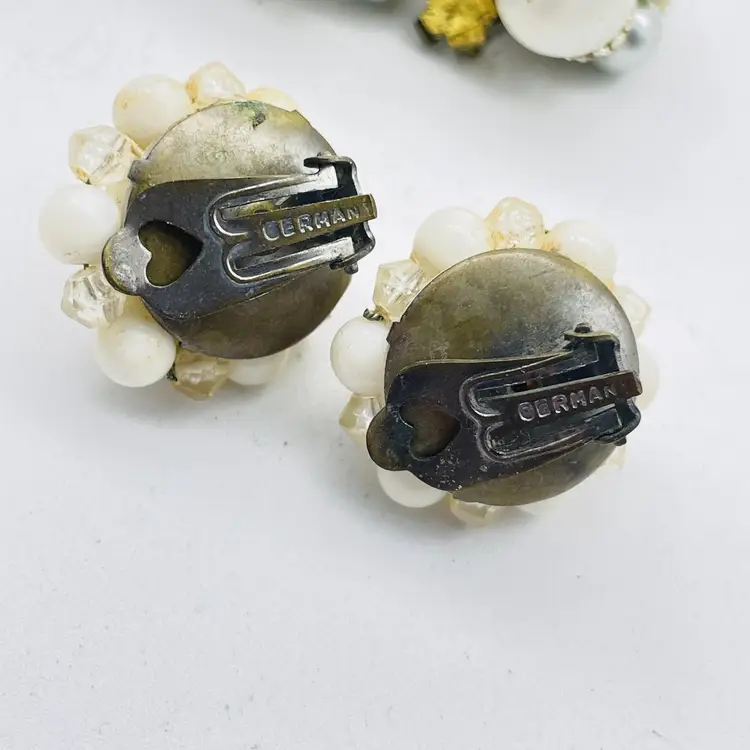 1 pair signed JAPAN, featuring round clusters of faux pearls, gold tone filigree backs, lucite gold textured beads, large faux pearl centers, and light blue accent beads. 1 pair signed GERMANY, featuring creamy white plastic beads and clear faceted beads arranged in a cluster pattern, silver tone heart-cutout clip hardware. Both pairs marked with their respective country of origin: "GERMANY" and "JAPAN" on the clip backs. Perfect for collectors of vintage costume jewelry, midcentury or retro accessories, or for craft and upcycling projects. Era: Likely 1950s-1960s based on style, hardware, and country markings.