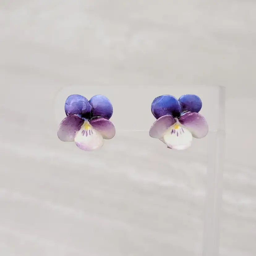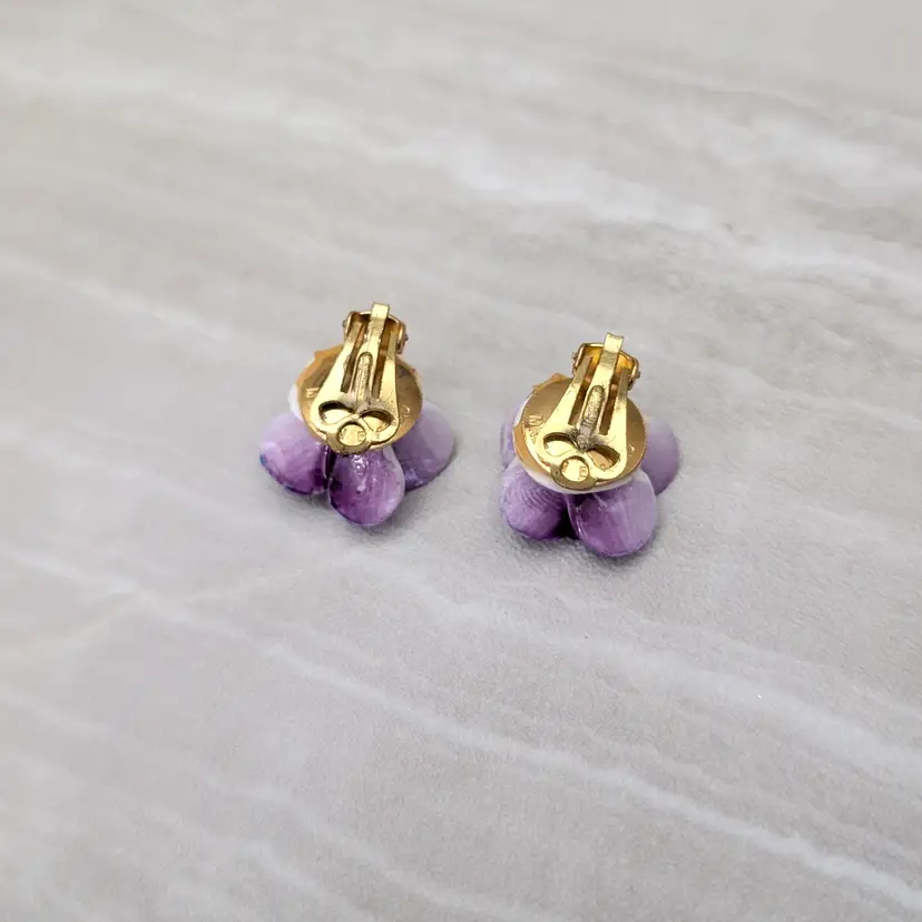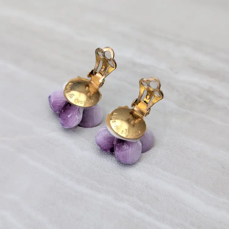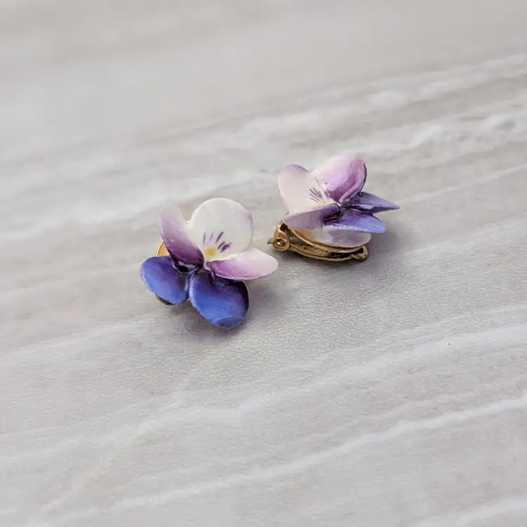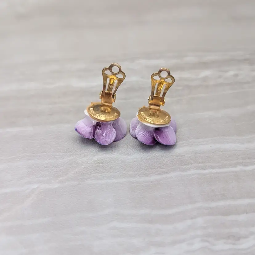 Vintage Clip On Earrings Purple and White Pansy Flower - 0.75" - Made in England