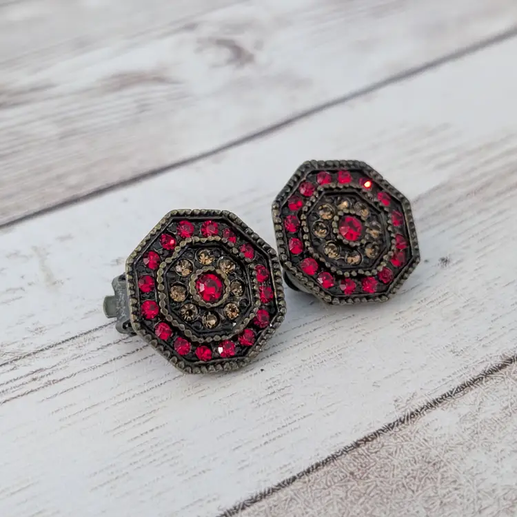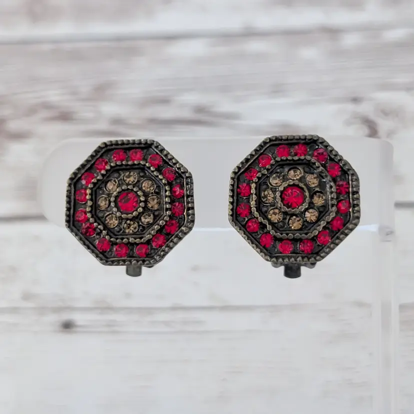 Vintage Clip On Earrings Red & Brown Gems Octagon