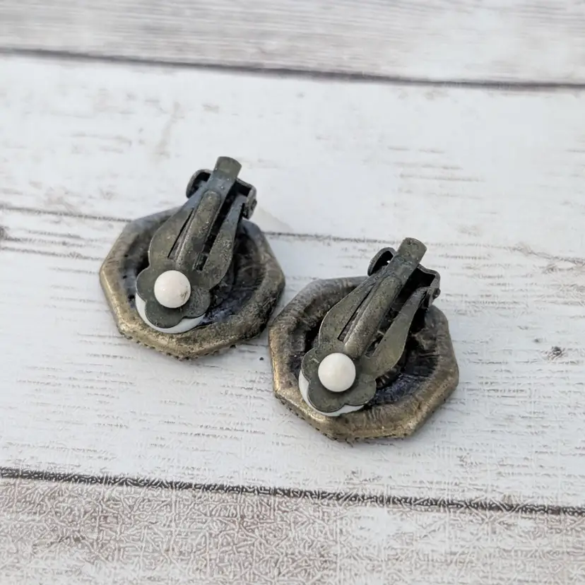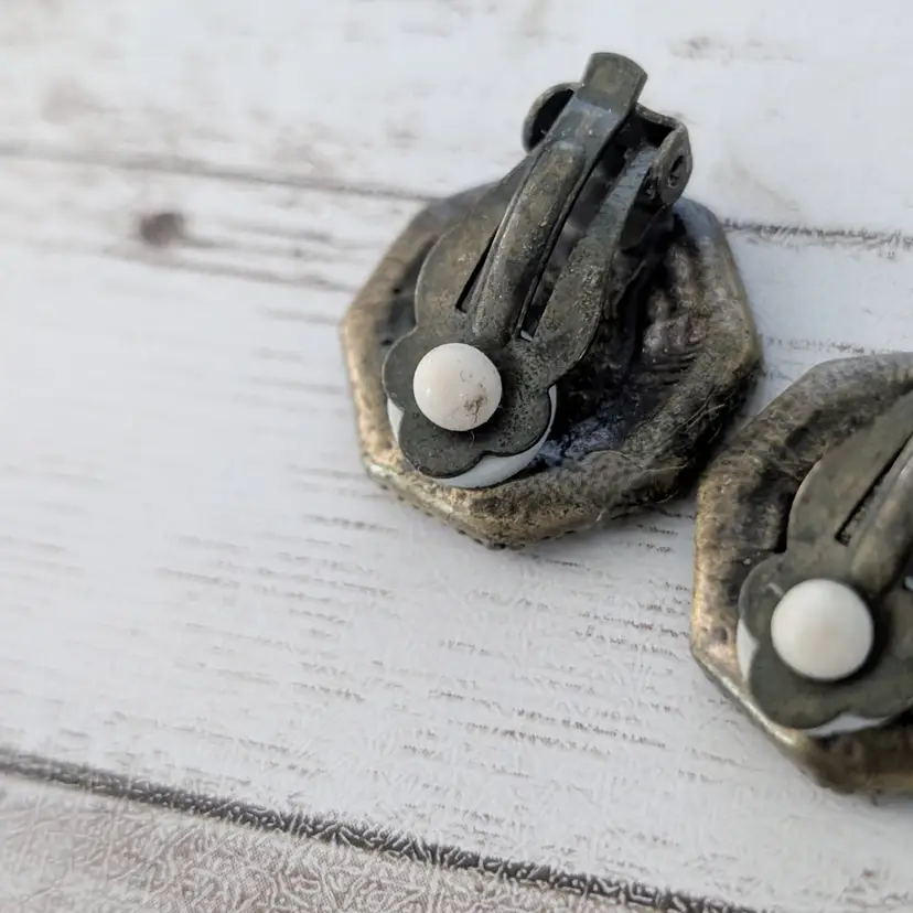 Preowned vintage earrings, sold as shown - I am unsure of material type(s) because of this. Pictures show different angles for you to review - while I attempt to note any defects, some tarnish/signs of wear may be visible that are not otherwise stated.