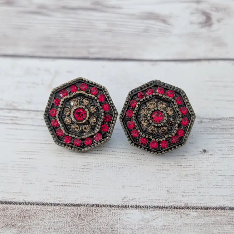 These earrings measure between 3/4-7/8". Dark bronze tone metal. Some darkening to rear. Some marks to pads. I am unsure of the material of the gems; however, there are none missing.