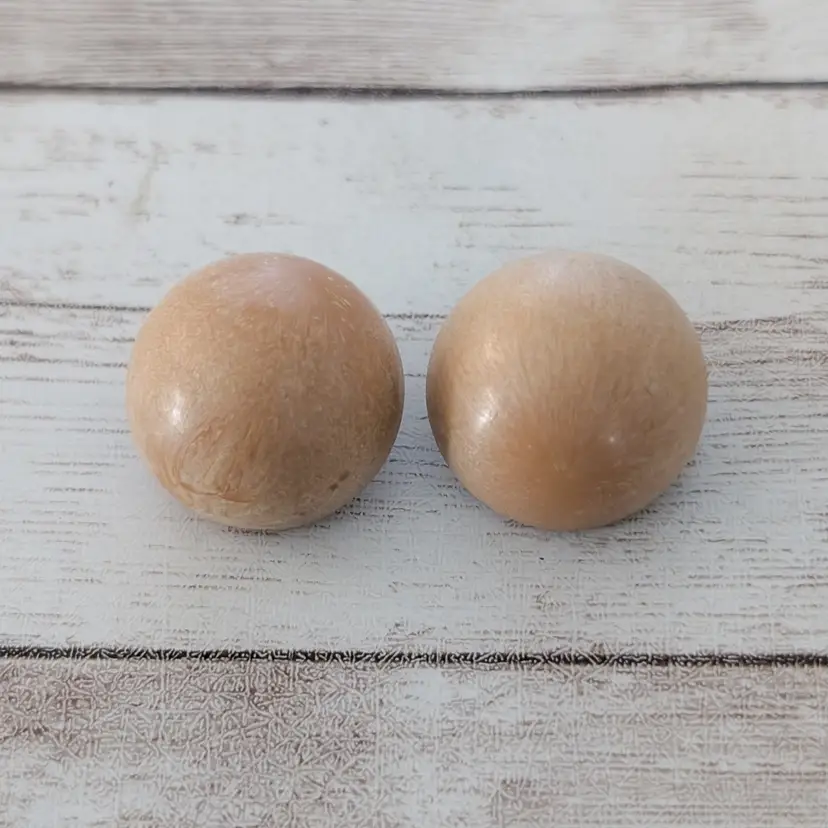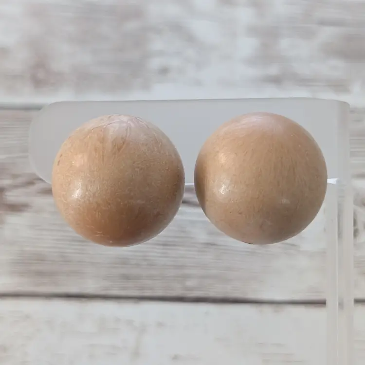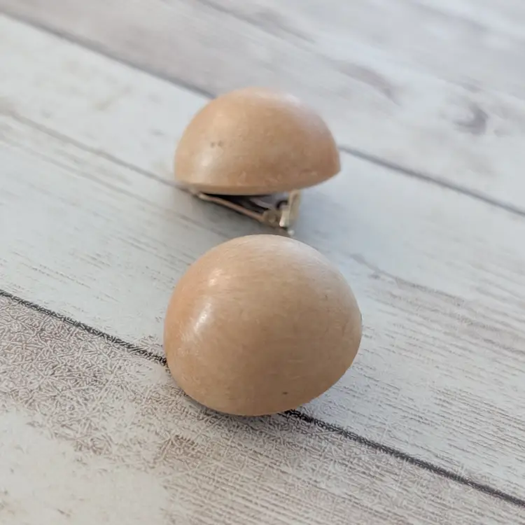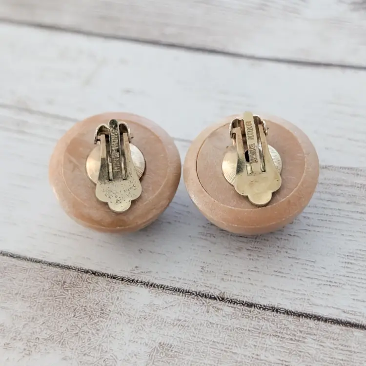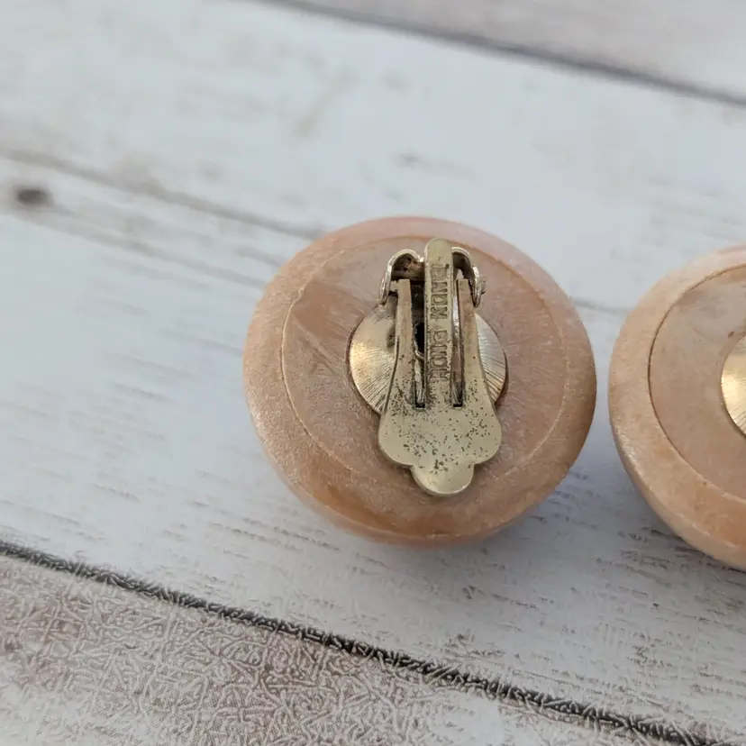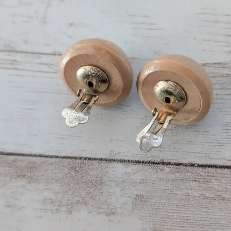 These earrings measure just over 7/8". Stamped Hong Kong. Light woodgrain pattern that is less obvious in person than the photos show. Not sure if actual wood or not. Mark on side of one that could be part of knots on wood but I am not sure and there is some color and pattern variation between the two earrings which natural wood would have but the rear looks like it is molded which would lean more towards manmade. Inside of clips have tarnish and discoloration. Outside facing part of clips has some marks, gold tone chips, discoloration, tarnish and signs of wear. One clip is a tiny bit looser than the other, although they are functional, you may want to add an after market grip to increase the hold to the ear.