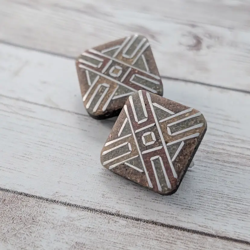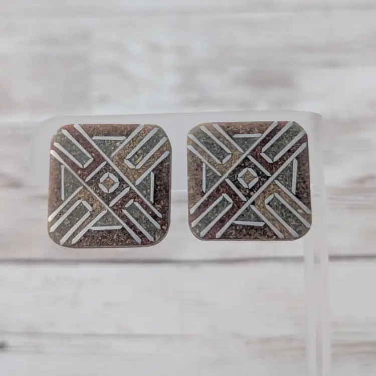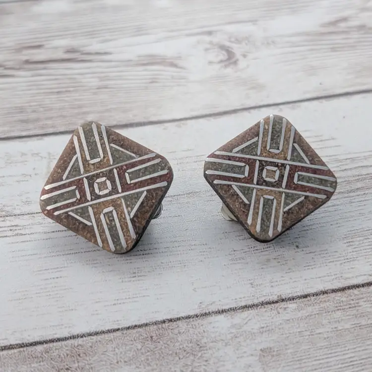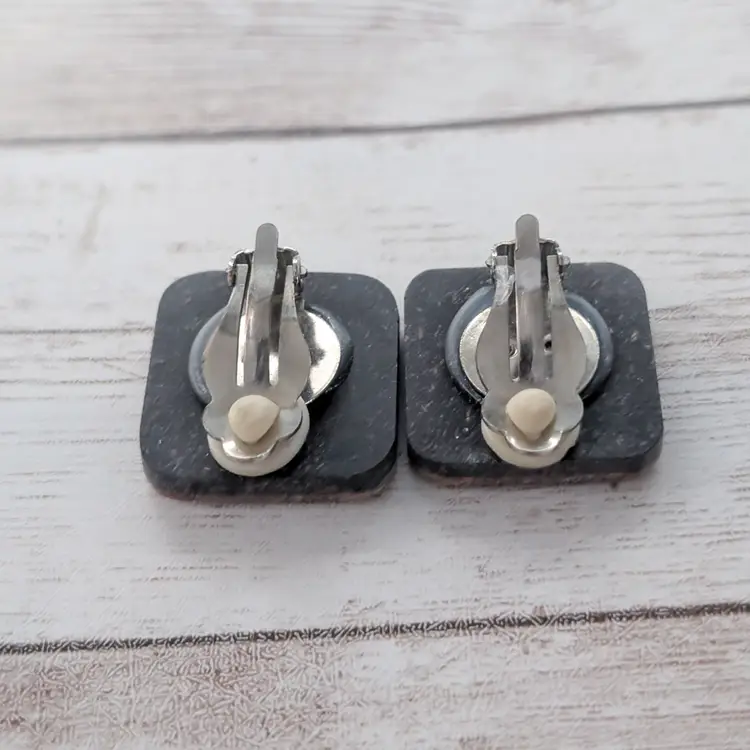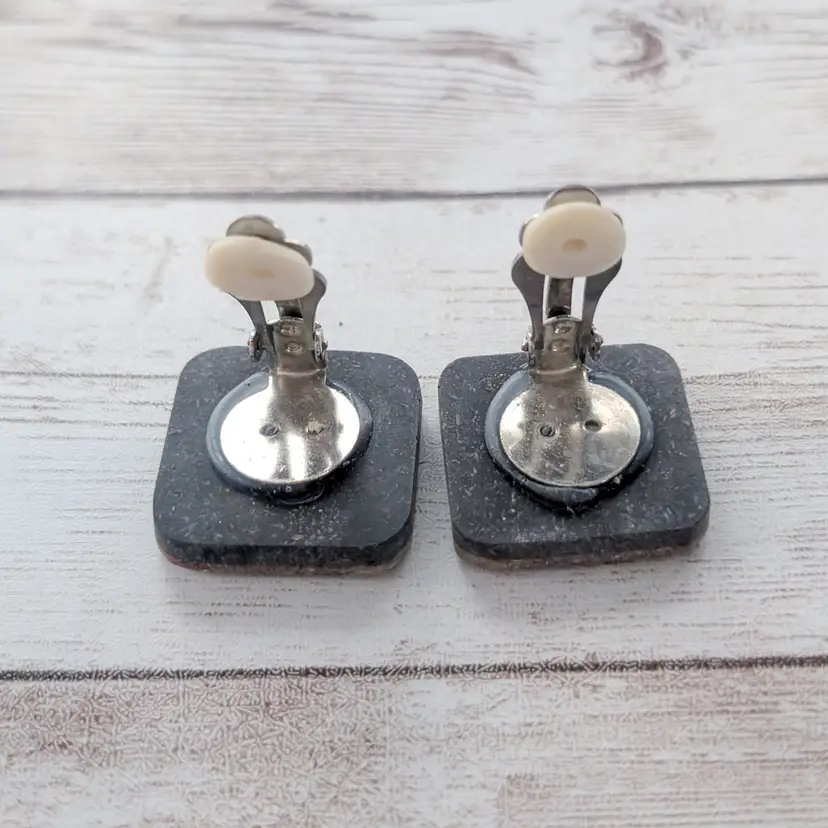 Vintage Clip On Earrings Retro Unusual Patterned Square Statement
