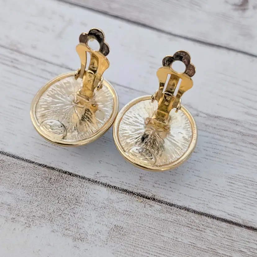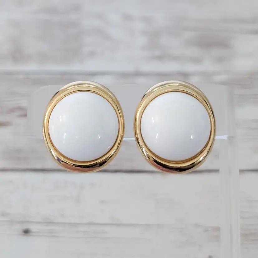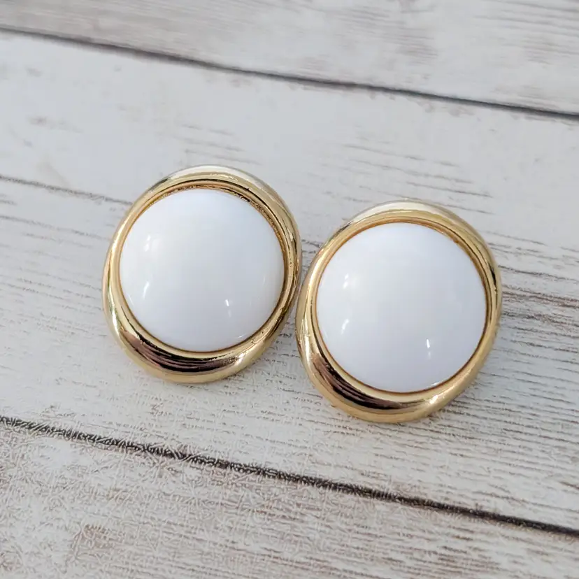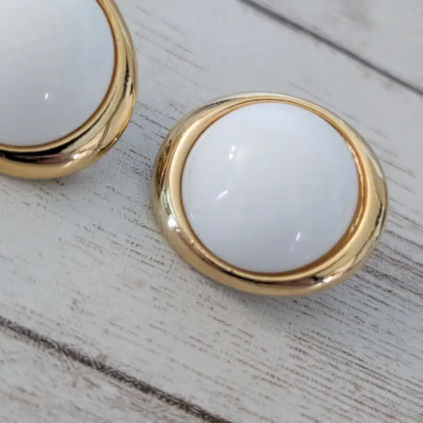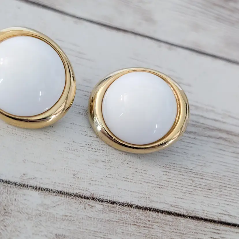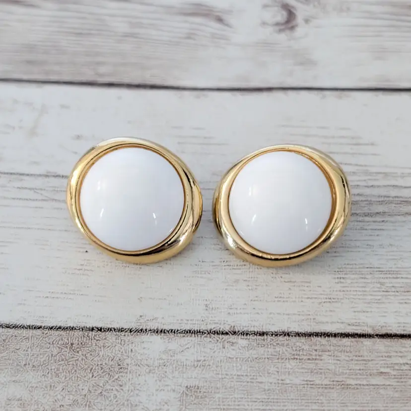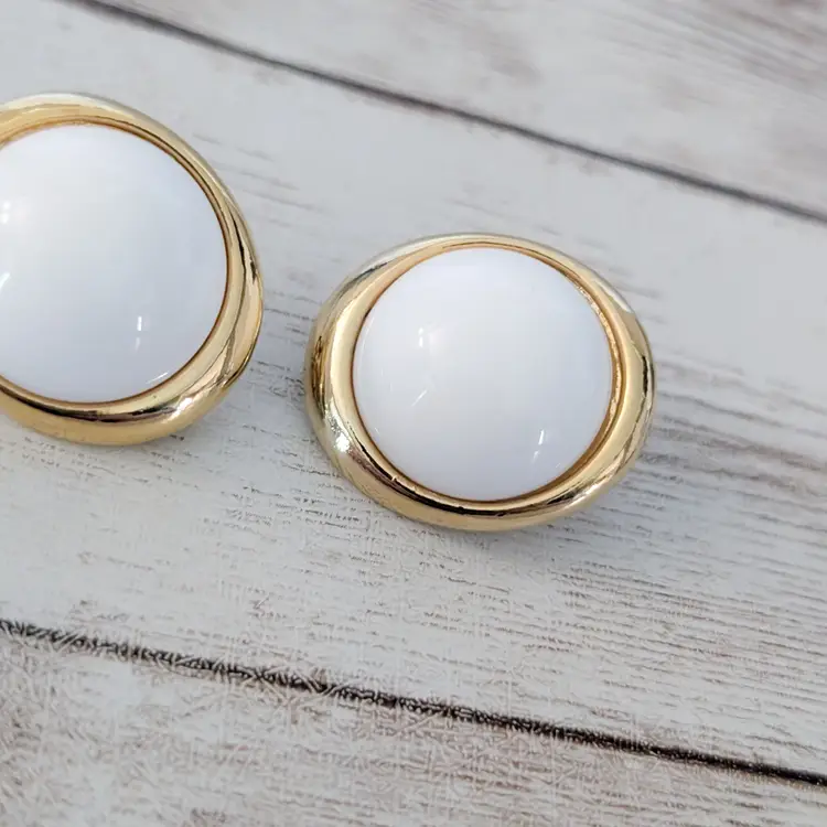 These earrings measure about 1". Chunky retro earrings. Gold tone on halo has some marks/dents and some gold tone chipping. Light marks to white area.