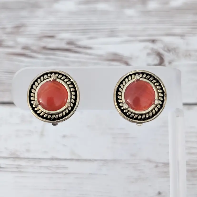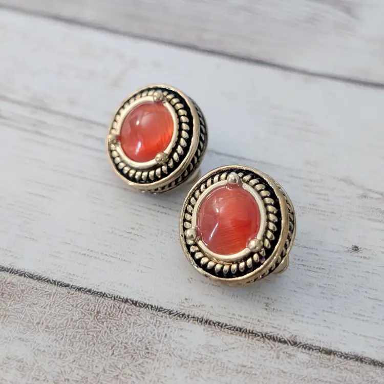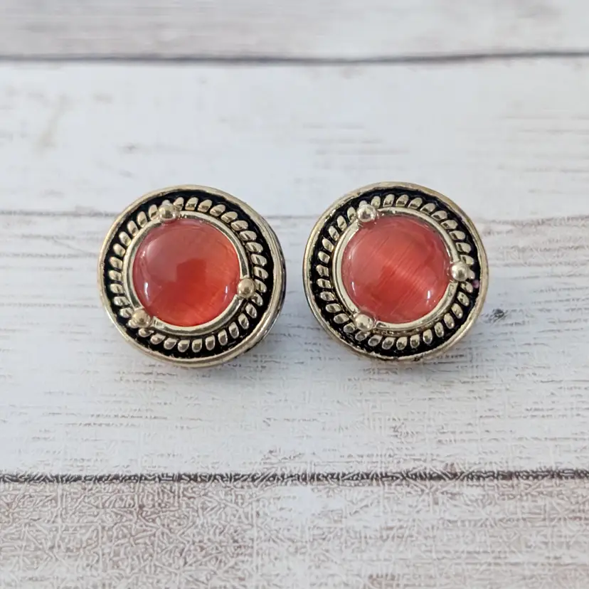 Vintage Clip On Earrings Statement Gold Tone with Orange Center