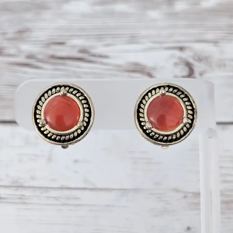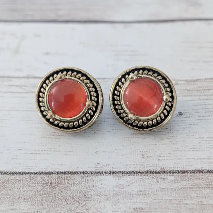 These earrings measure slightly under 0.75". Not sure of material of orange center. Gold tone to rear has tarnish/discoloration. Marks and signs of wear to rear.