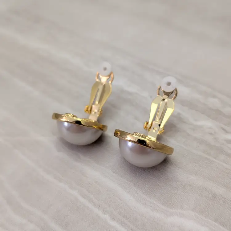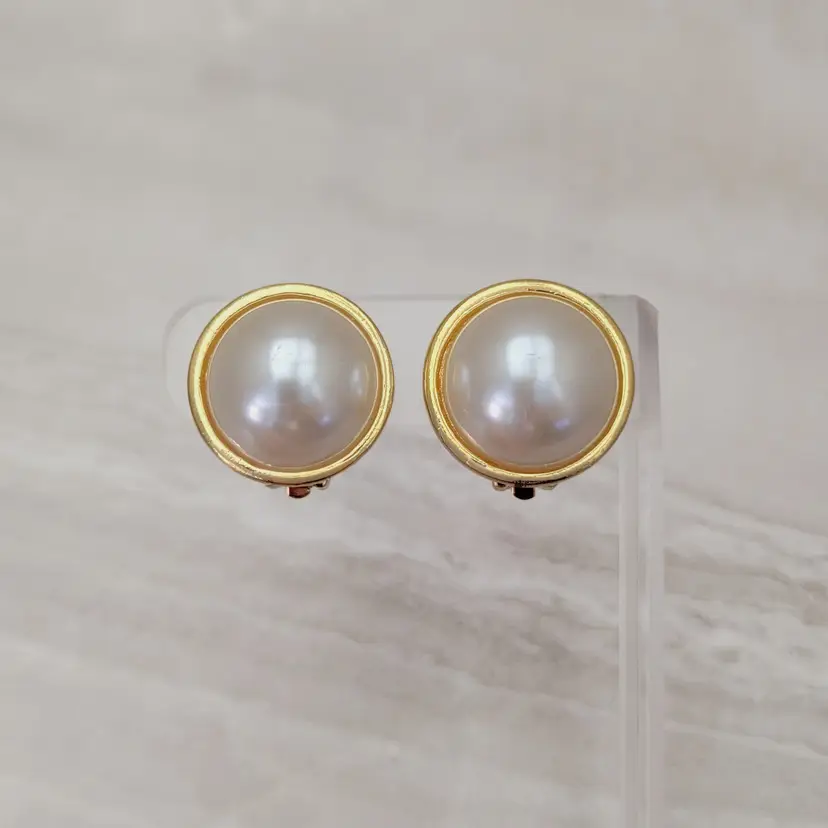 Vintage Clip On Earrings Statement Domed Faux Pearl with Gold Tone Halo Large