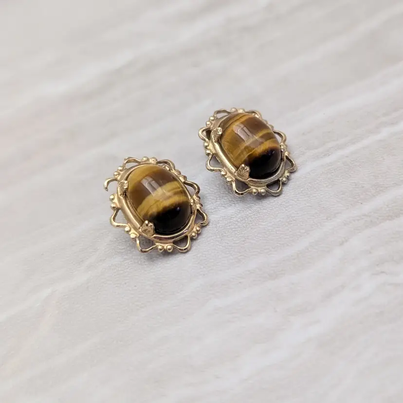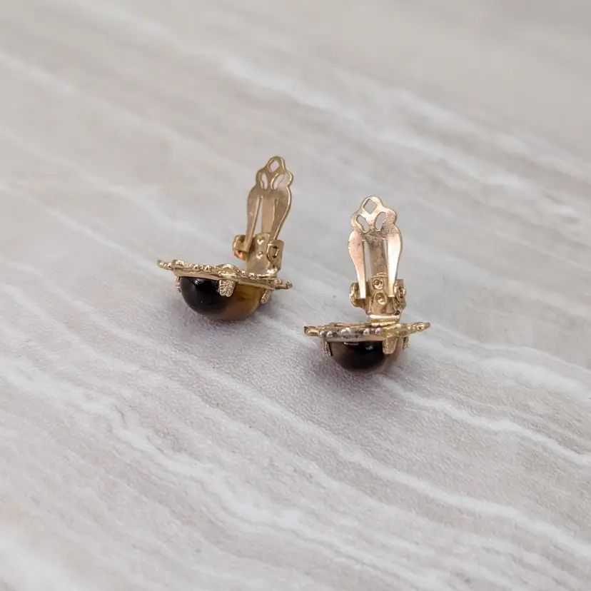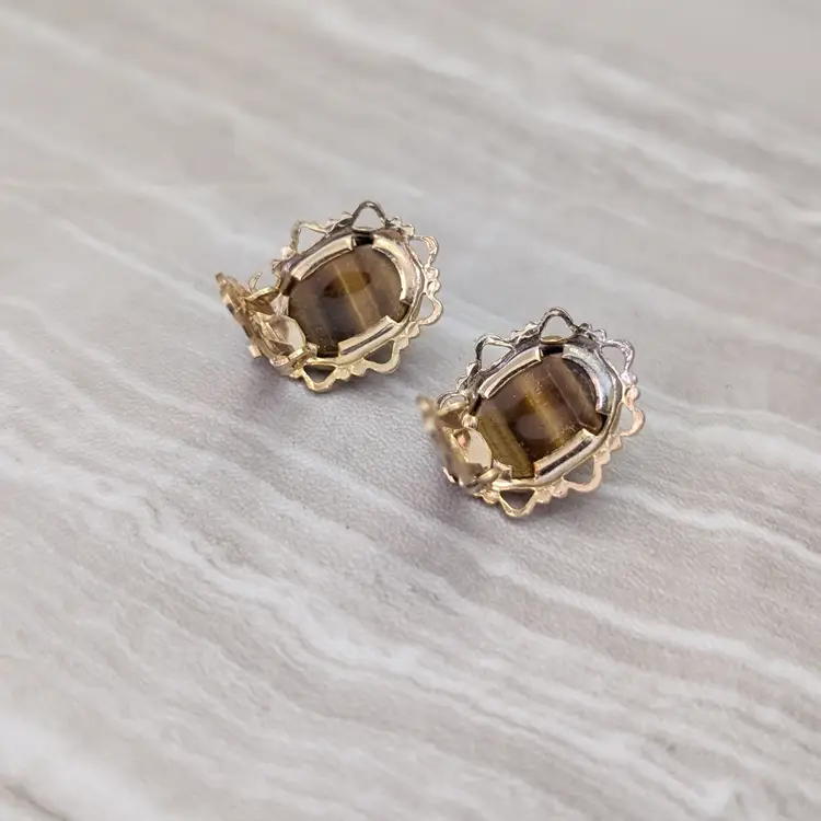 Vintage Clip On Earrings Tigers Eye with Ornate Halo Brown & Gold Tone Earrings
