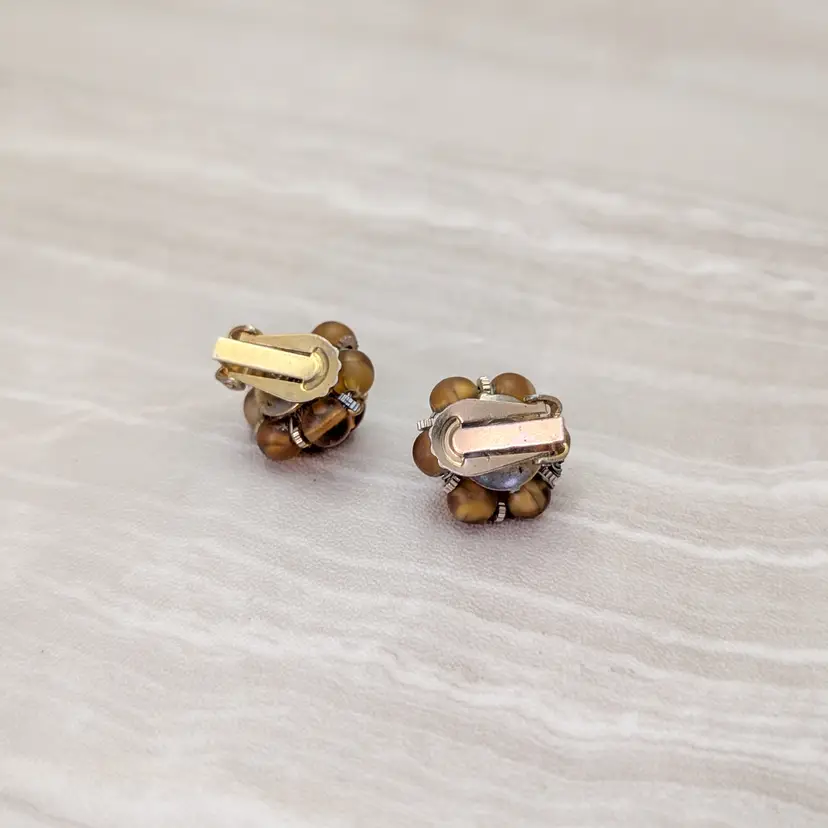 These earrings measure about 0.75". I have not seen clusters quite like this before. Smaller than the typical cluster you see but 3D. Edge beads have a mat finish, while the center is glossy. Some marks to rear. Discoloration to the clips.