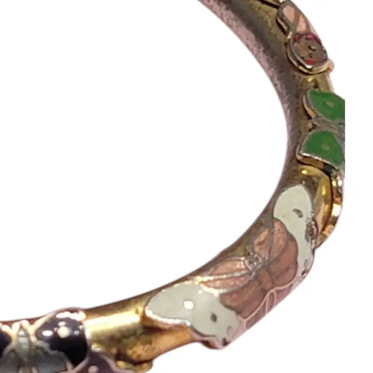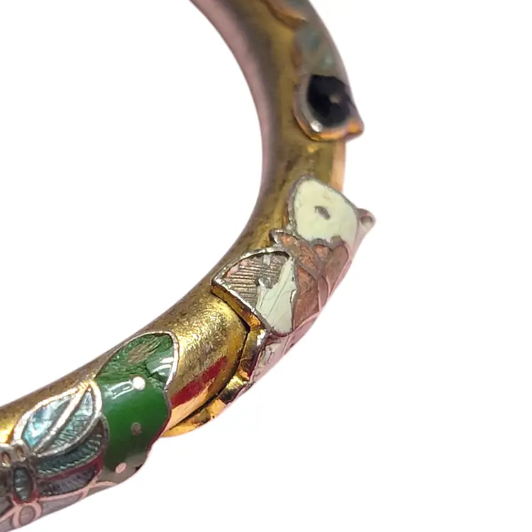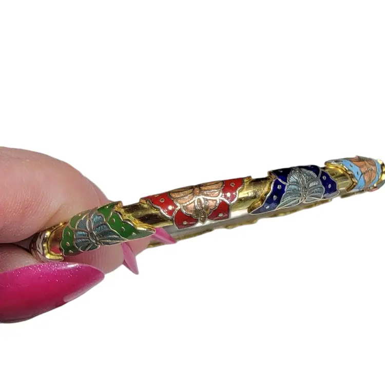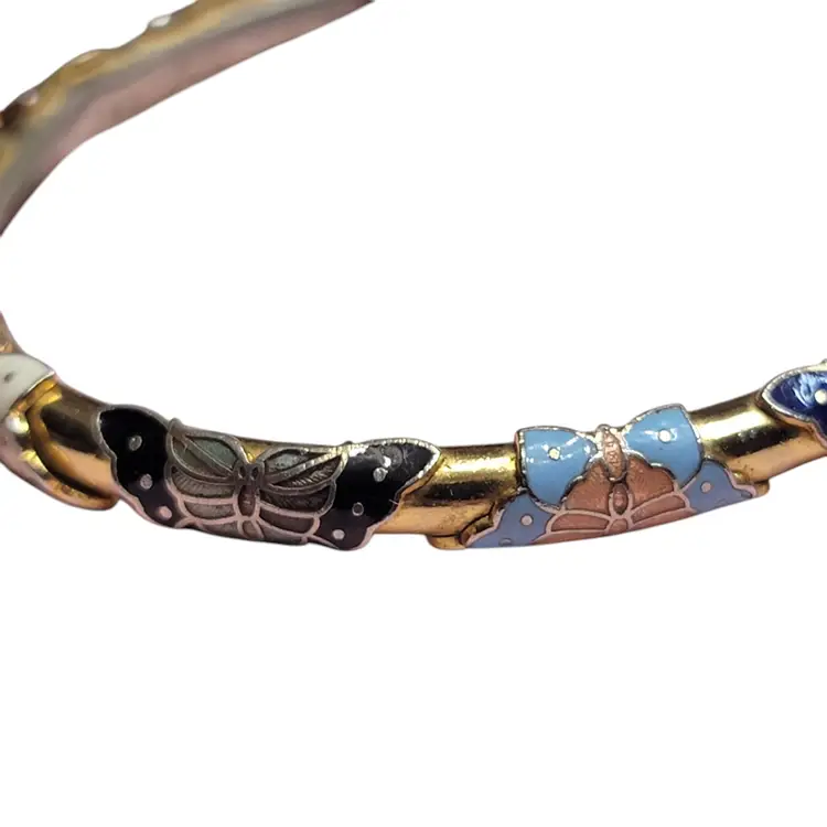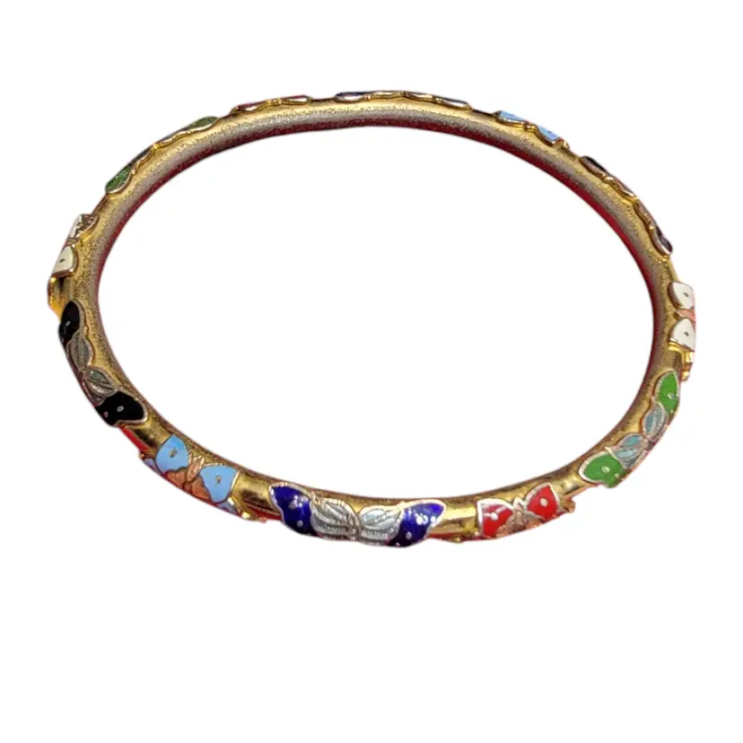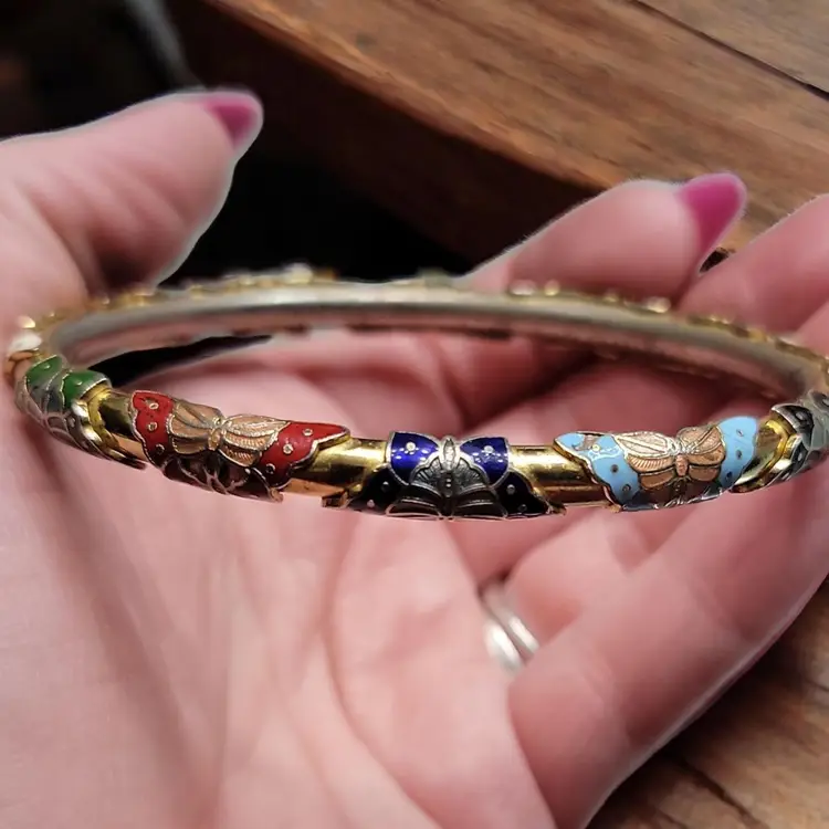 Add a splash of color to your jewelry collection with this stunning vintage cloisonné bangle. Featuring vibrant enamel butterflies in red, blue, and green, this bracelet is a delightful piece of wearable art. Perfect for any vintage lover or butterfly enthusiast, it’s a charming accessory that brings a touch of whimsy to any outfit. Please note, this item is vintage and may show some signs of wear, adding to its unique character.