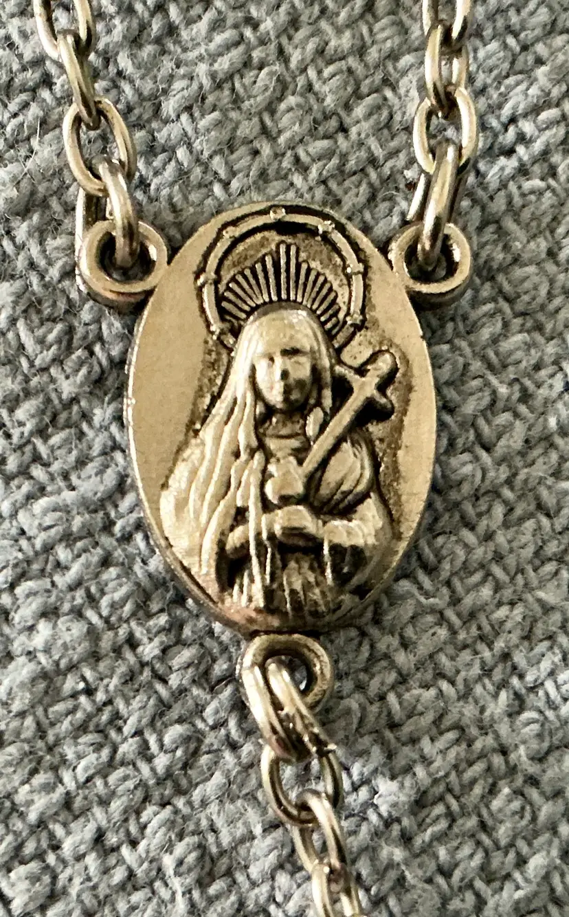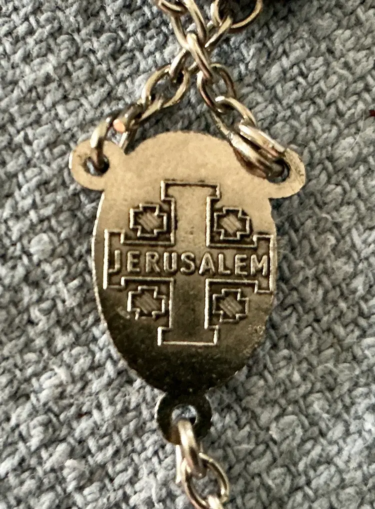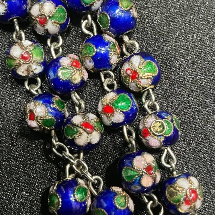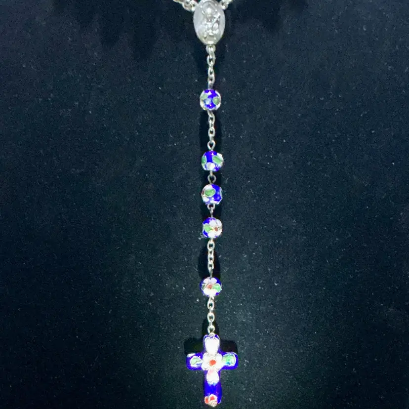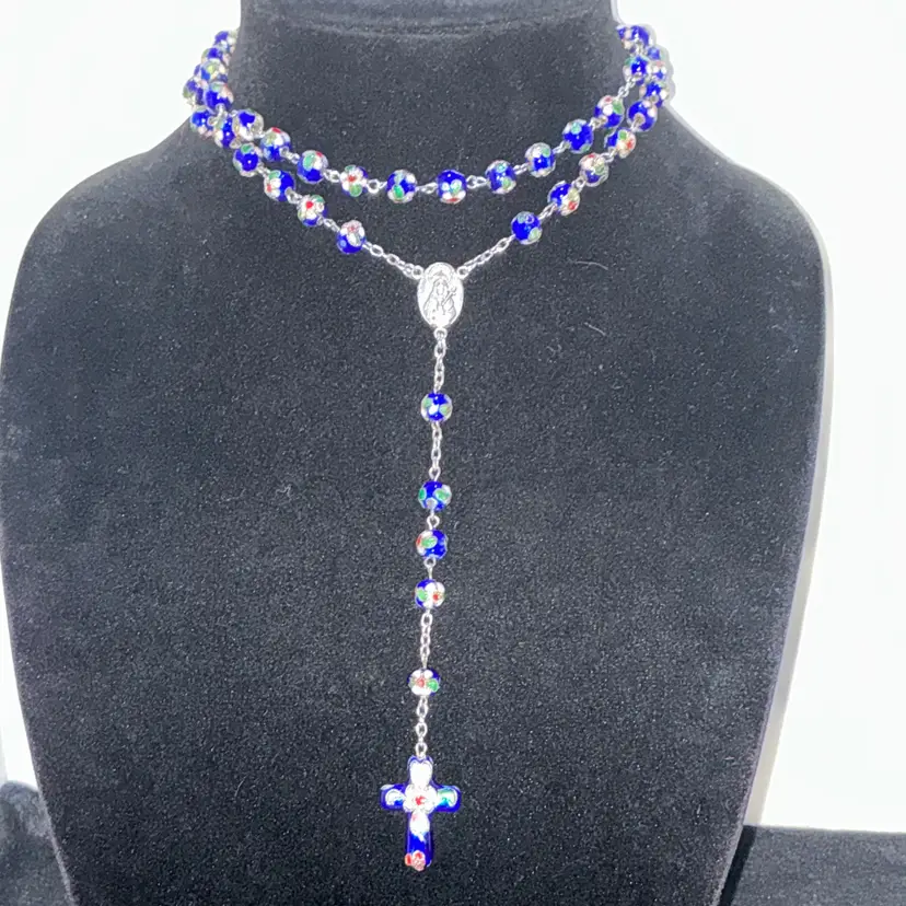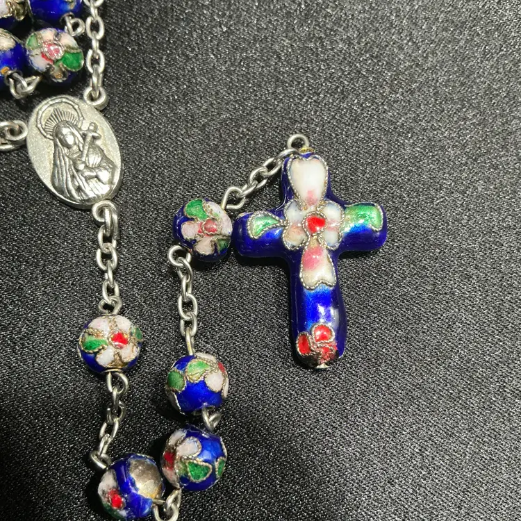 Details: • Vintage cloisonné rosary • Silver-tone metal chain and findings • Bead size approx. 6 mm (¼") • Rosary length approx. 32" • Additional drop with cross approx. 7" • Cross pendant approx. 1" x 0.75" • Connector medallion: Virgin Mary / Jerusalem cross reverse