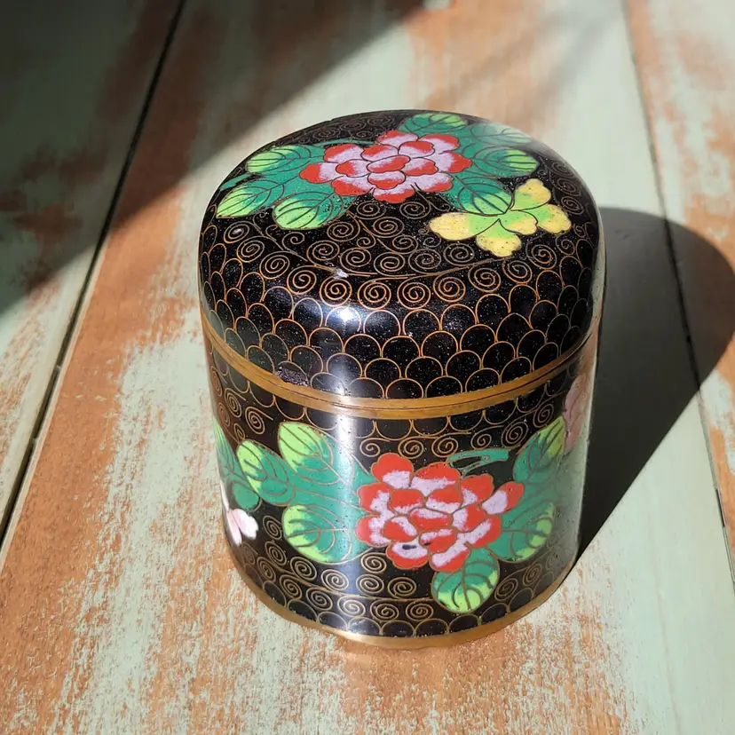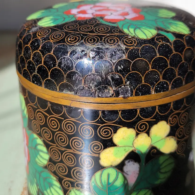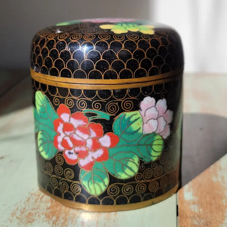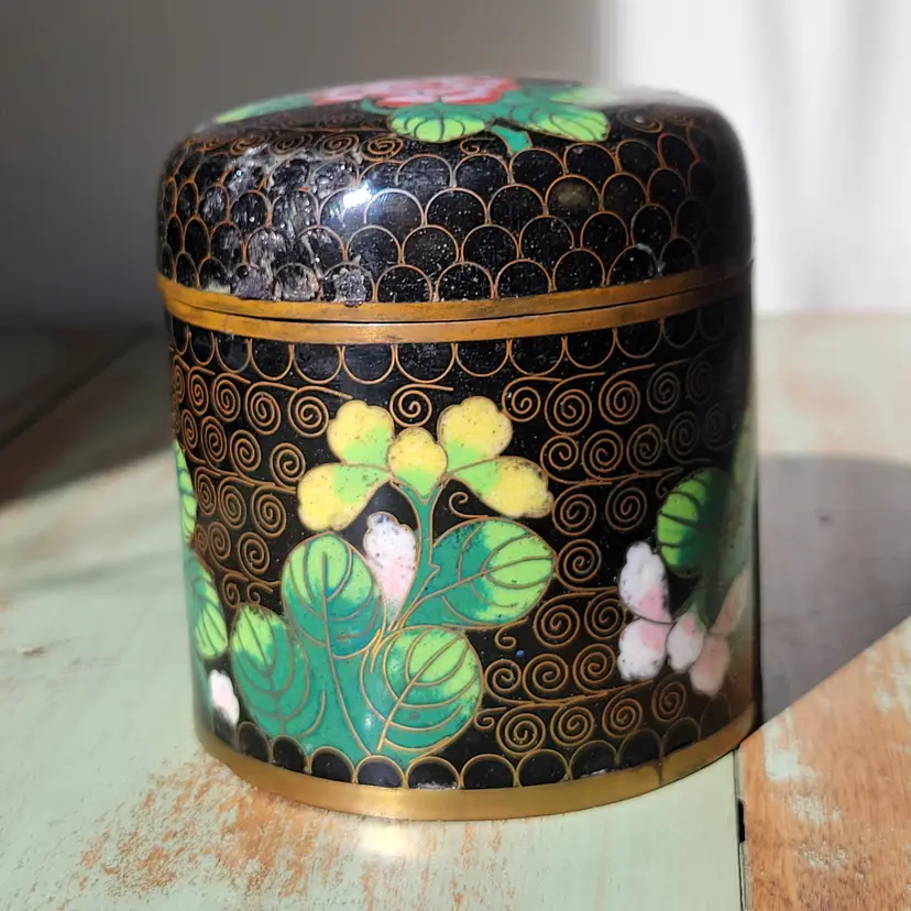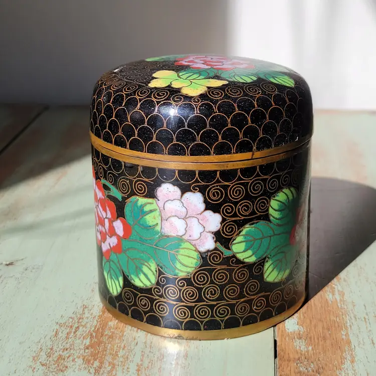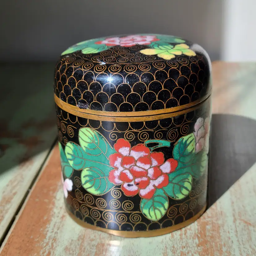 Lovely Vintage Cloisonne Tea Jar Brass Asian Chinese Lidded Floral Container