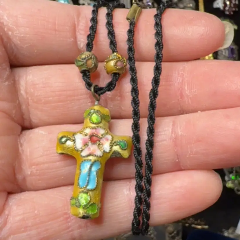 Vintage Cloisonné Yellow Cross Necklace 20”