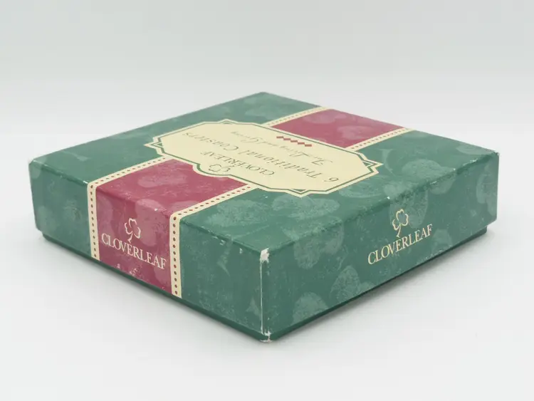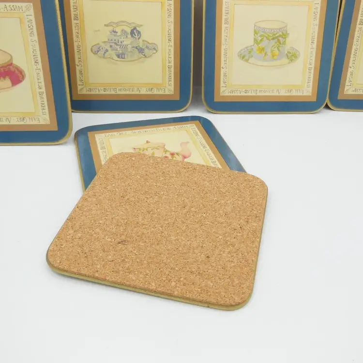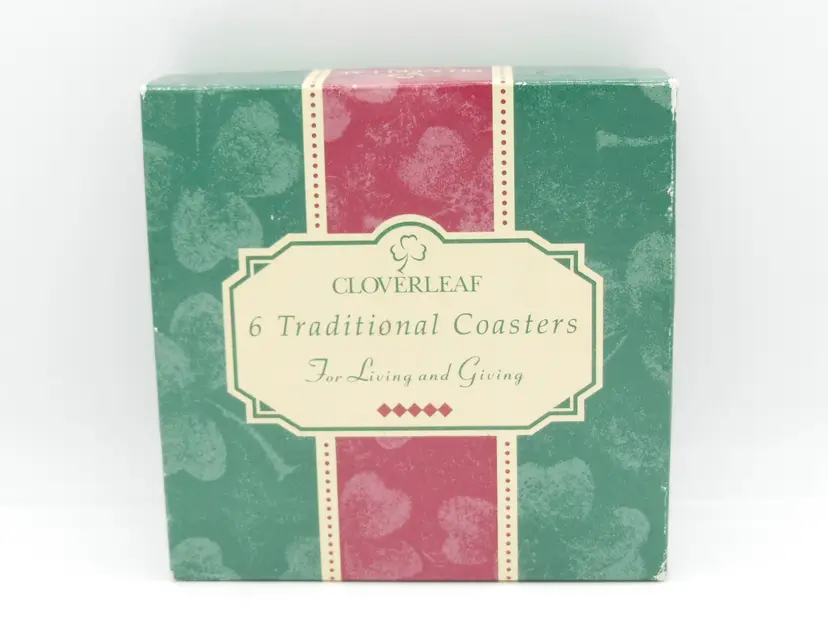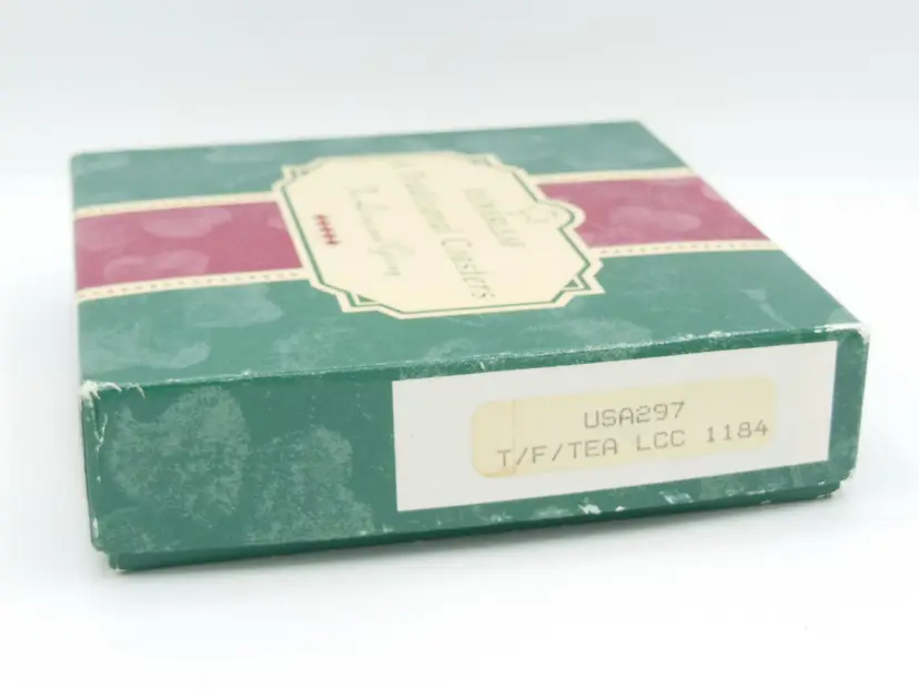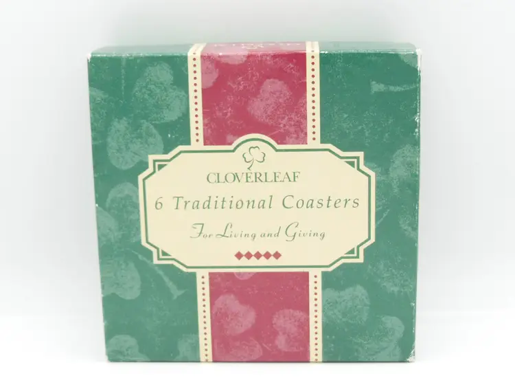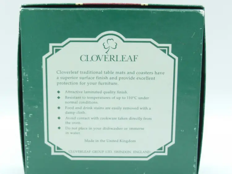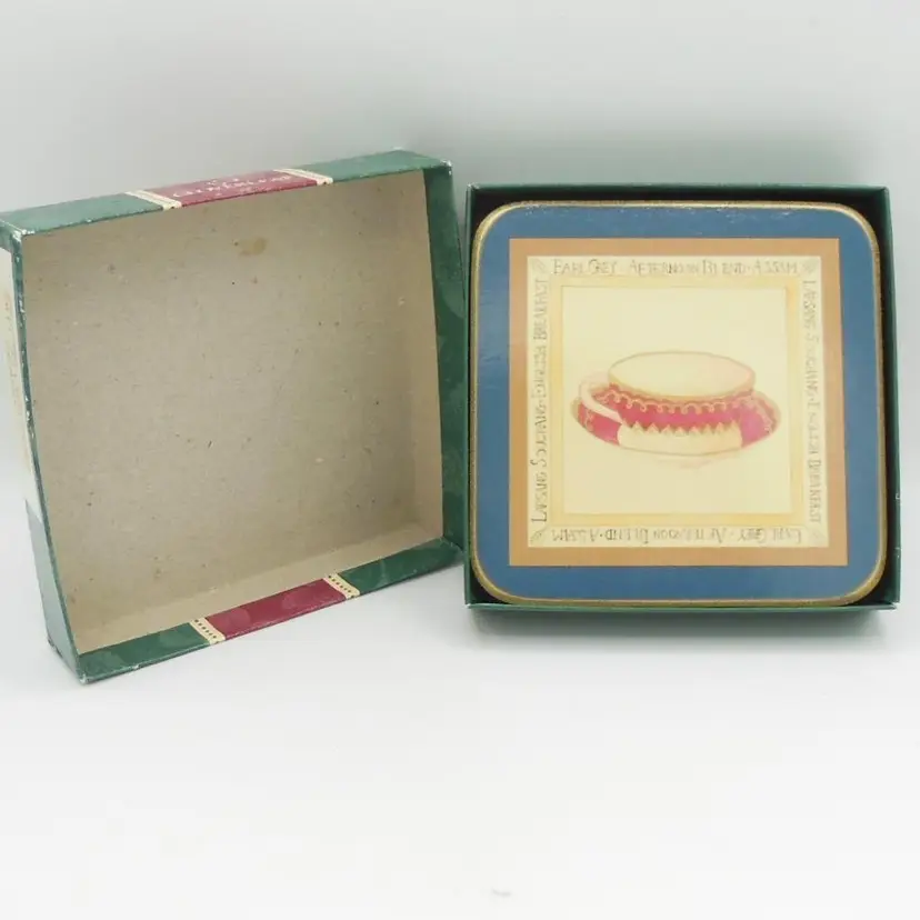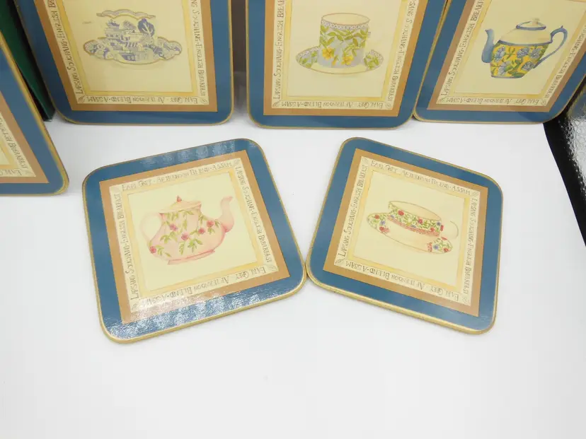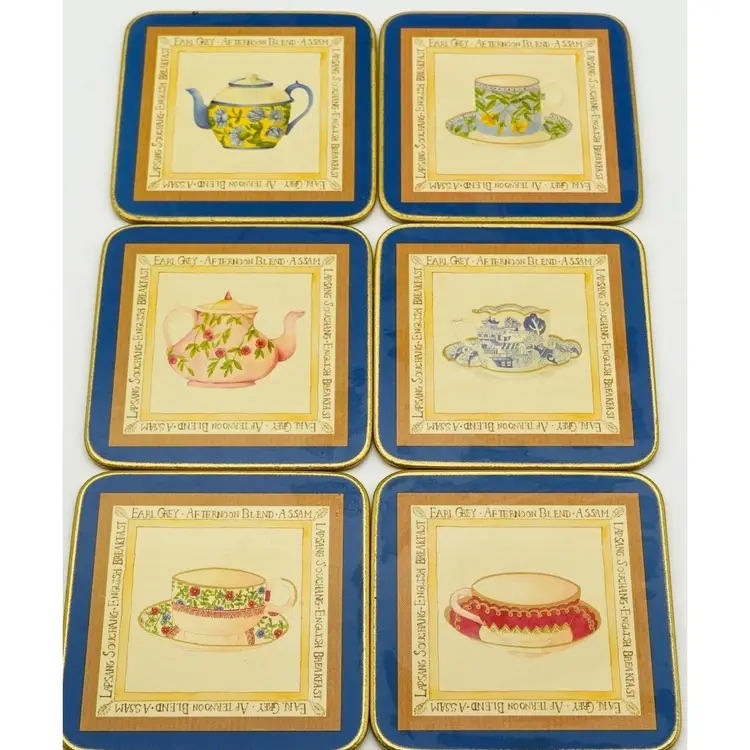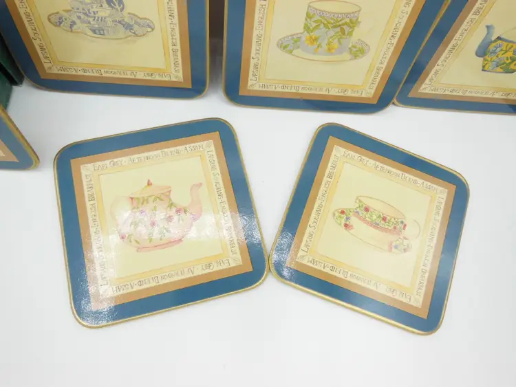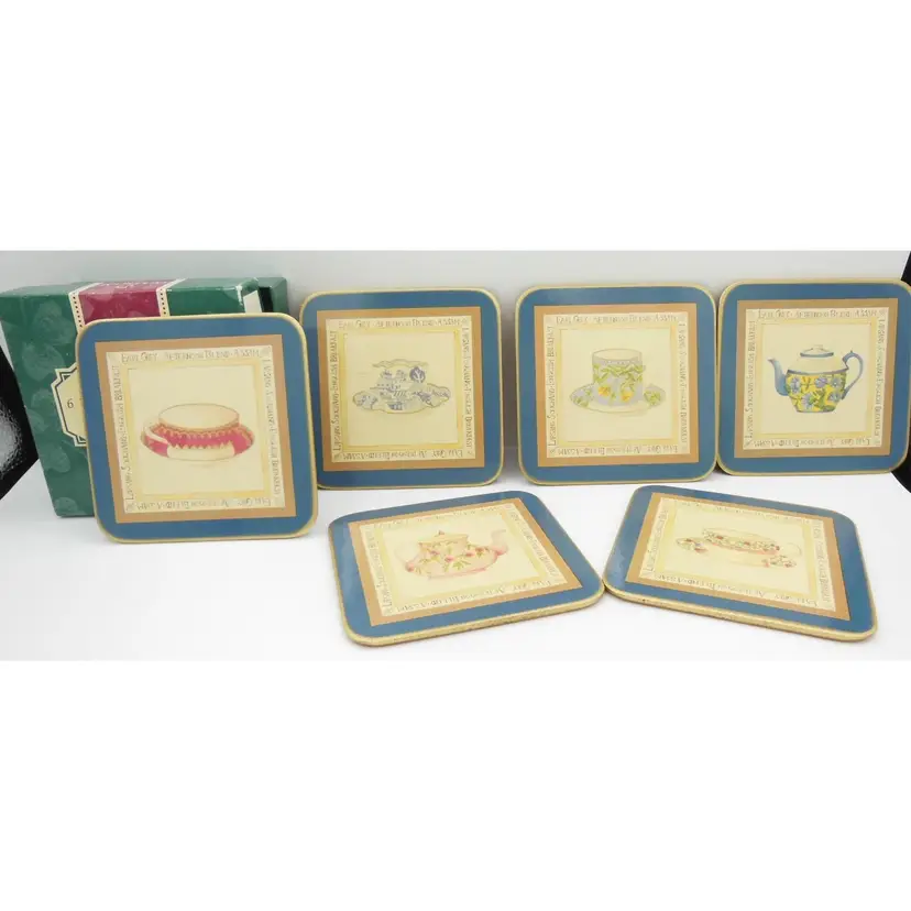 This is a Vintage Cloverleaf England, Boxed Set of 6, 4.0" Square, Laminated and Cork-Backed Coasters, with a Tea Time/Tea Cup Theme. They are in original box and look to be unused-or very gently used.