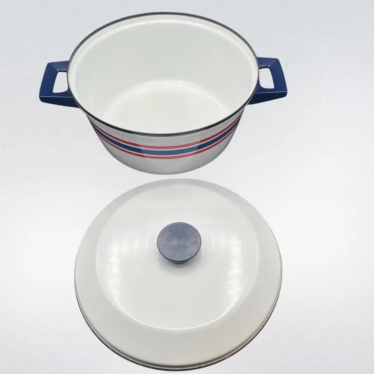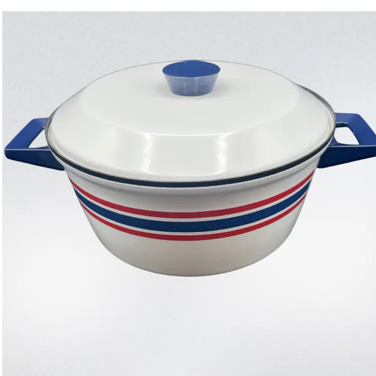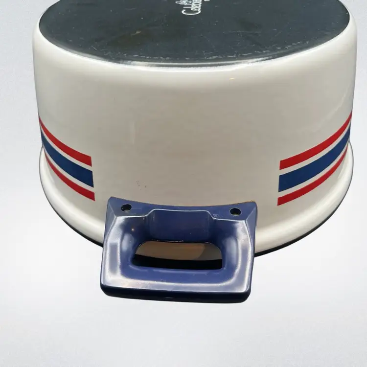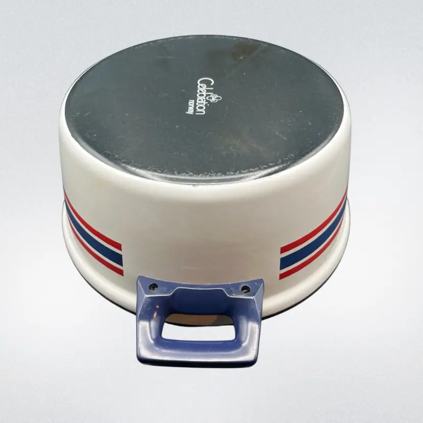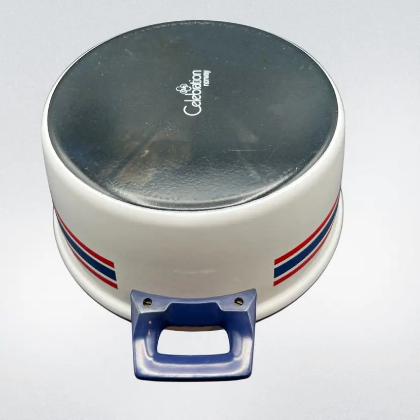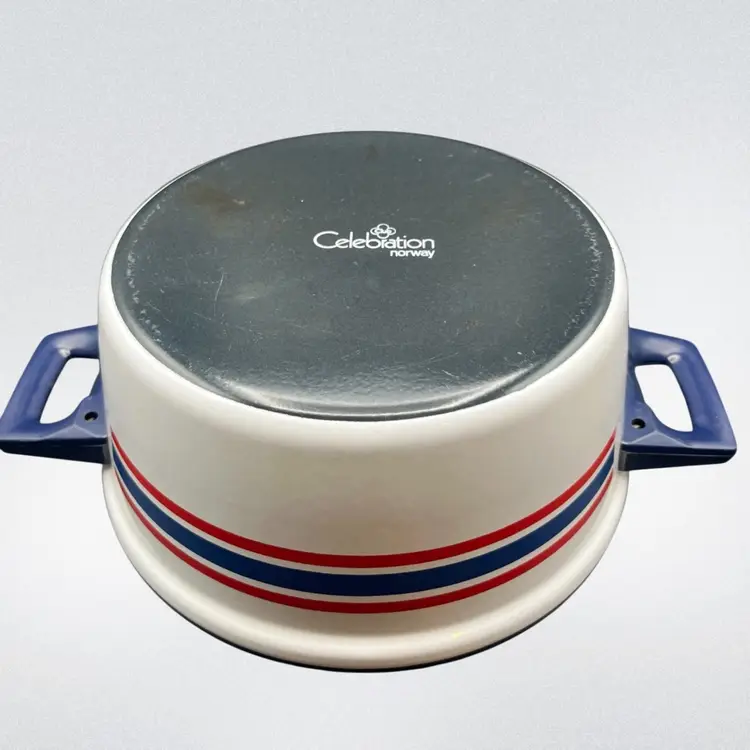 Vintage Club Celebration Cathrineholm Norway Blue Red Stripe Enamel Dutch Oven 10.5” diameter with out handles 4.5” deep In excellent preowned condition. No chipping, cracks or scratching Please see pictures for more detail Thanks for looking🌸