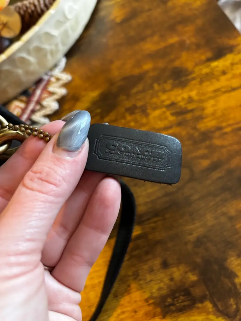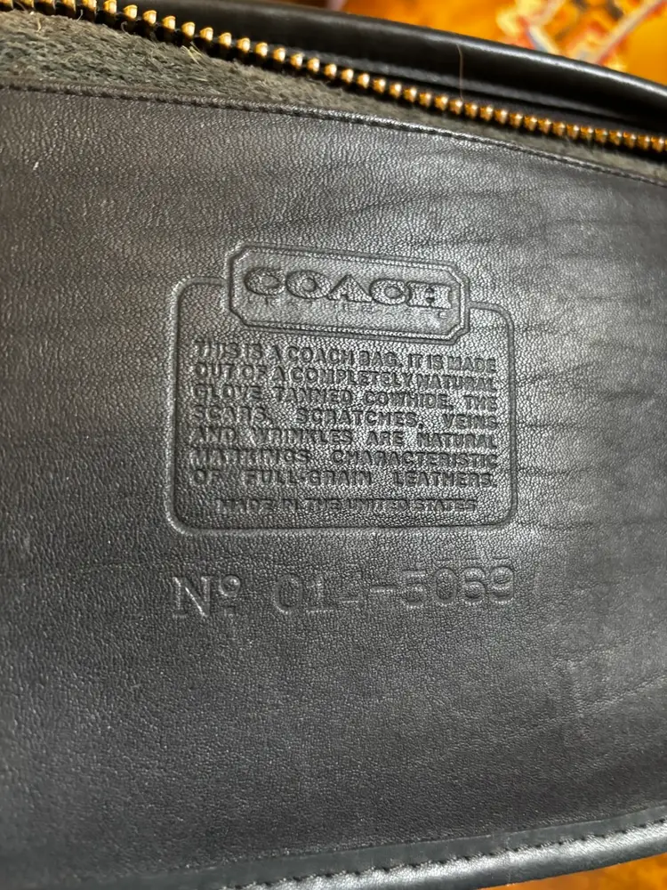 This example is pre-1994 Coach, featuring a slim rectangular profile, zip-top closure, adjustable leather strap, solid brass hardware, and original Coach leather hangtag. Interior includes the classic Coach creed patch.