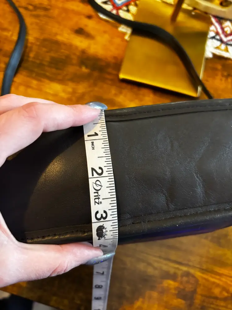 Approx. measurements: 9.5 x 6.5 x 2.5 inches. Strap drop approx. 22 inches.