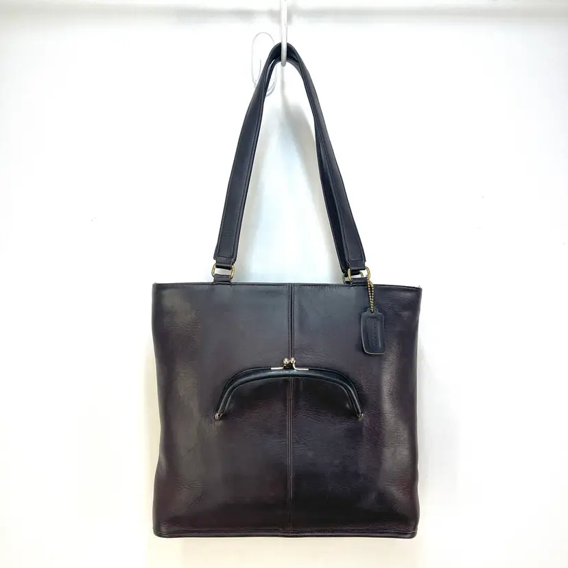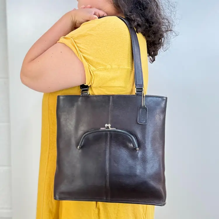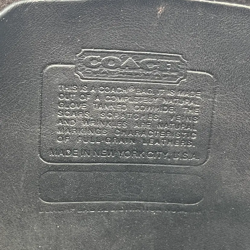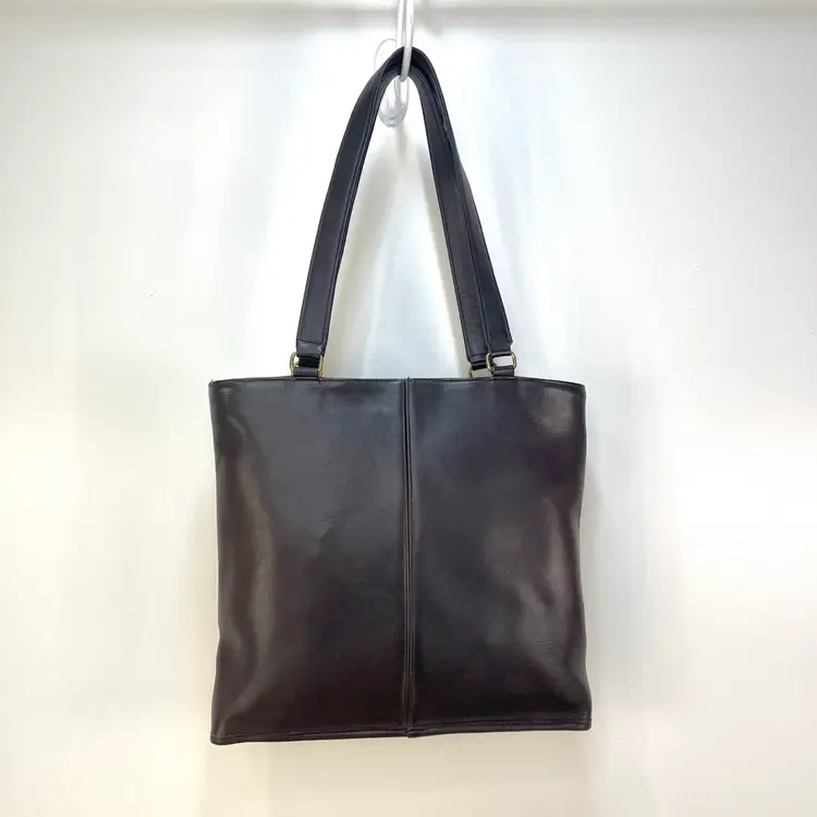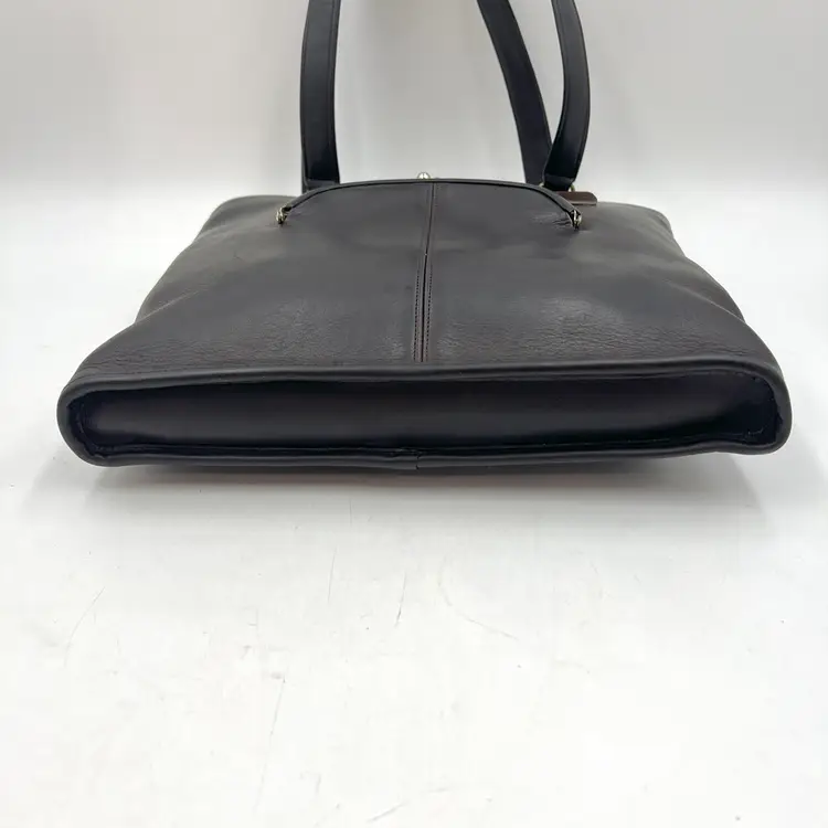 Vintage Coach Skinny Tote 9546 Brown Leather Handbag Purse Bag Size 13 x 11 x 2" This skinny tote features a leather covered frame pocket, which dates it to 1977 at the earliest, when the switch from uncovered frame to covered was made on the pocket. Interior has a hanging slip pocket. Cleaned an conditioned for a new owner.