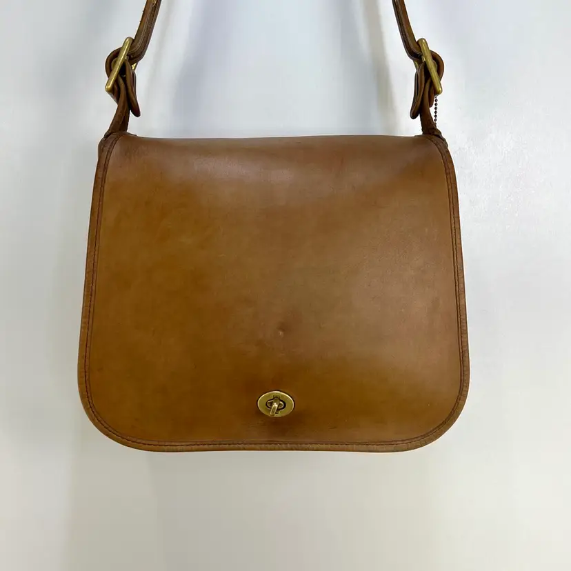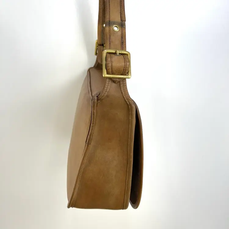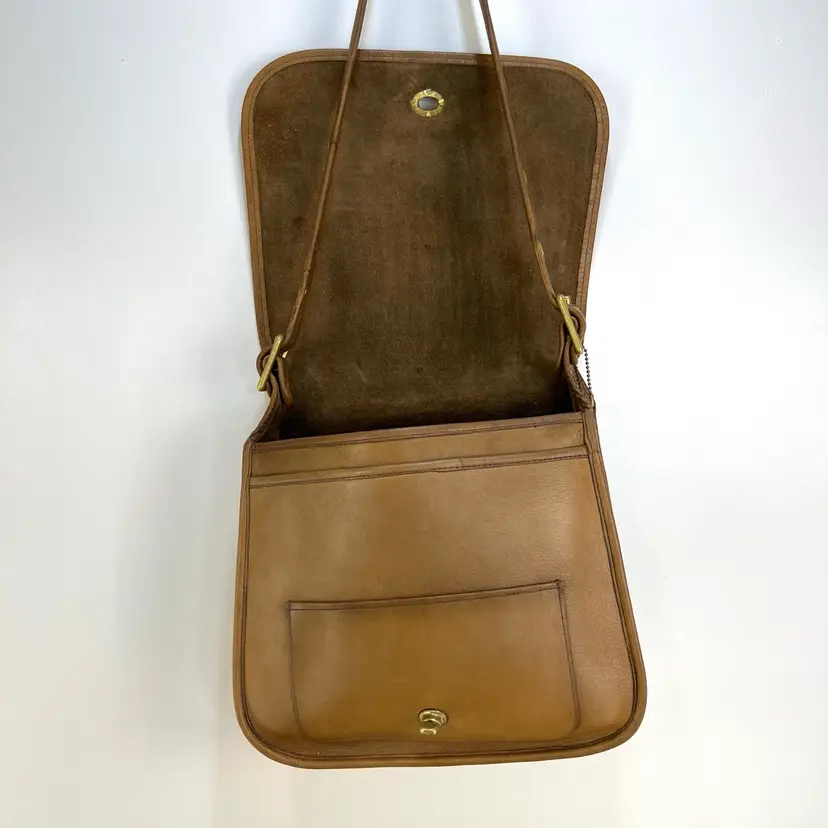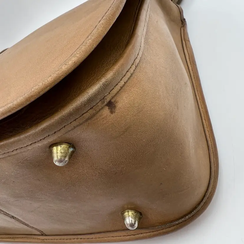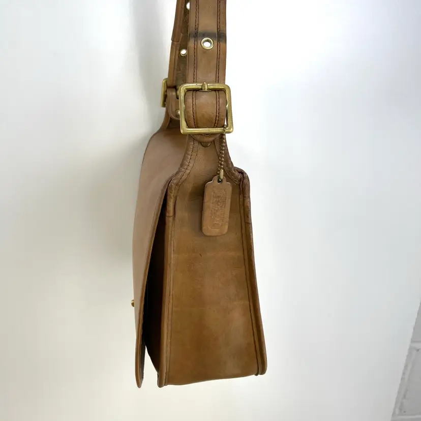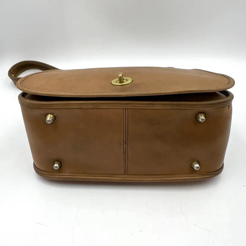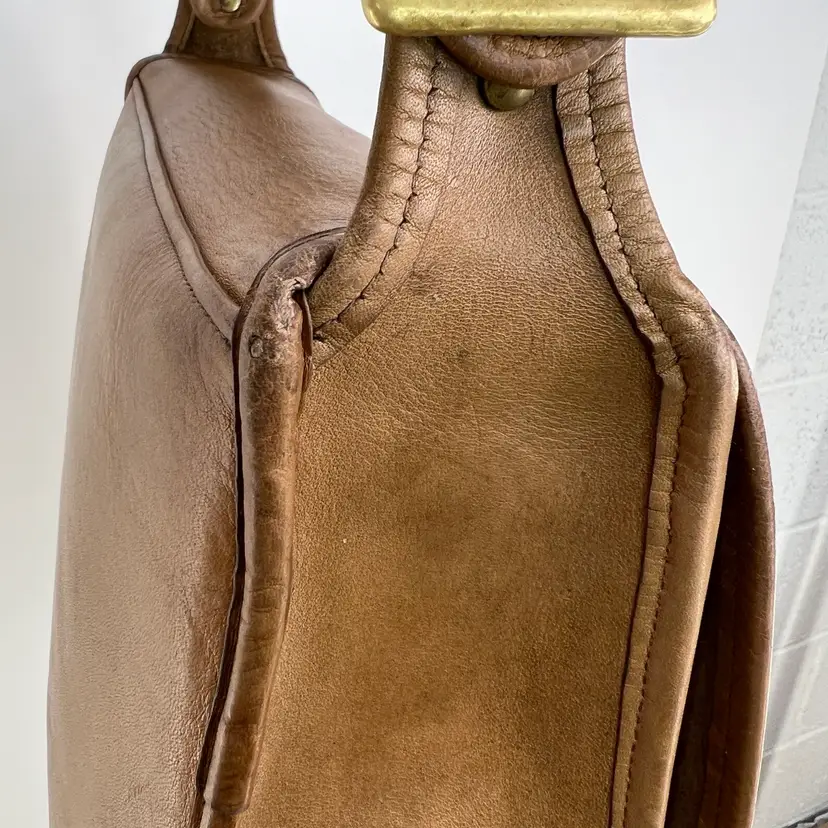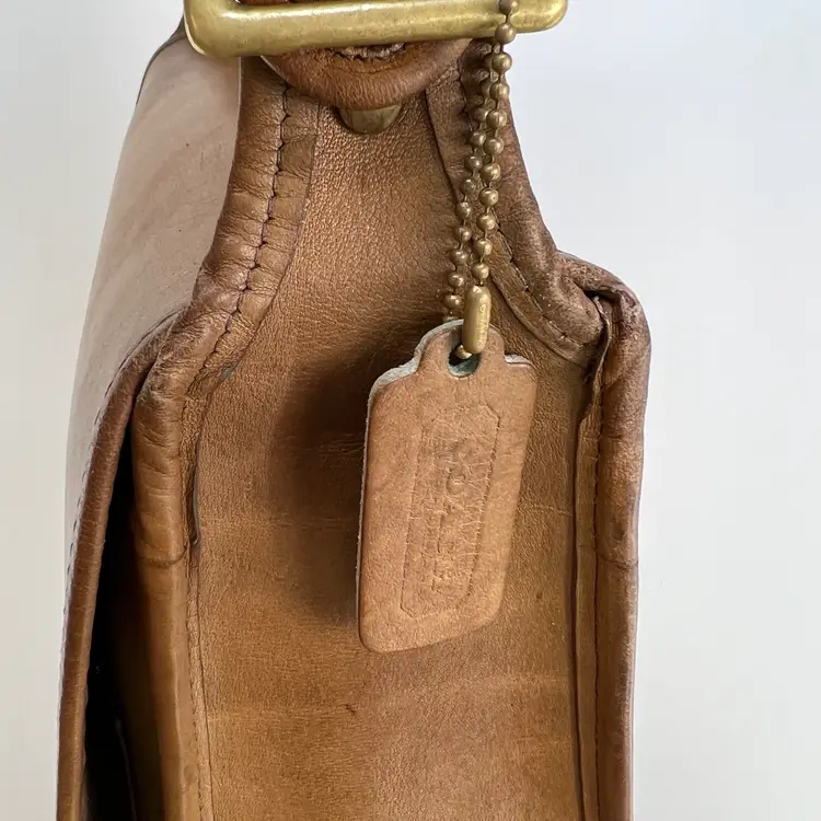 Vintage 80s NYC Coach Stewardess Bag Tan Leather Handbag 9525 Purse Crossbody Size 11.5 x 8.5 x 4” Preowned item in excellent condition. Repairs have been made to the binding where the buckles attach. There is also a small spot of discoloration near the bottom. Inside there are some light pen marks on the bottom. Has been cleaned and conditioned for a new owner. Crafted from high-quality leather, this bag is built to last and will only improve with age if properly maintained. Made in the USA. Pre 1994 creed stamp.