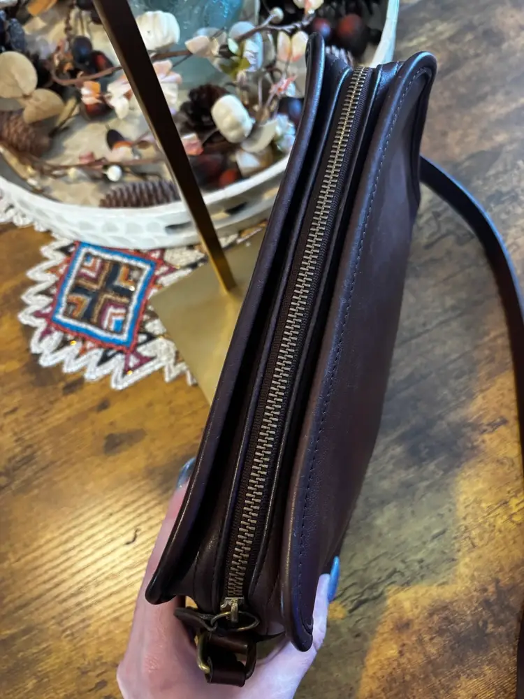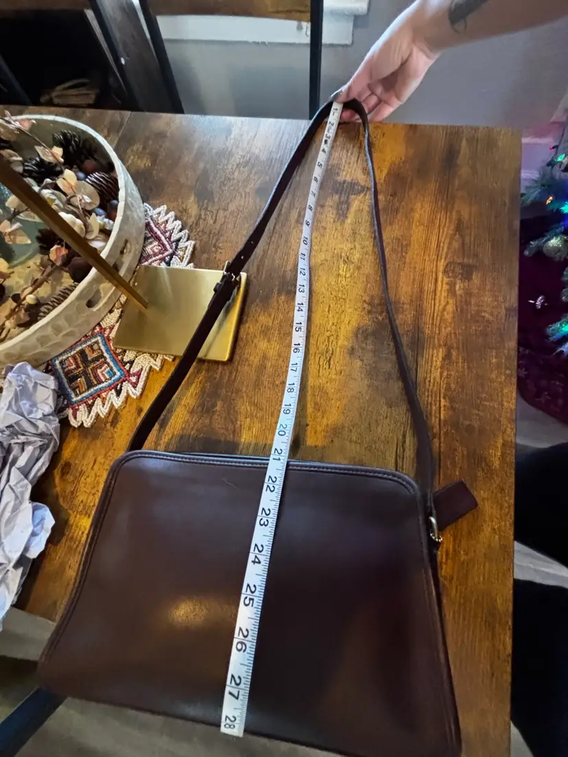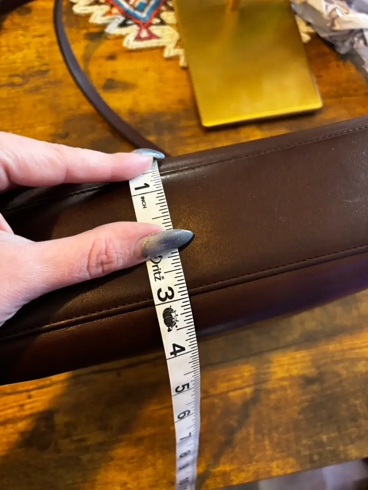 Details: • Year: 1999 • Style: Sutton shoulder bag • Color: Mahogany brown • Material: Genuine leather • Hardware: Brass • Closure: Top zip • Adjustable shoulder strap • Clean interior