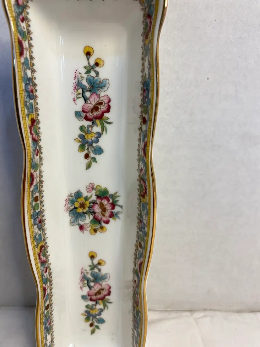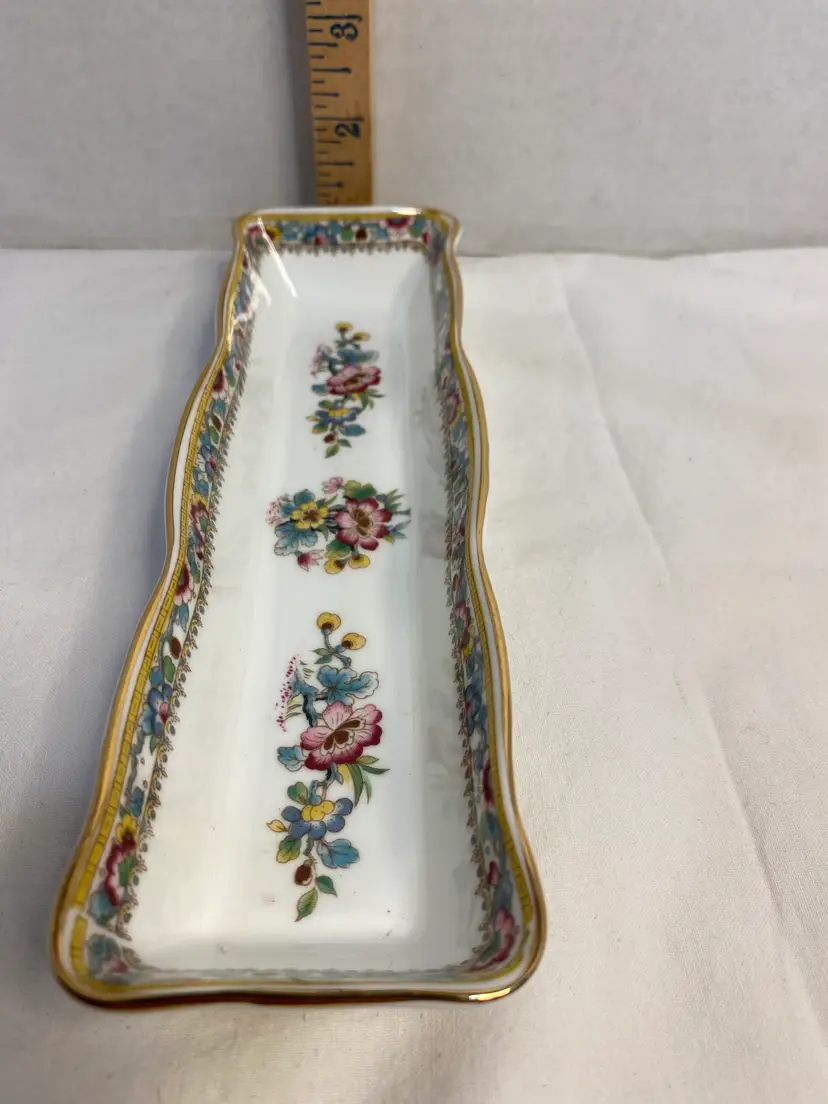 Vintage Coalport Bone China Trinket Dish. Made in England, Ming Rose Design. No chips or cracks, in great condition. Measurements are 8 1/2” long x 2 1/4 wide x 1” high.