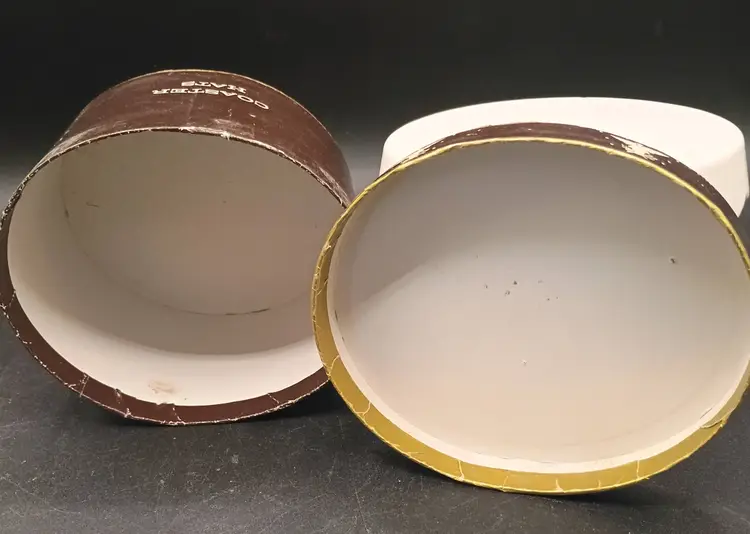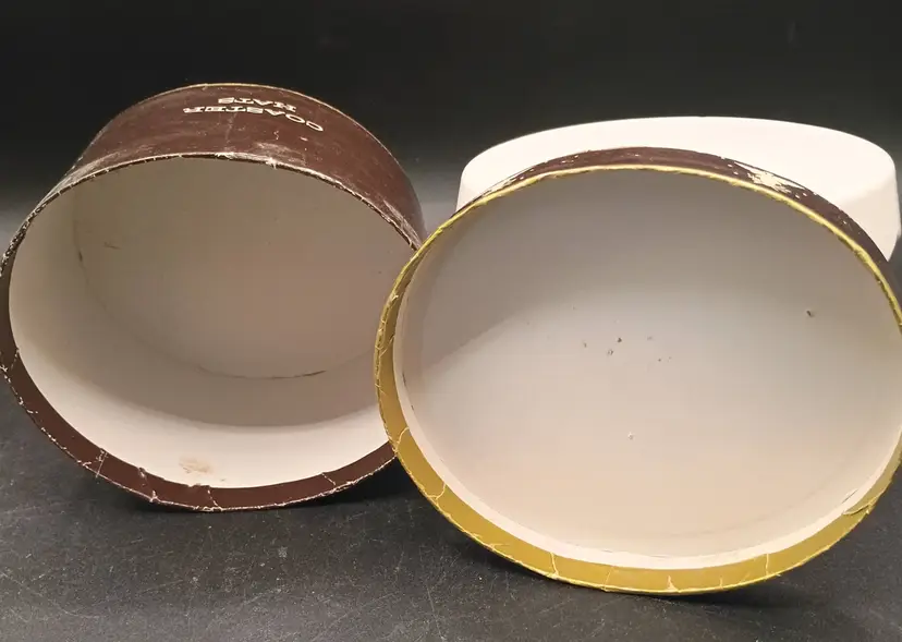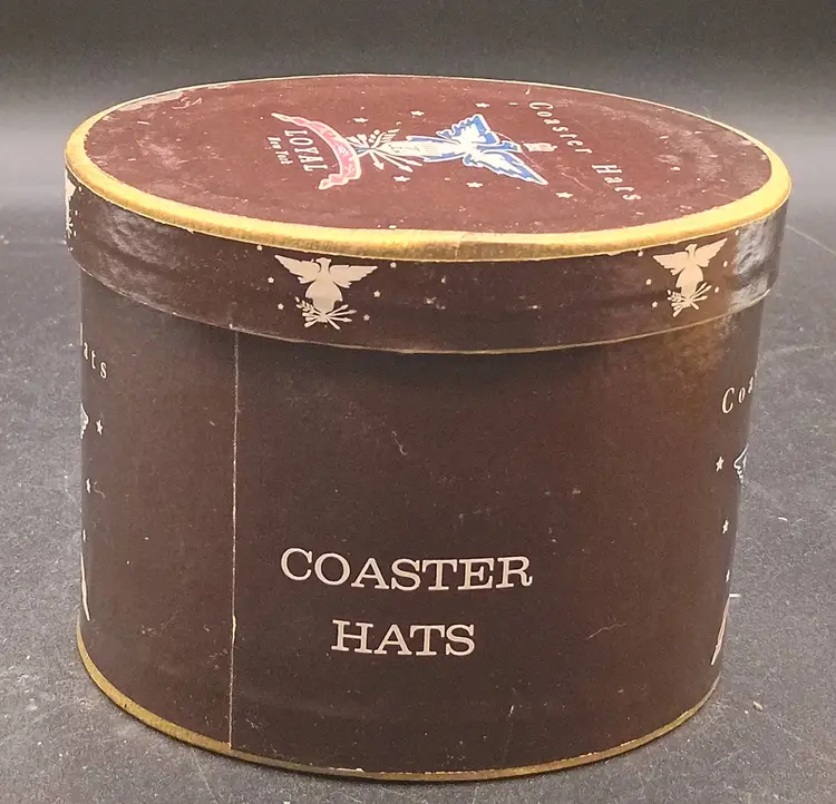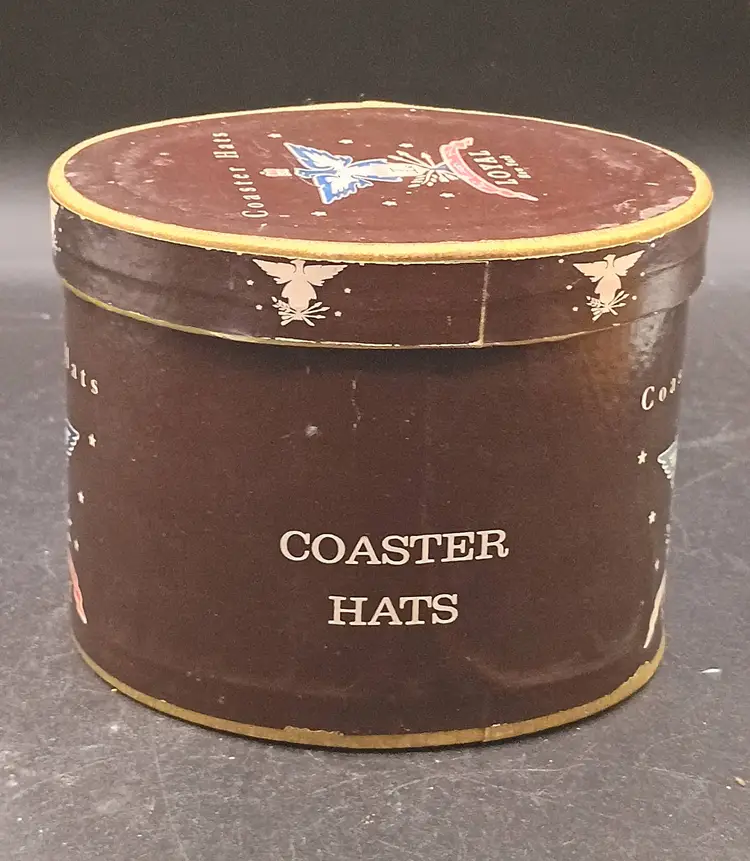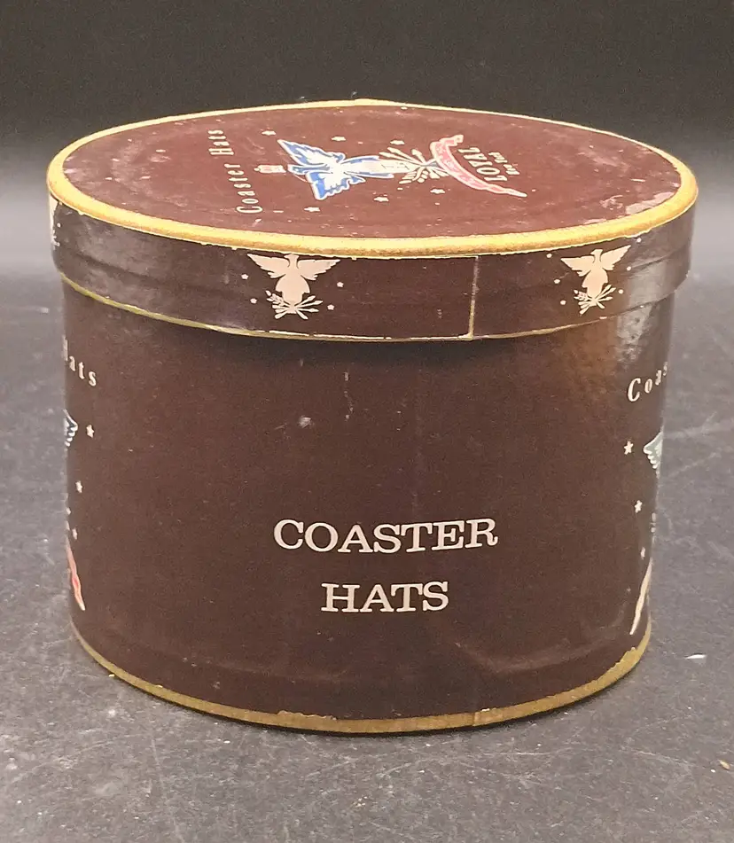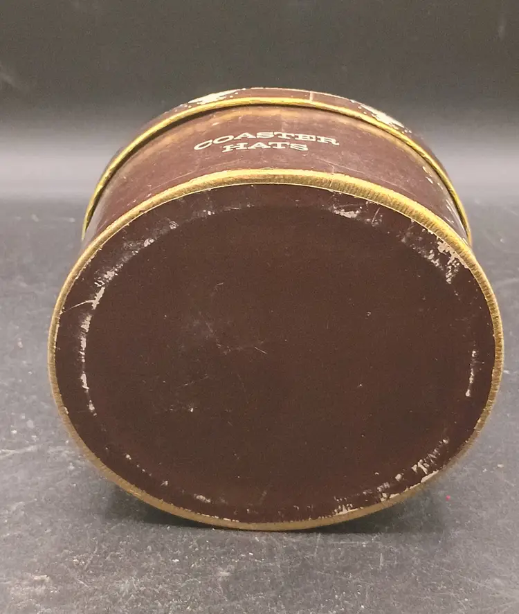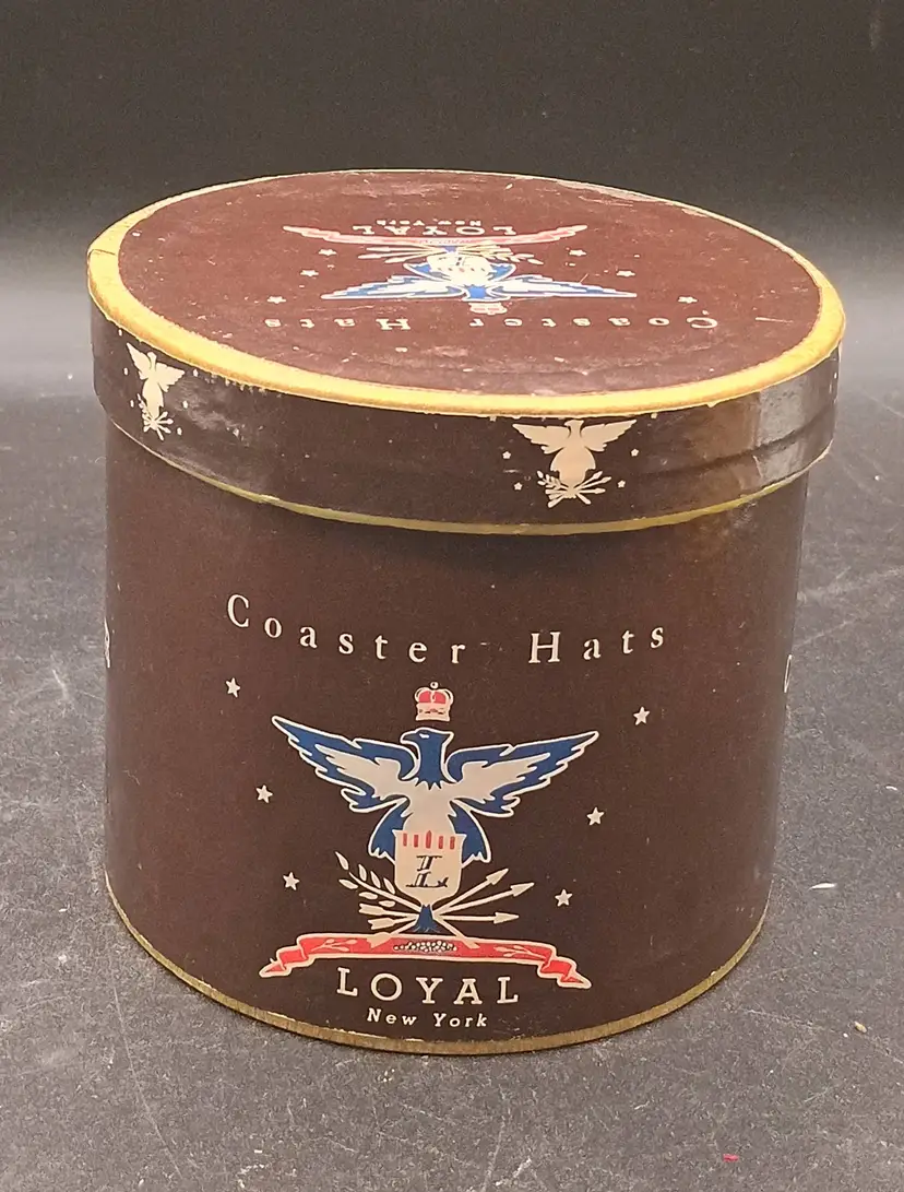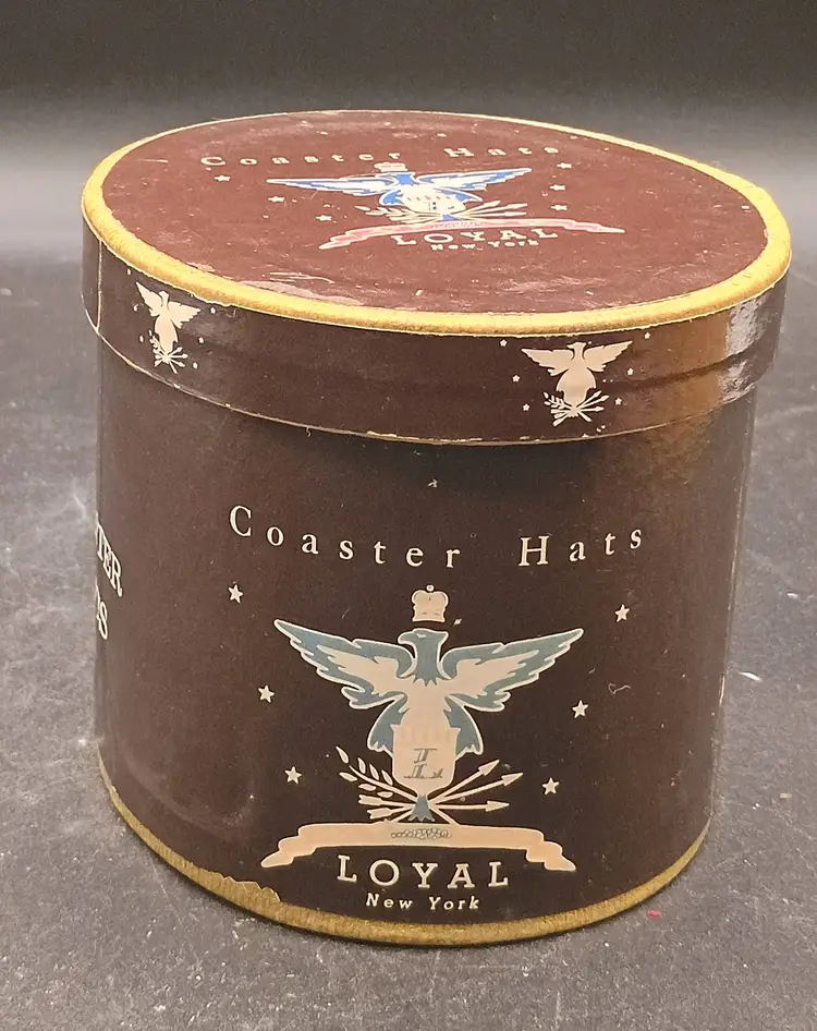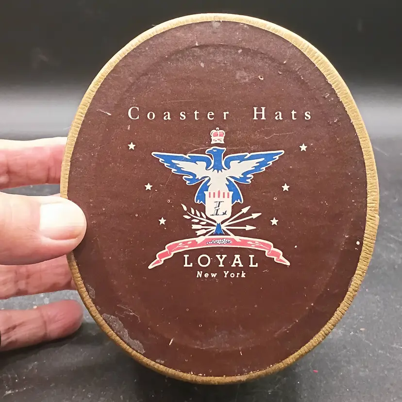 The Vintage Coaster Hats Loyal New York Mini Hat Box is a charming oval-shaped cardboard box in a rich brown color. Perfect for storing miniature hats or as a unique gift card box, this collectible item adds a touch of nostalgia to any space. The detailed design and quality material make it a decorative piece that is both functional and stylish.