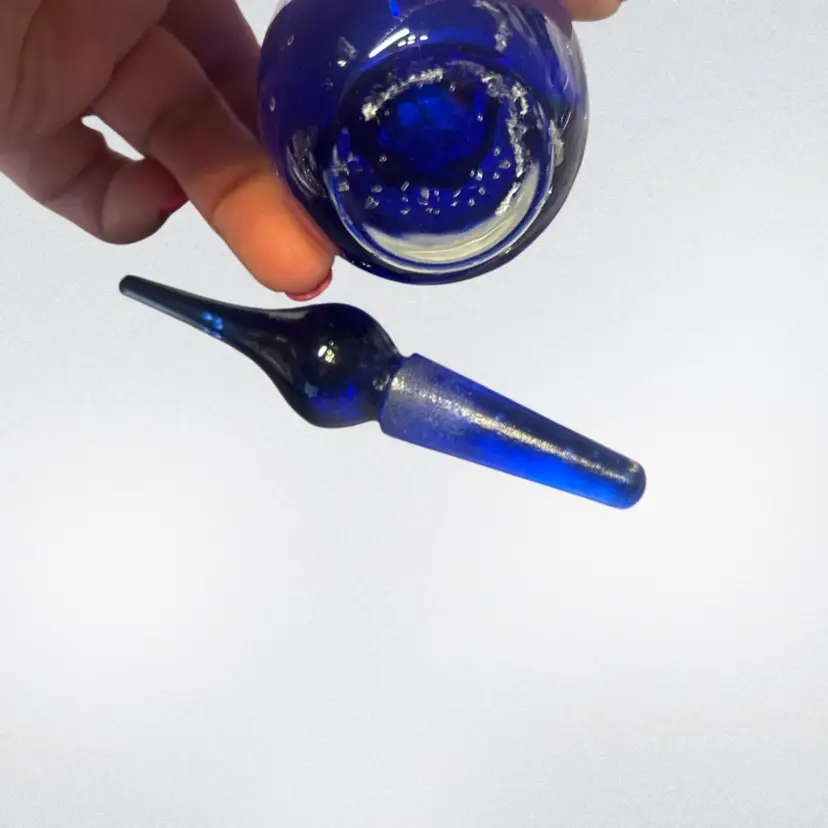 The bottle is topped with a matching cobalt blue glass stopper, ground to fit snugly, adding to both its elegance and functionality. The softly rounded form and elongated stopper give this piece a refined, sculptural presence that displays beautifully even without use.