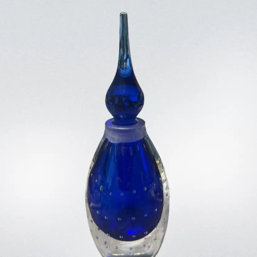 Details • Material: Art glass • Color: Cobalt blue with clear glass overlay • Height: Approximately 6 inches • Width: Approximately 2 inches • Condition: Very good vintage condition; stopper included and fits well; light shelf wear consistent with age; no chips or cracks observed • Era: Mid to late 20th century